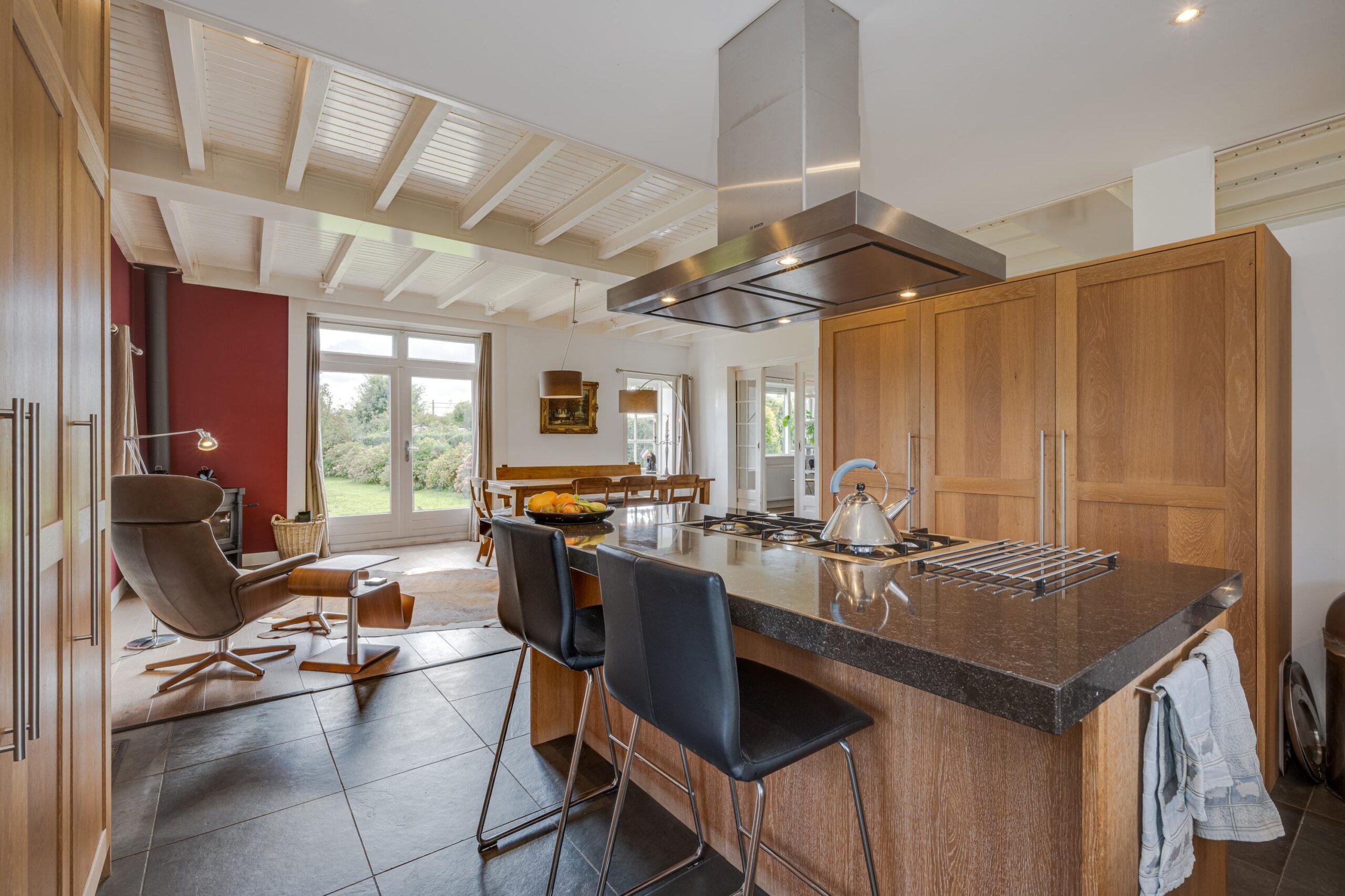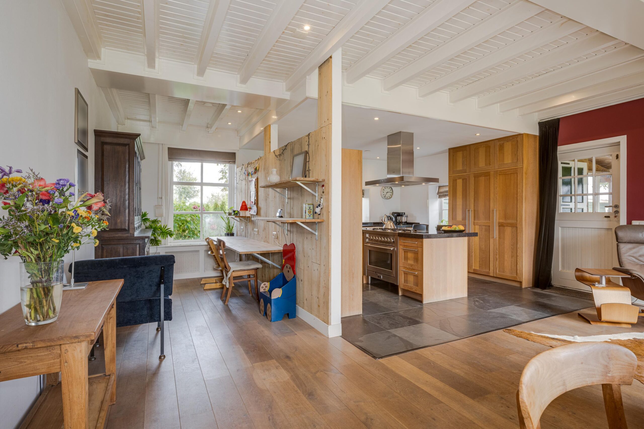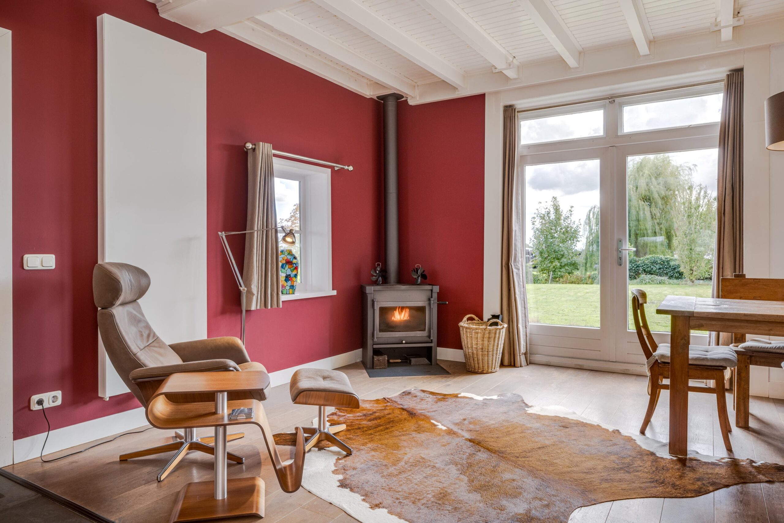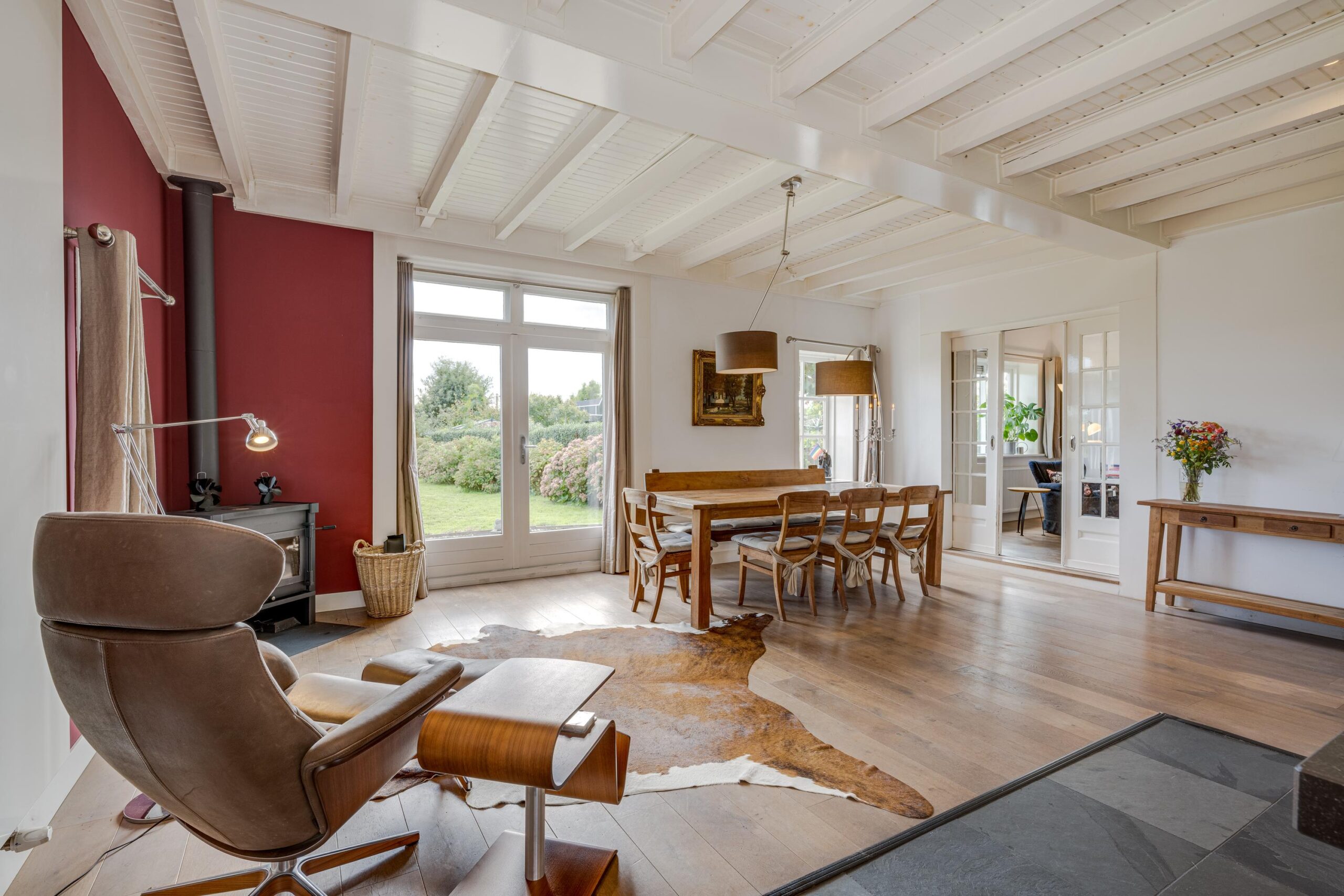 • Ruime woonkamer met houtenvloer, balkenplafond, houtkachel en openslaande deuren
