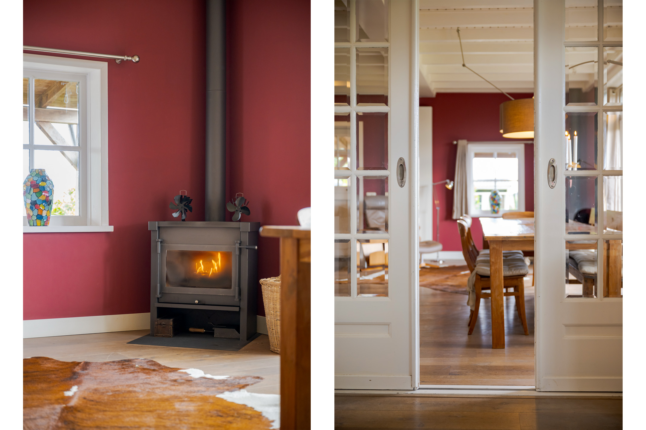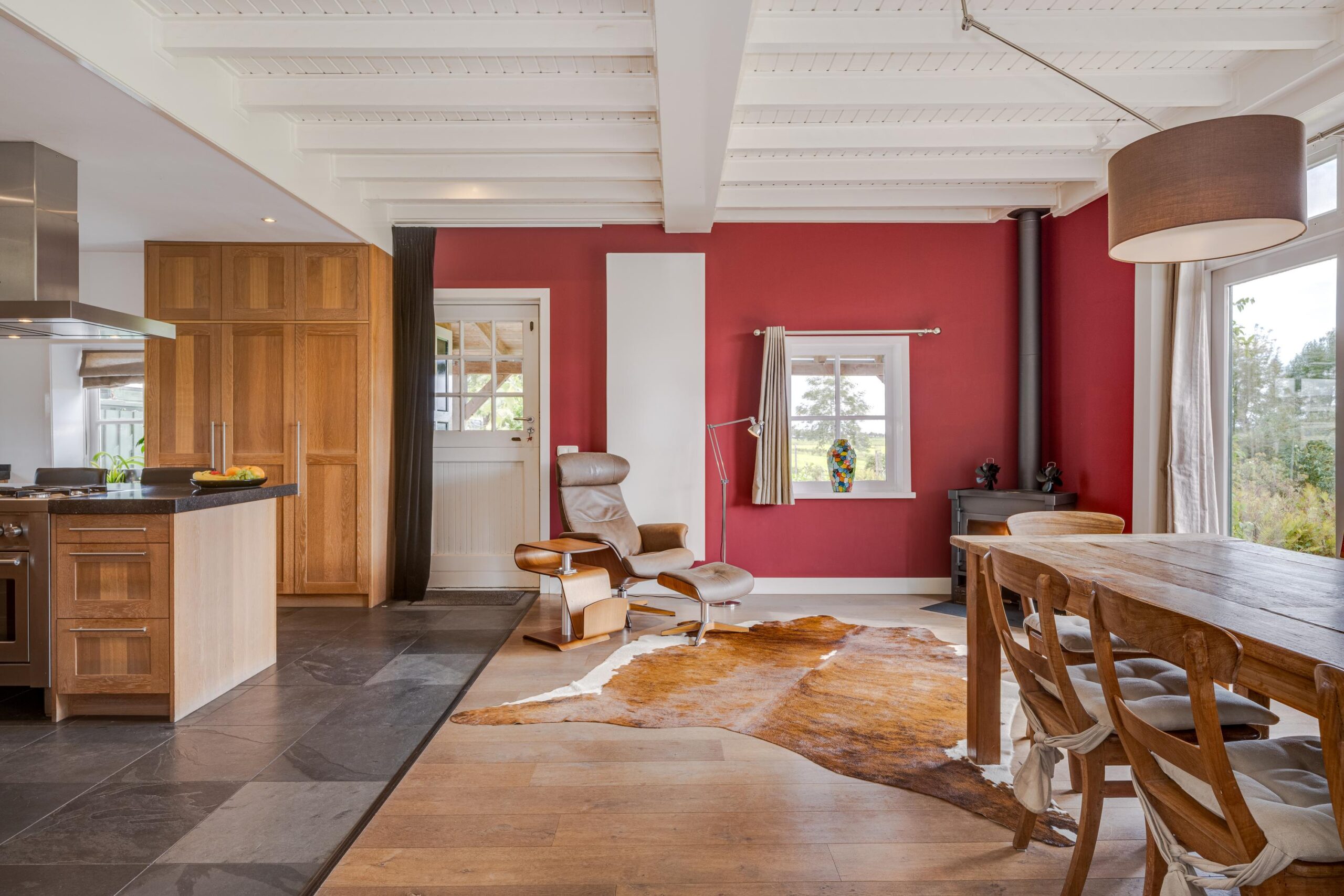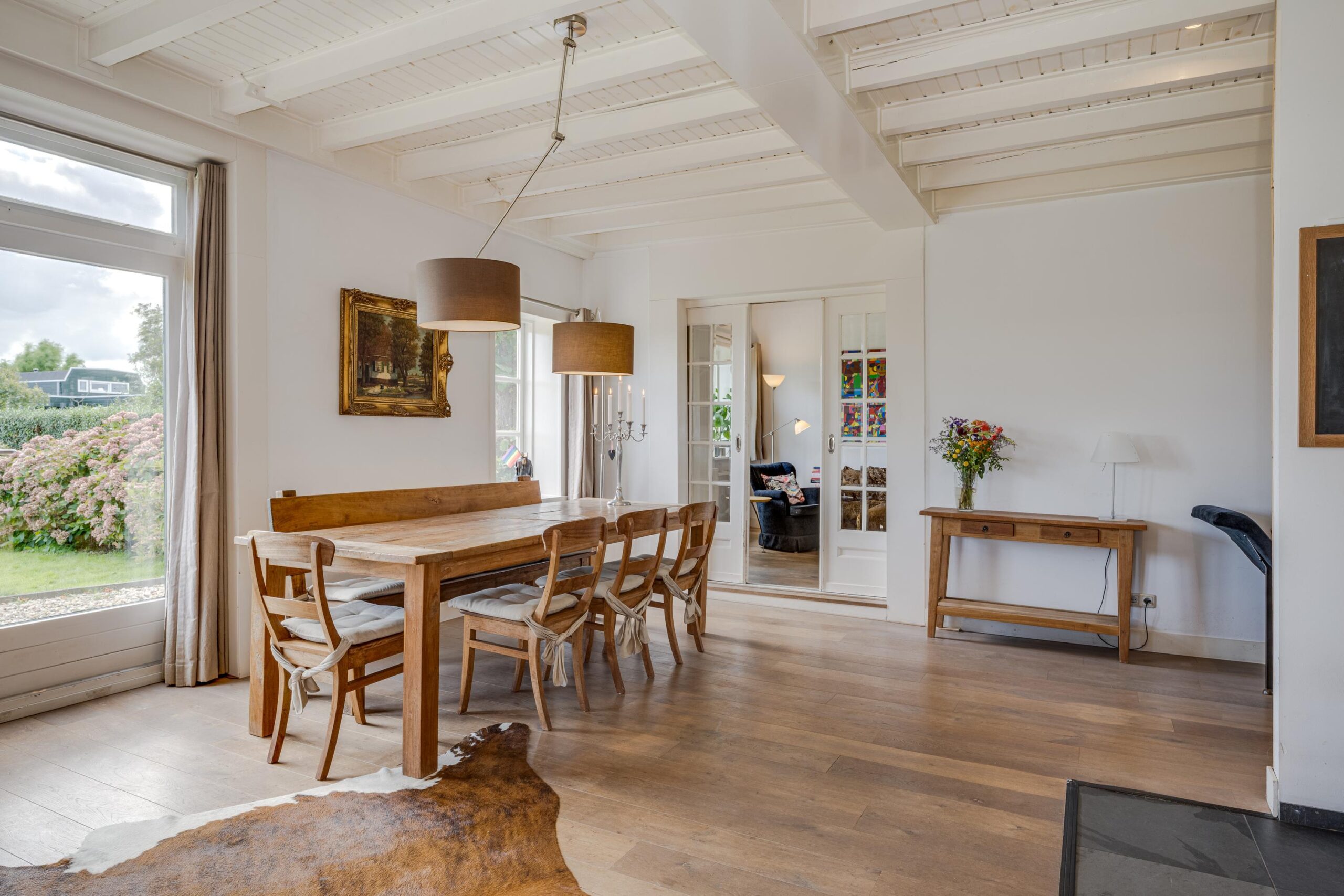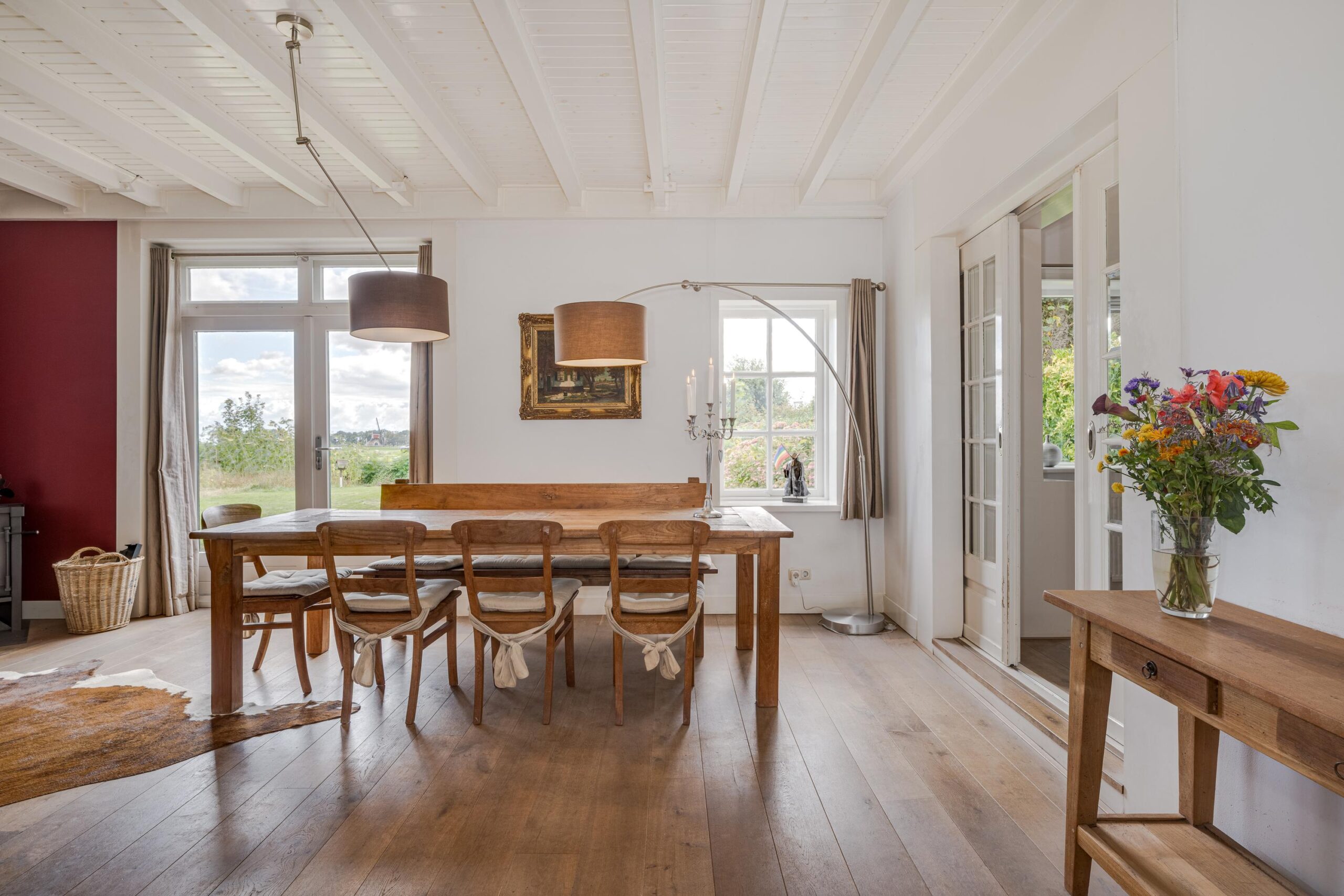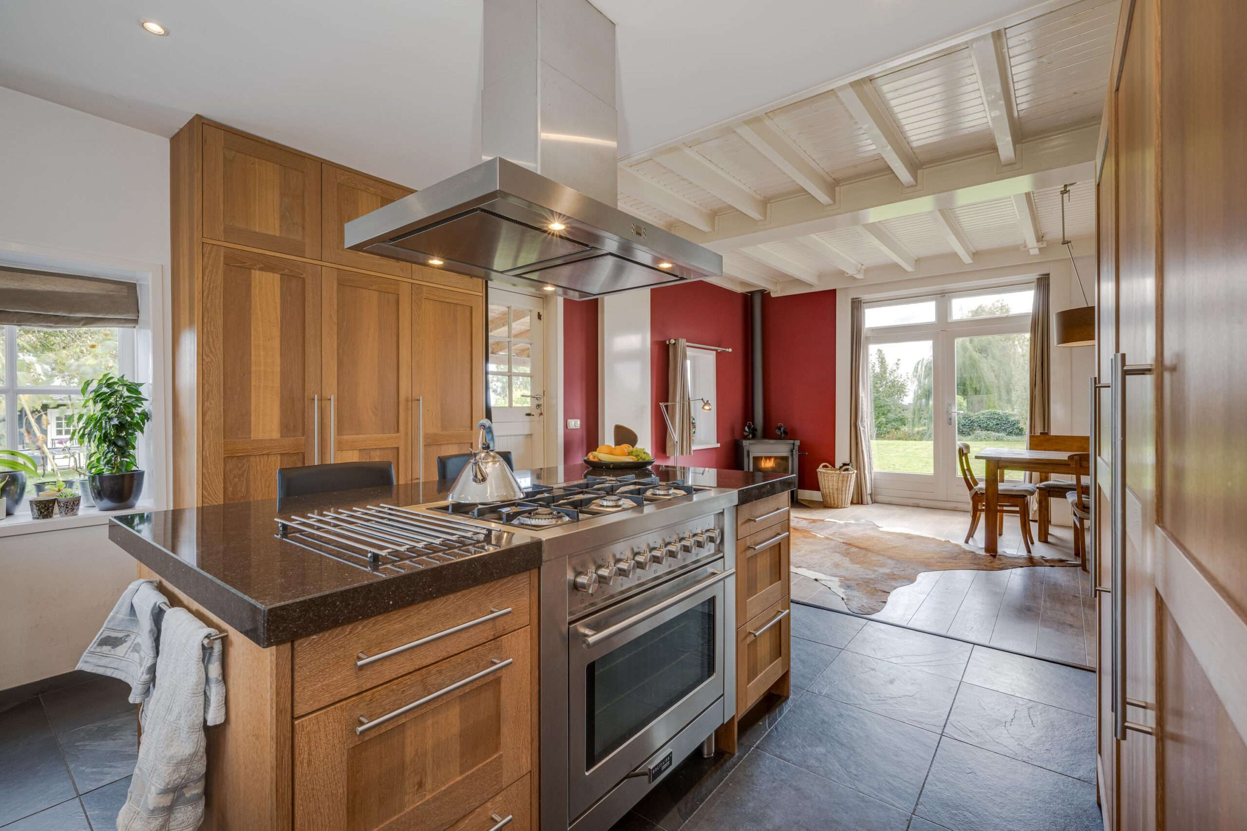 • Ruime woonkamer met houtenvloer, balkenplafond, houtkachel en openslaande deuren