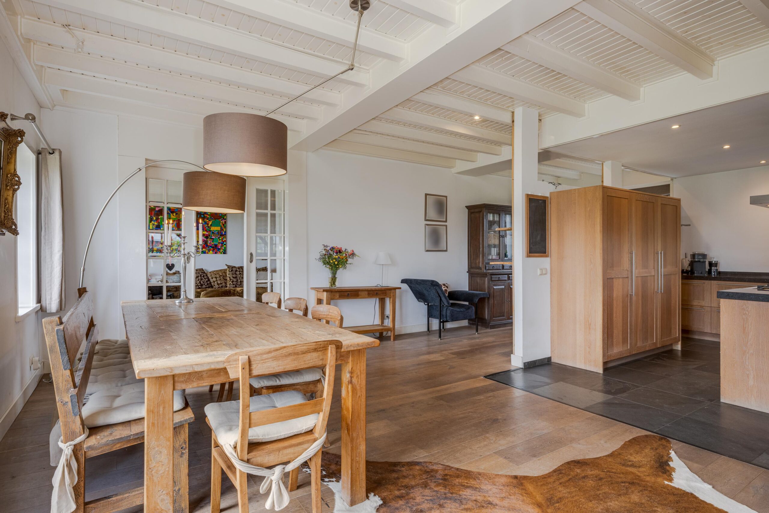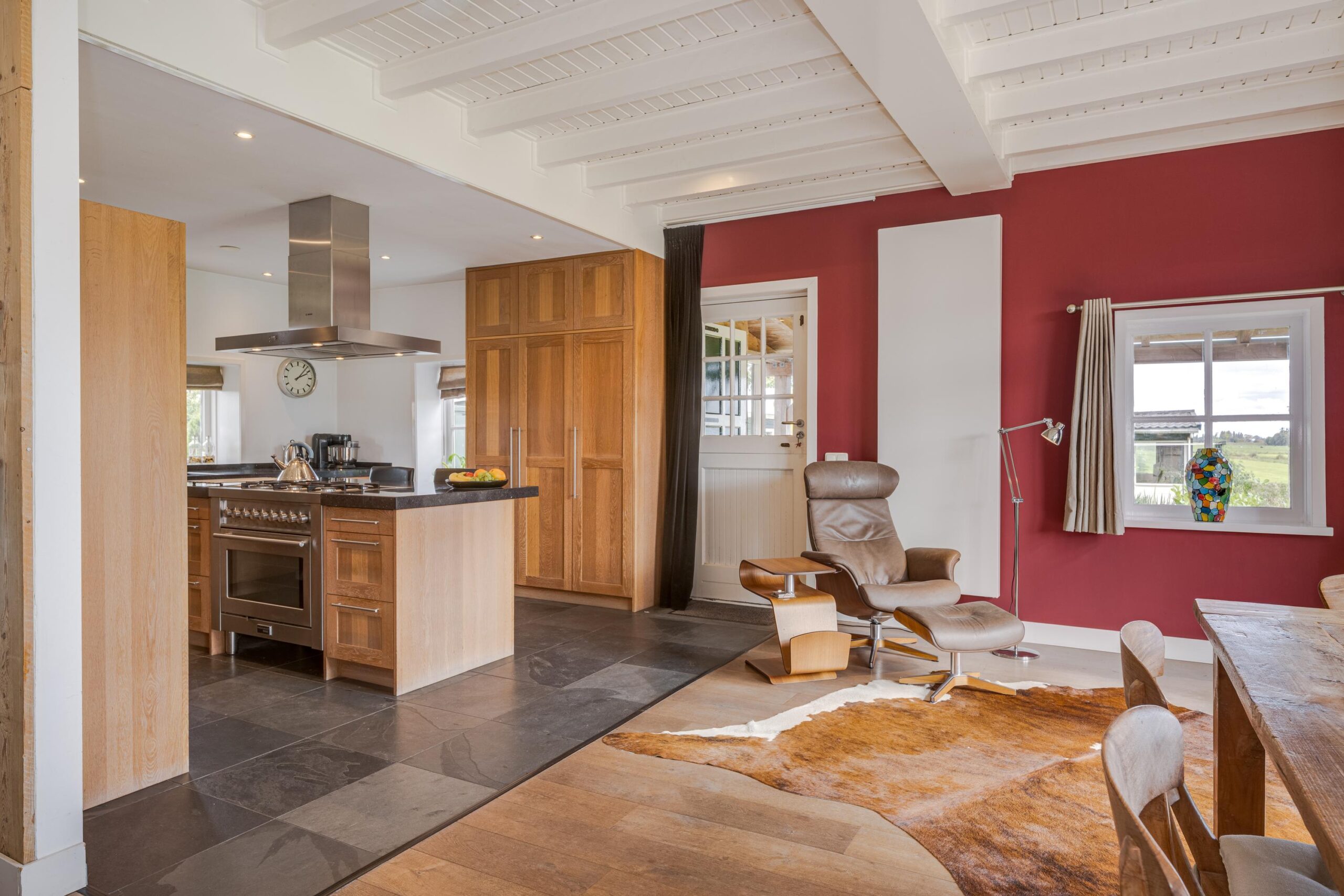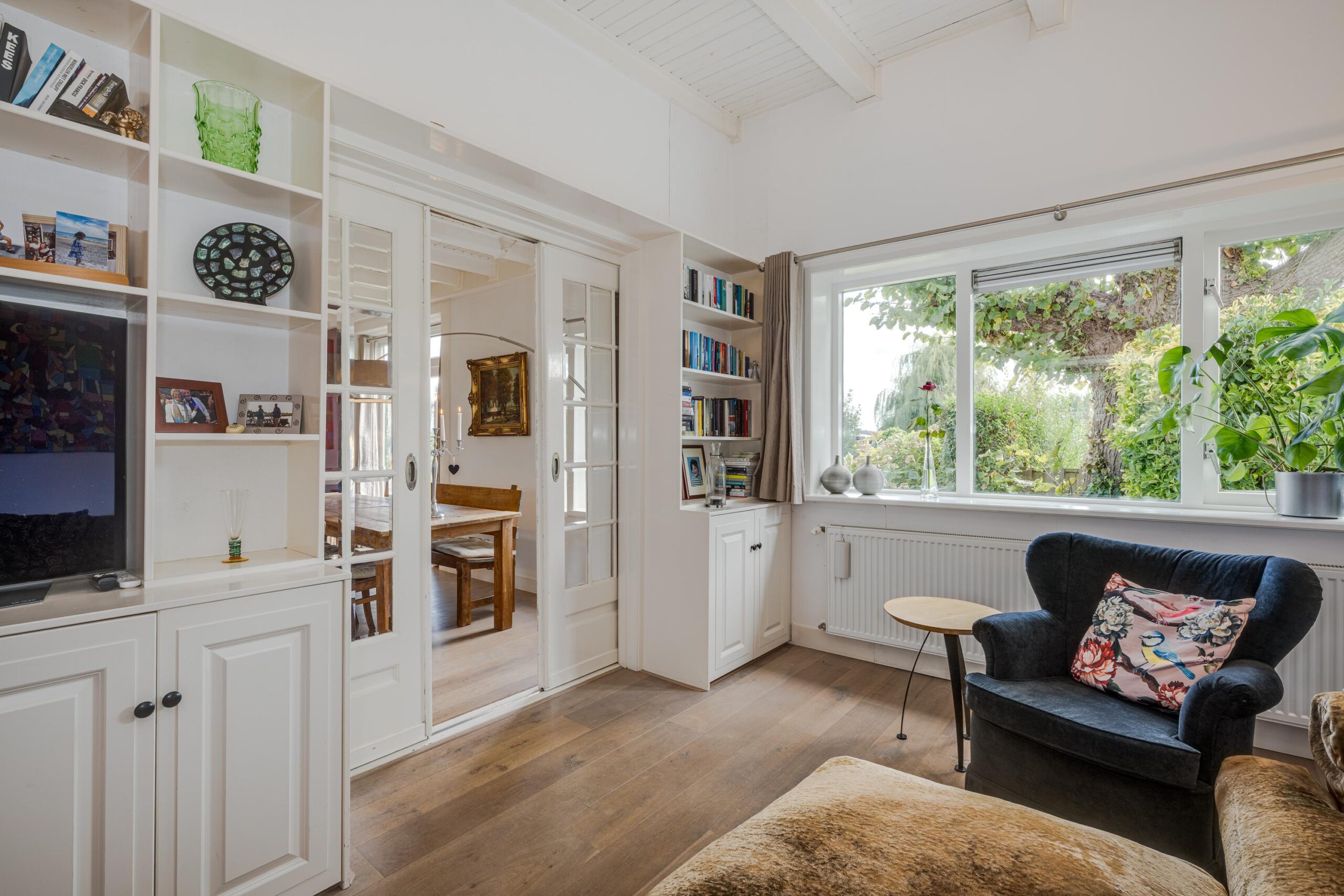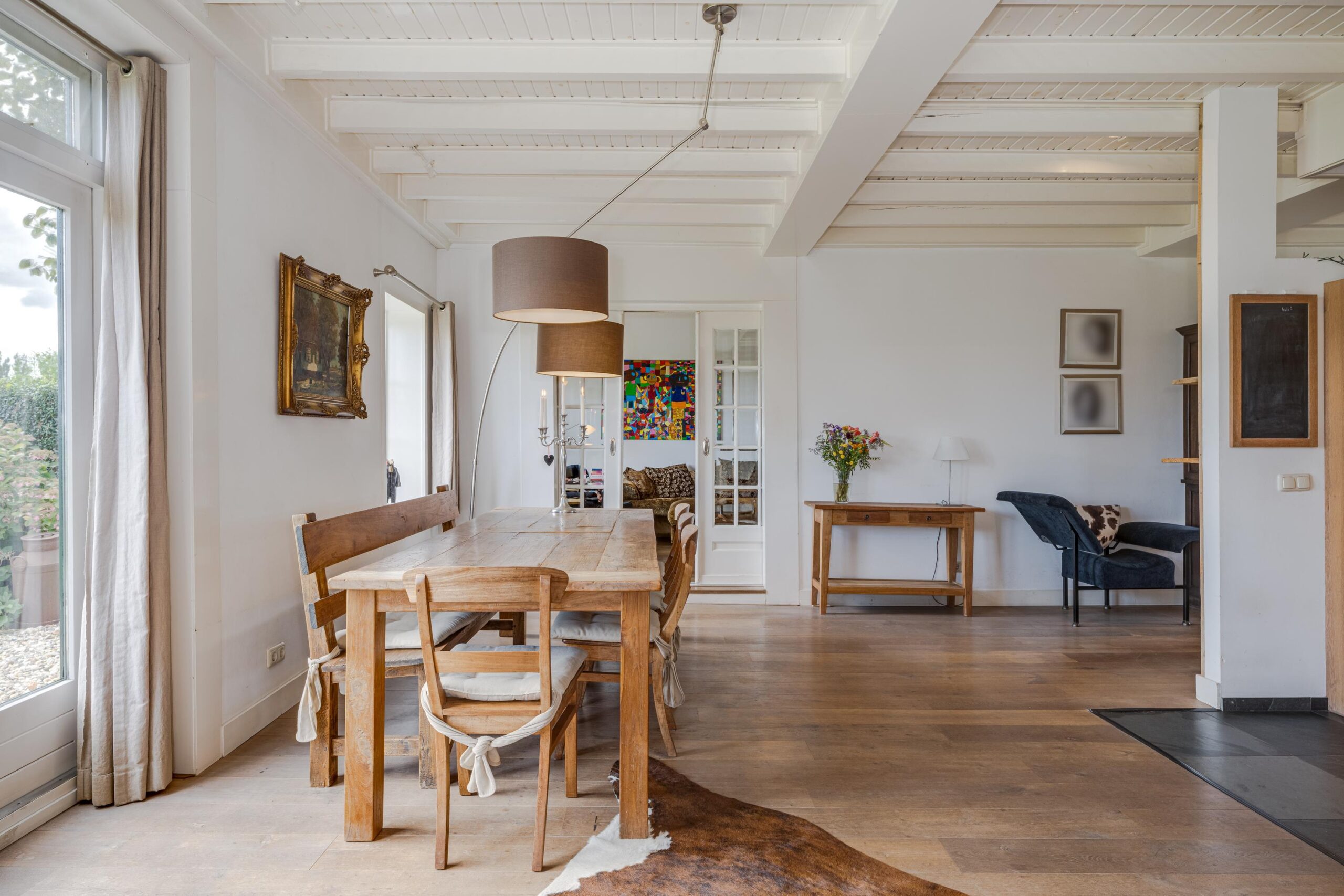 • Ruime woonkamer met houtenvloer, balkenplafond, houtkachel en openslaande deuren