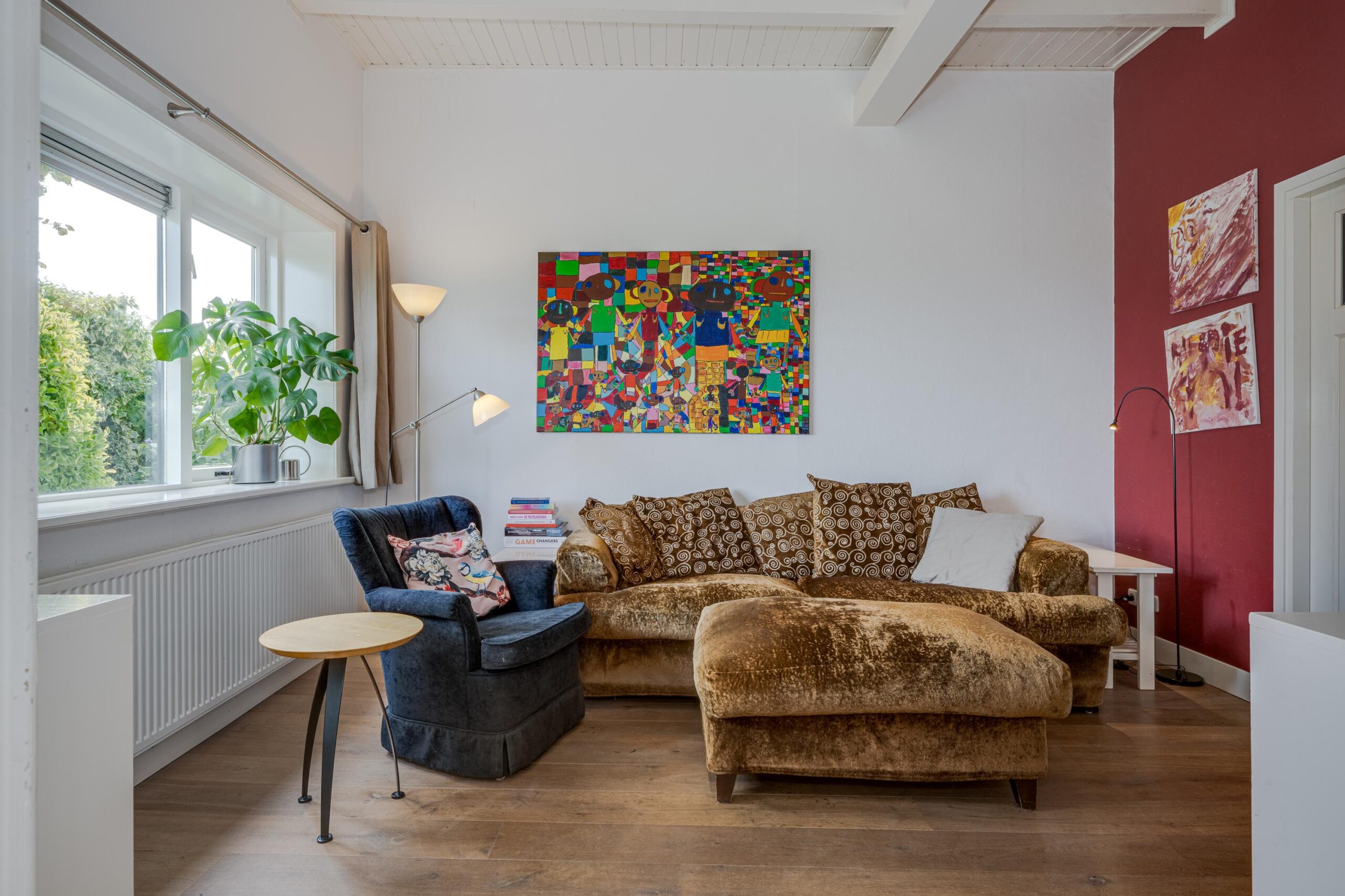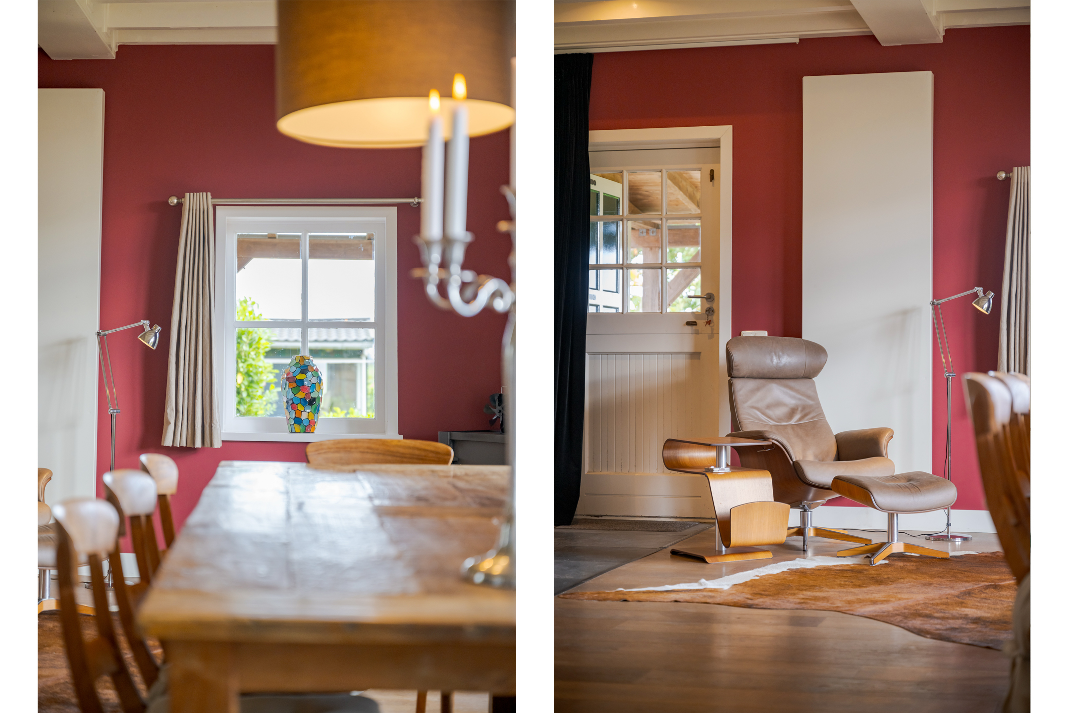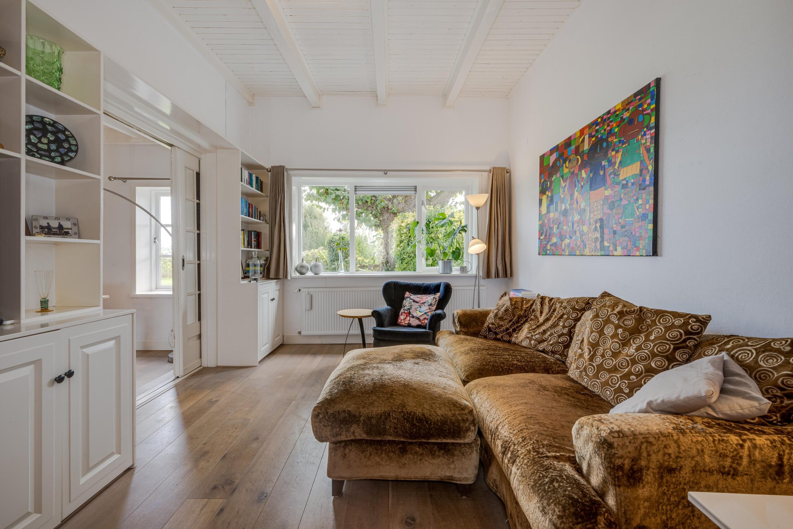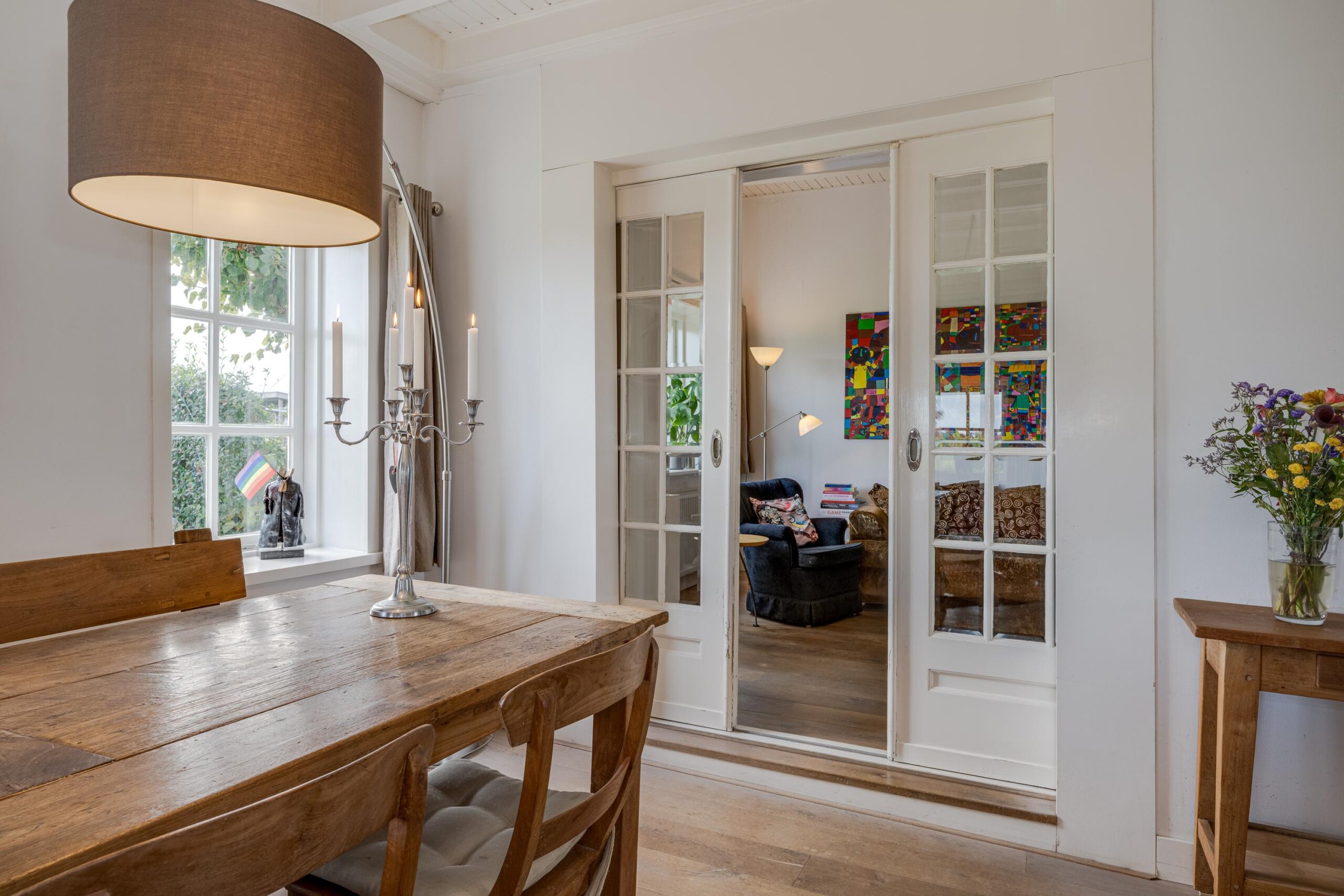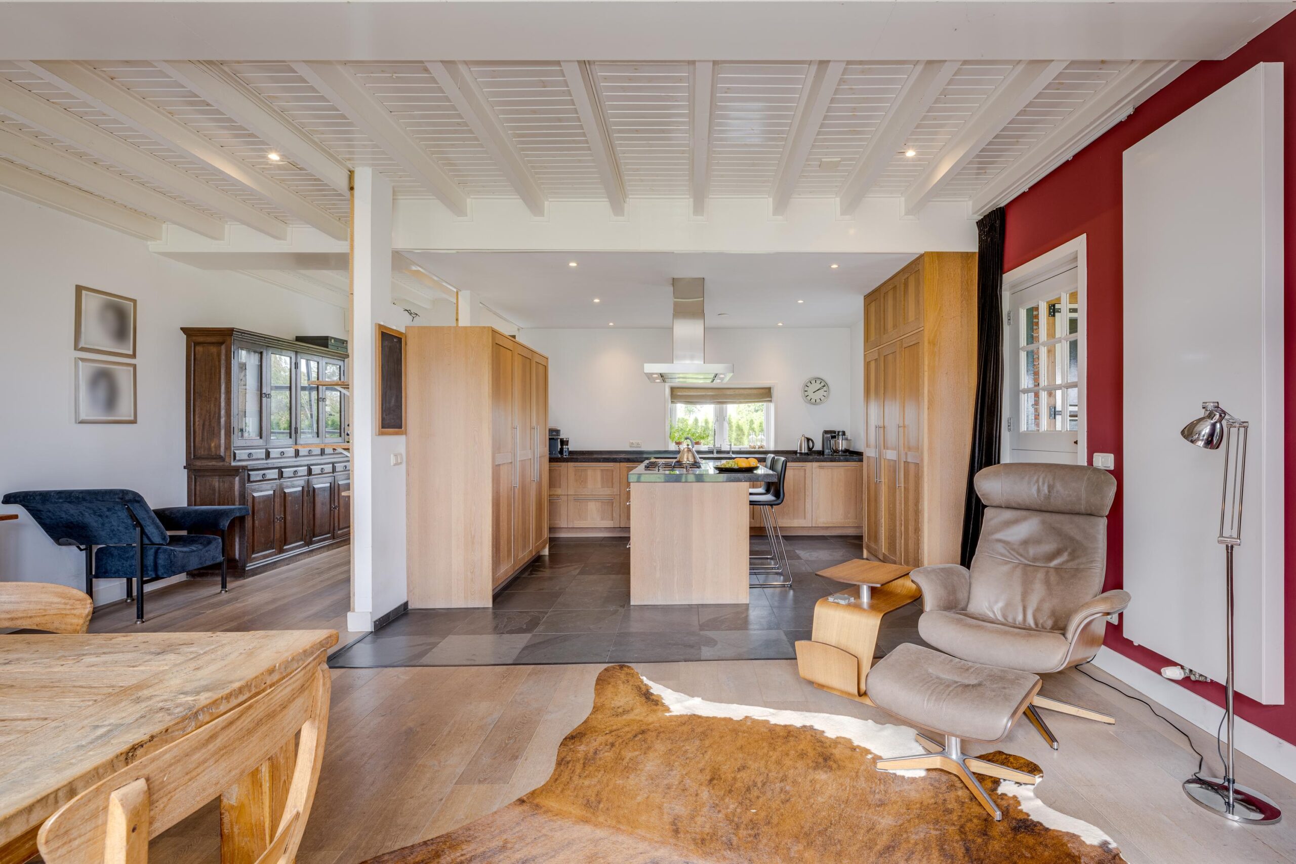 • Ruime woonkamer met houtenvloer, balkenplafond, houtkachel en openslaande deuren