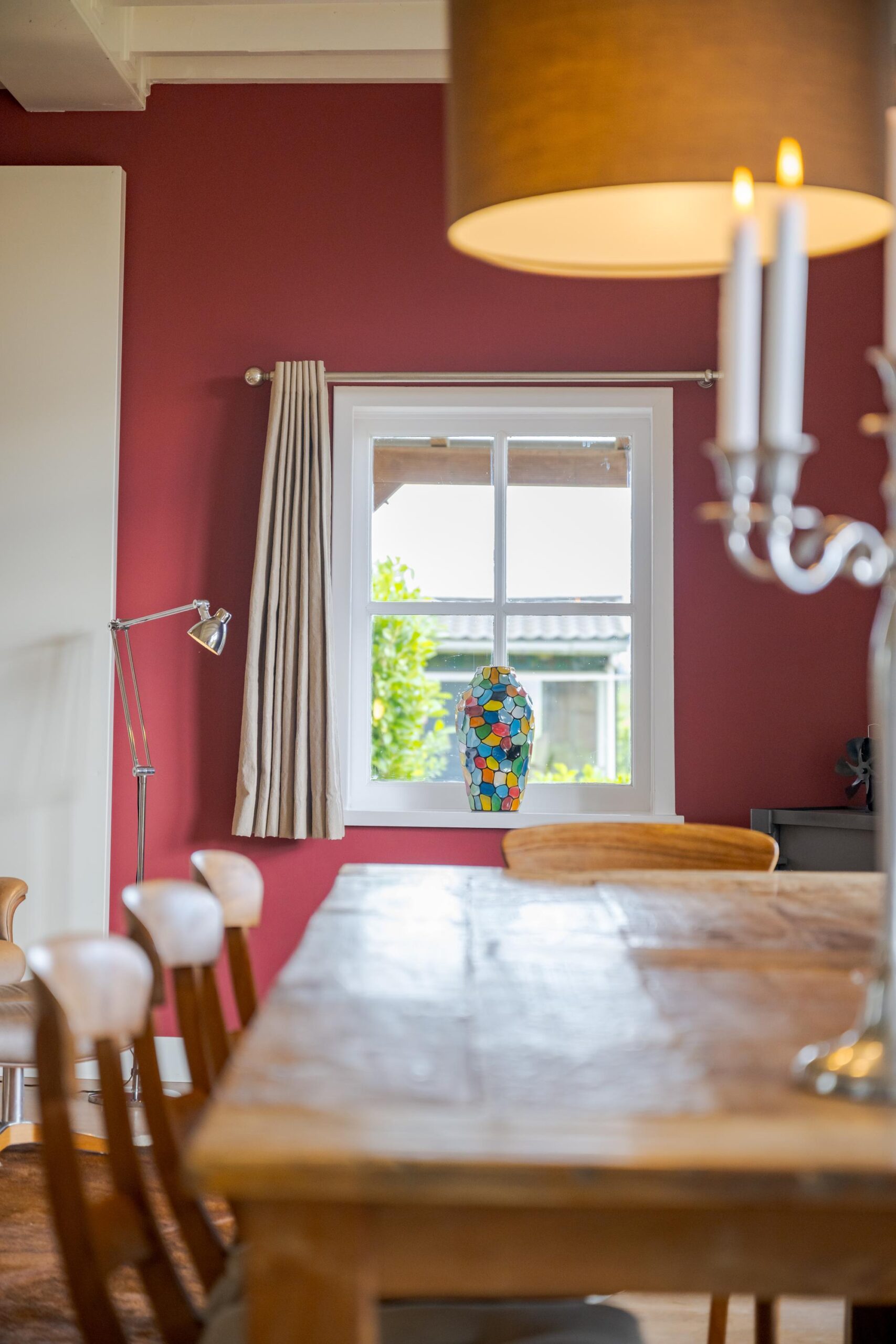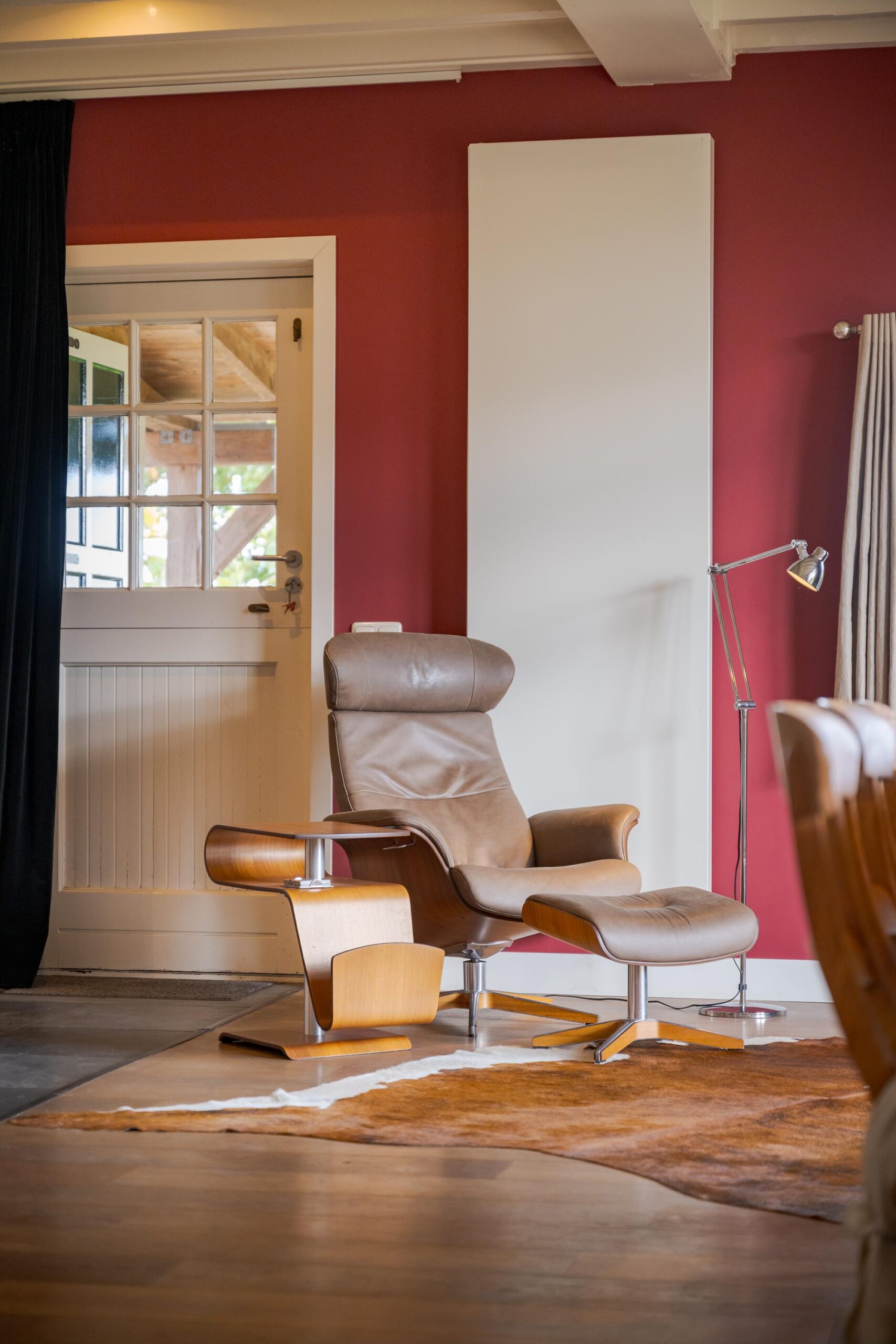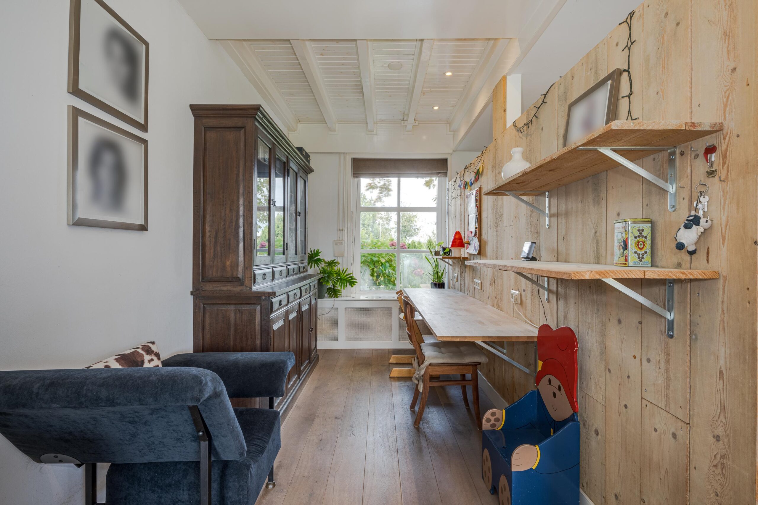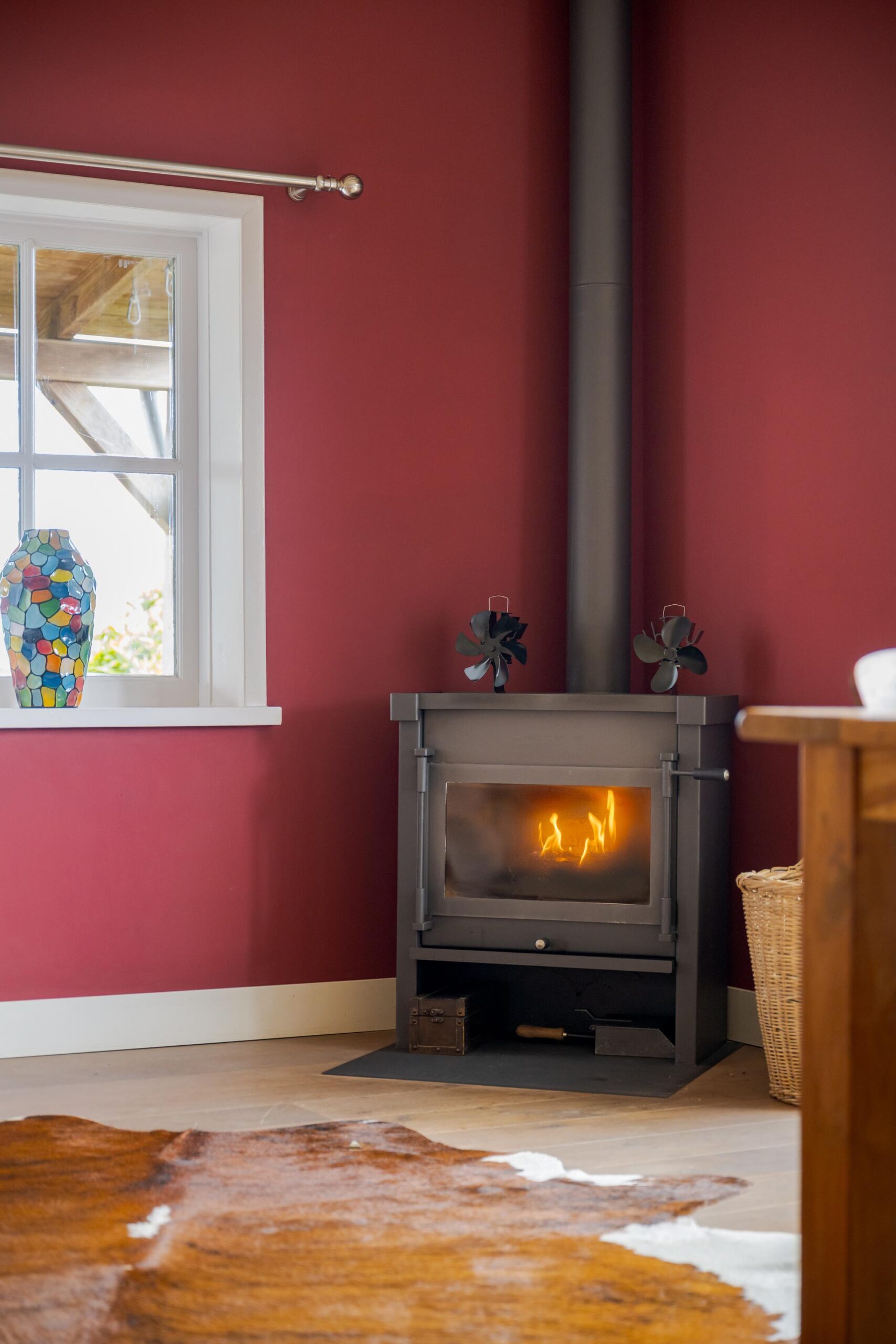 • Ruime woonkamer met houtenvloer, balkenplafond, houtkachel en openslaande deuren