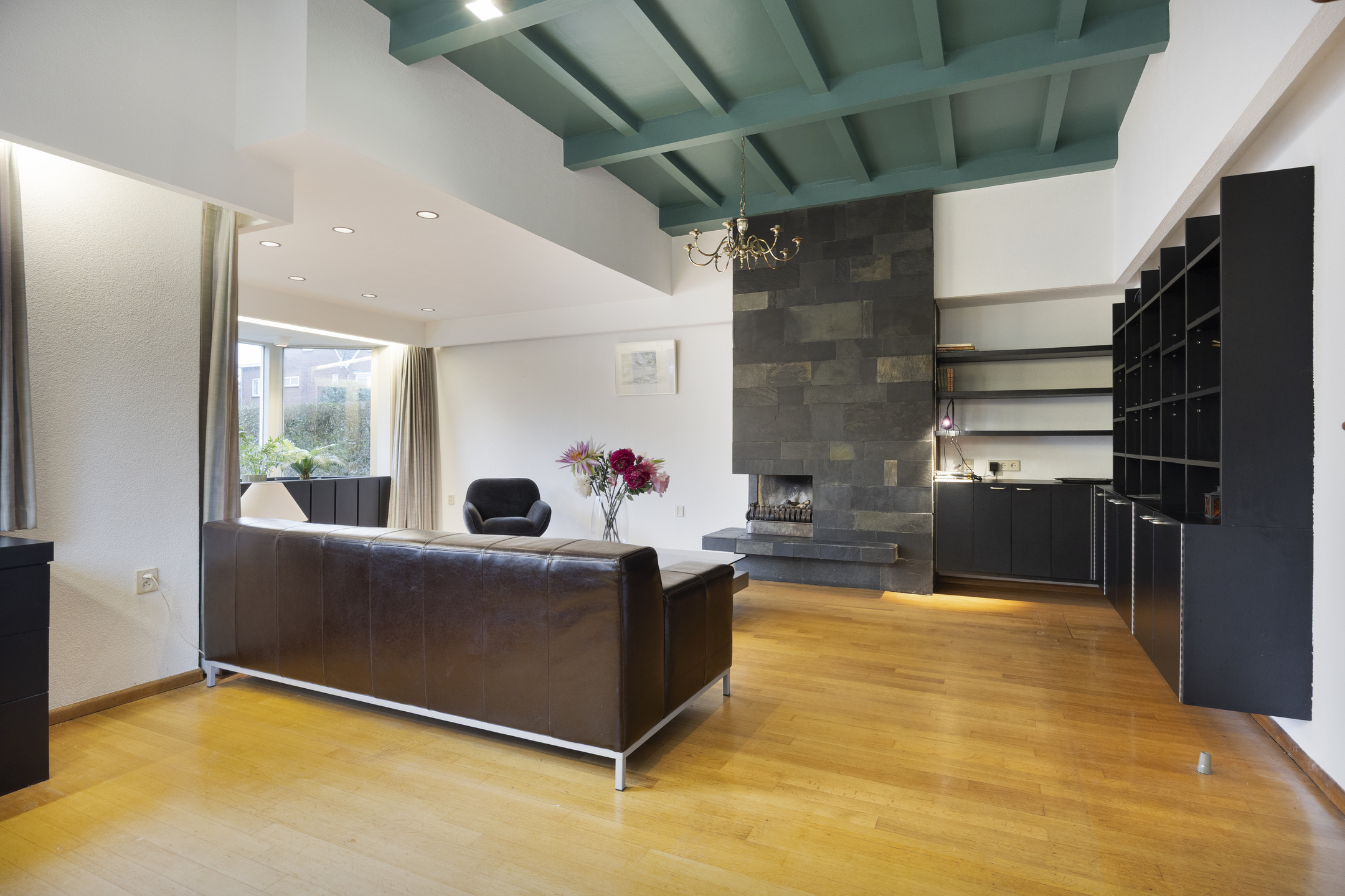 Na binnenkomst via de entree kom je in de centrale hal. De bordestrap, het glas-in-lood en de panelen vormen het statige hart van de woning en verbinden alle vertrekken en verdiepingen met elkaar. Aan de voorzijde ligt de L-vormige woonkamer met aan de ene zijde een zitgedeelte met haard en openslaande deuren naar de tuin en aan andere zijde plaats voor bureau, tv-hoek of formal dining.