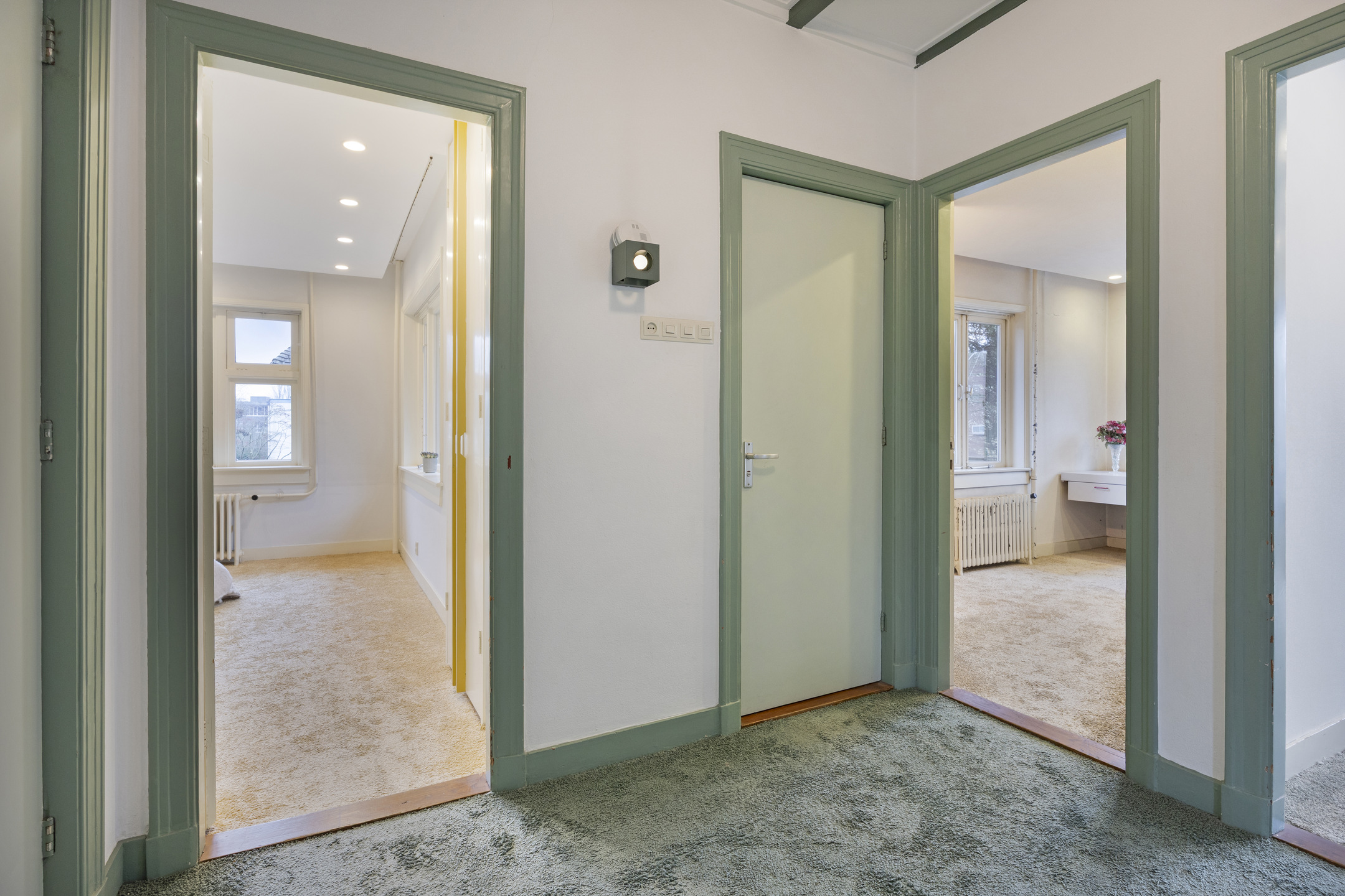 De centrale overloop biedt toegang tot alle kamers. Daarbij bevinden zich aan de voorzijde twee slaapkamers, waarvan één met openslaande deuren naar het ruime dakterras en weids uitzicht over de voortuin en Fruinlaan. Aan de achterzijde bevinden zich ook twee slaapkamers, waarvan één in gebruik is als de ouderslaapkamer met een direct verbinding naar de badkamer. Op de overloop bevindt zich nog een aparte wc met fonteintje. Trouwens, alle slaapkamers beschikken over een eigen wastafel met marmeren achterblad.