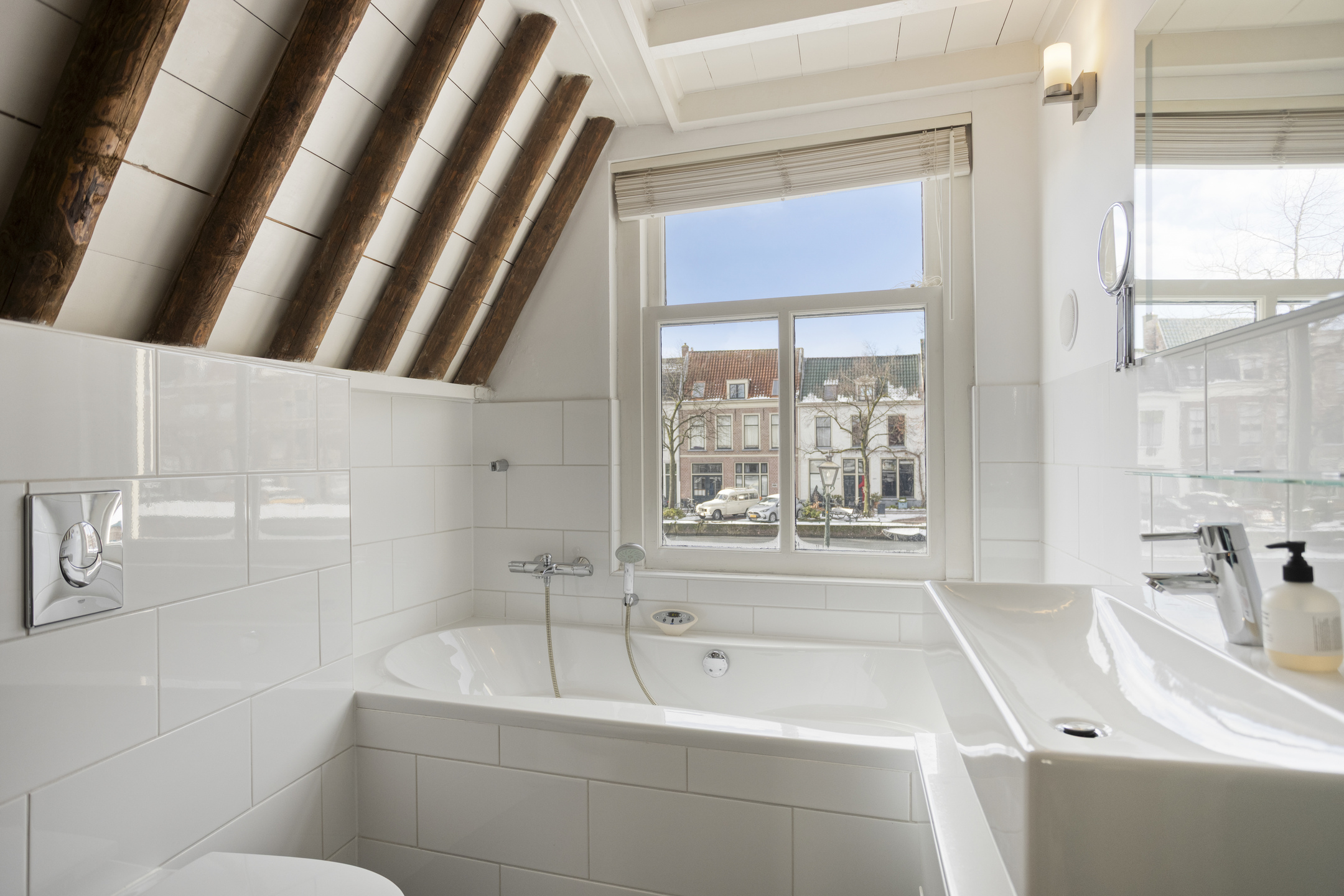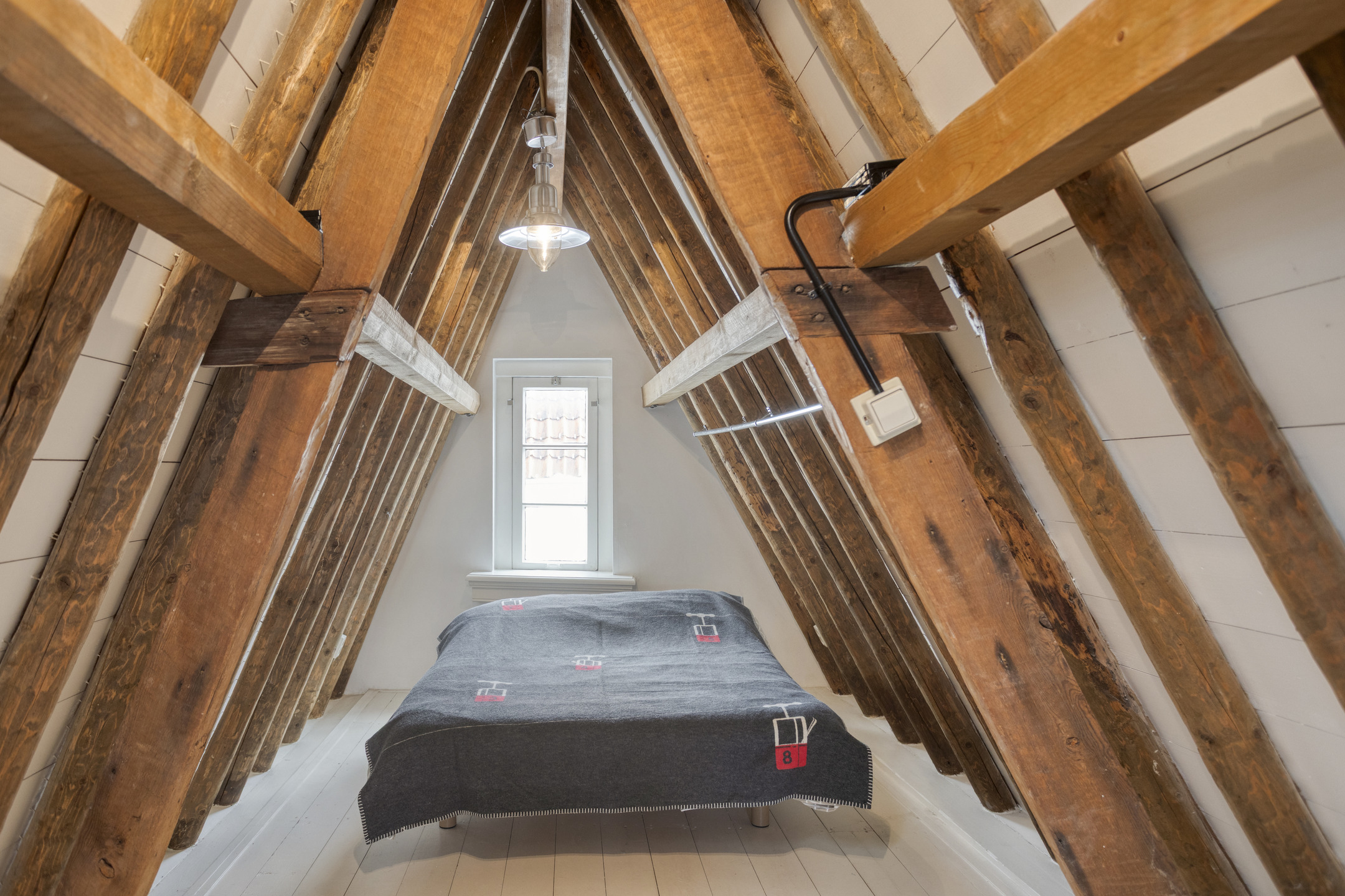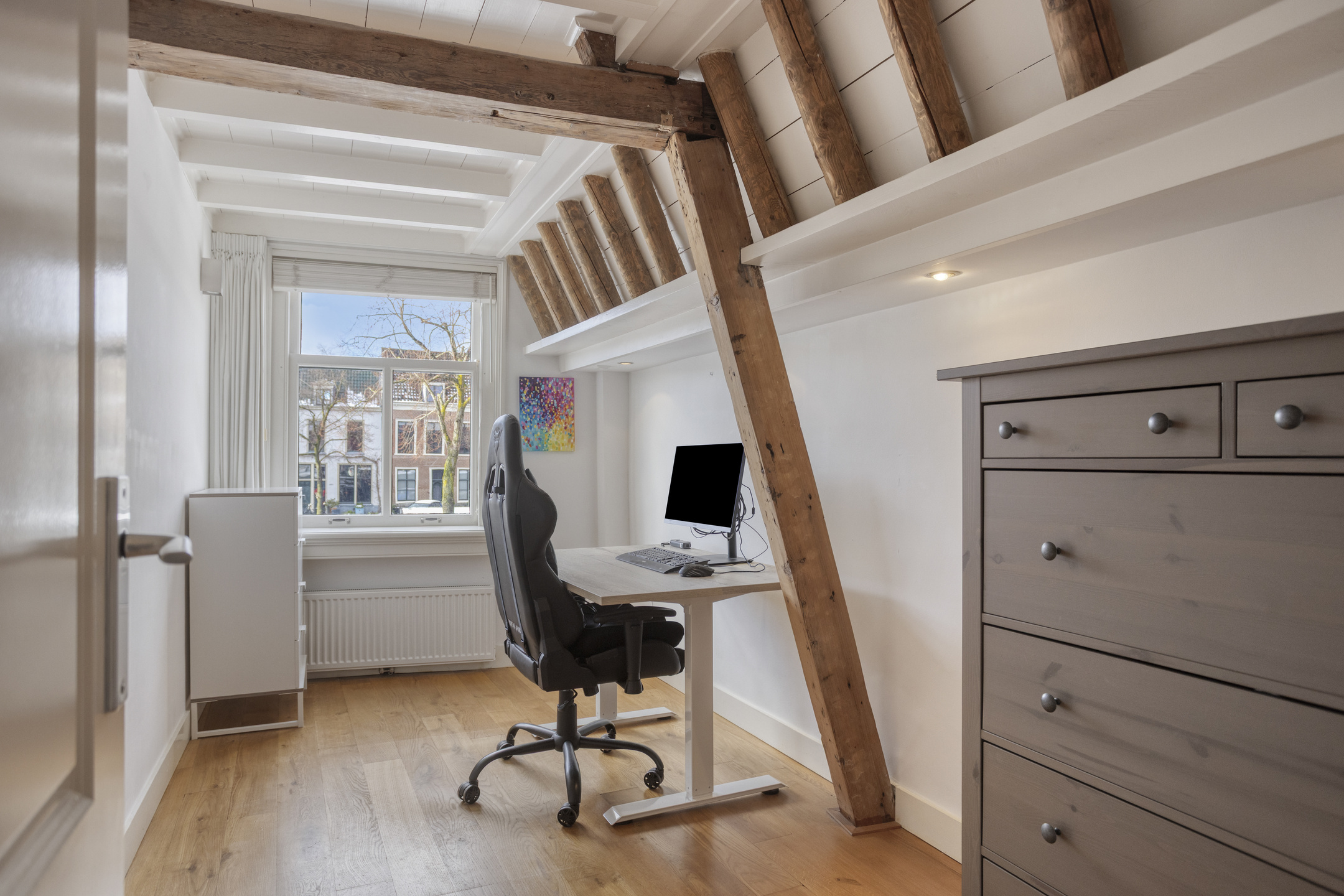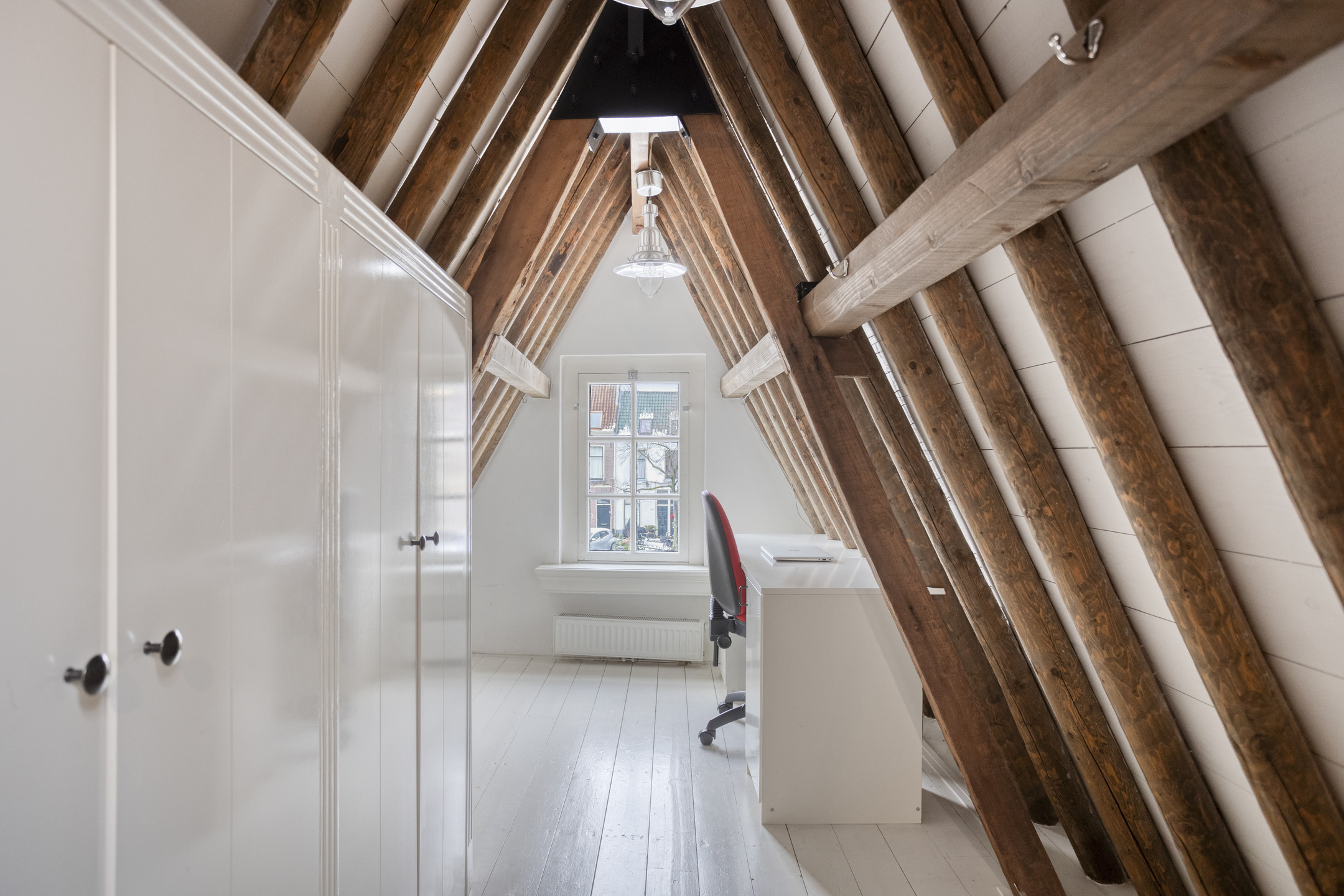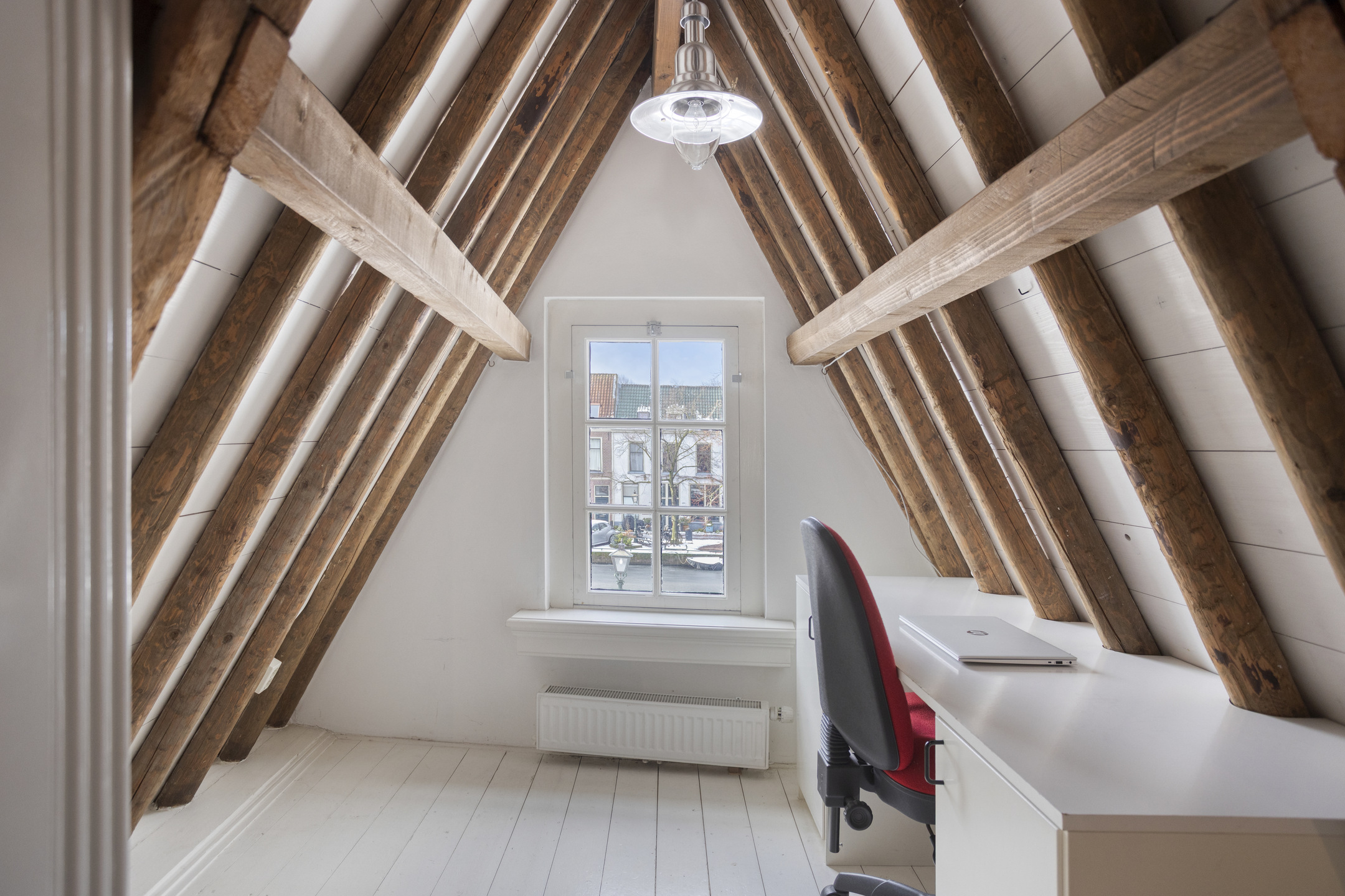De tweede etage is een open en lichte ruimte met authentieke kapconstructie en biedt volop mogelijkheden als extra slaapkamer, werkplek of atelier – passend bij het creatieve en academische karakter van Leiden.