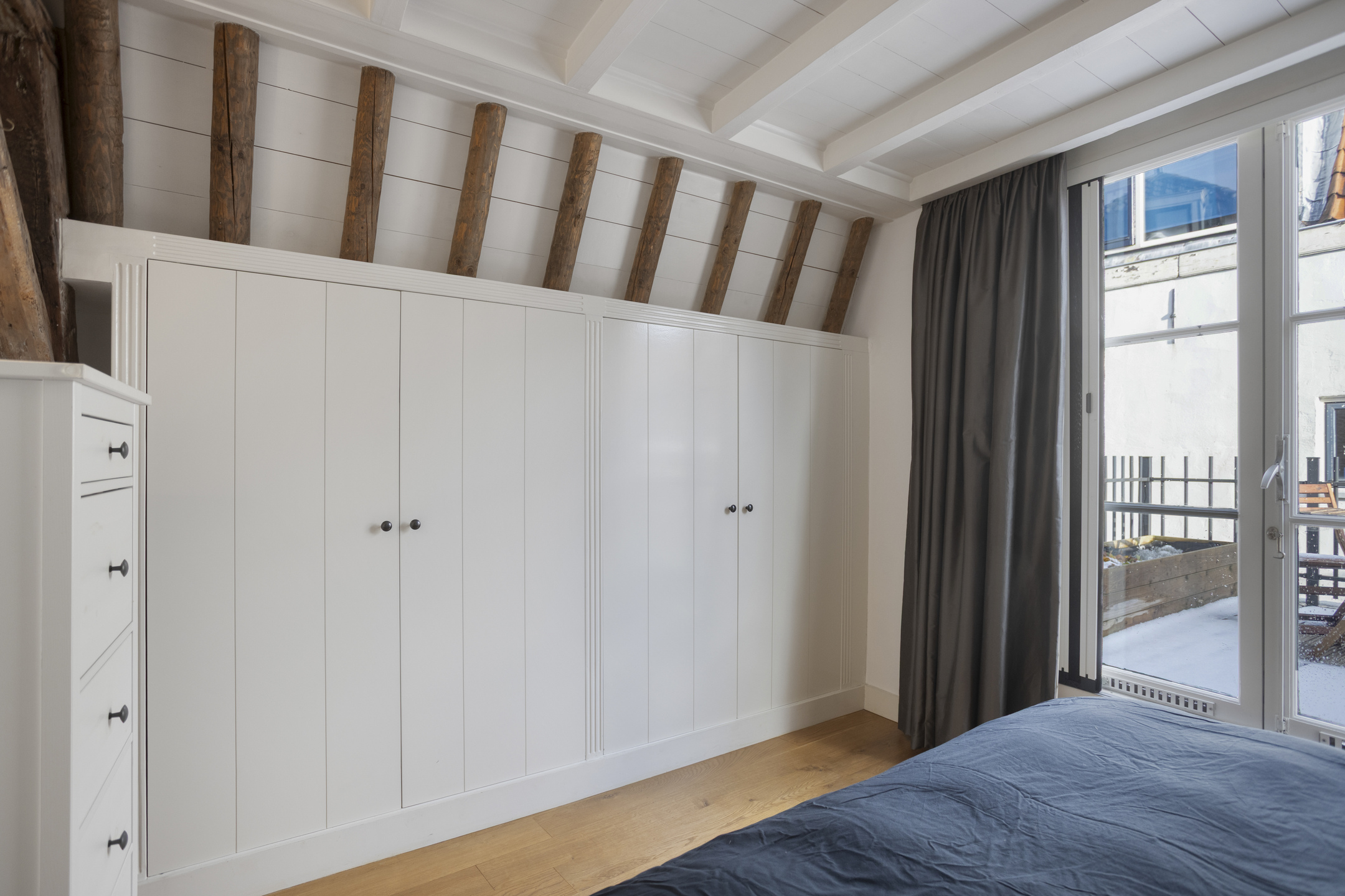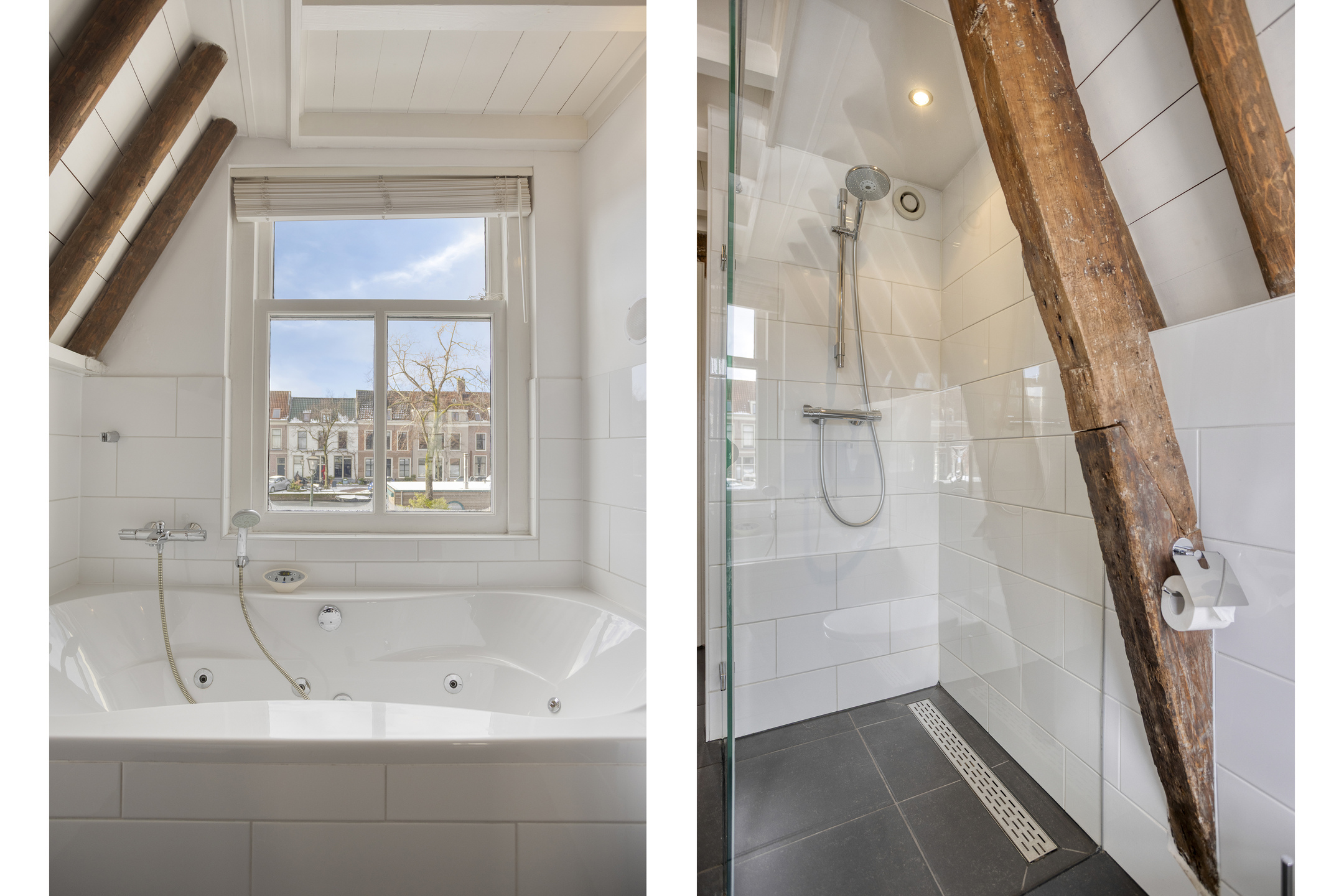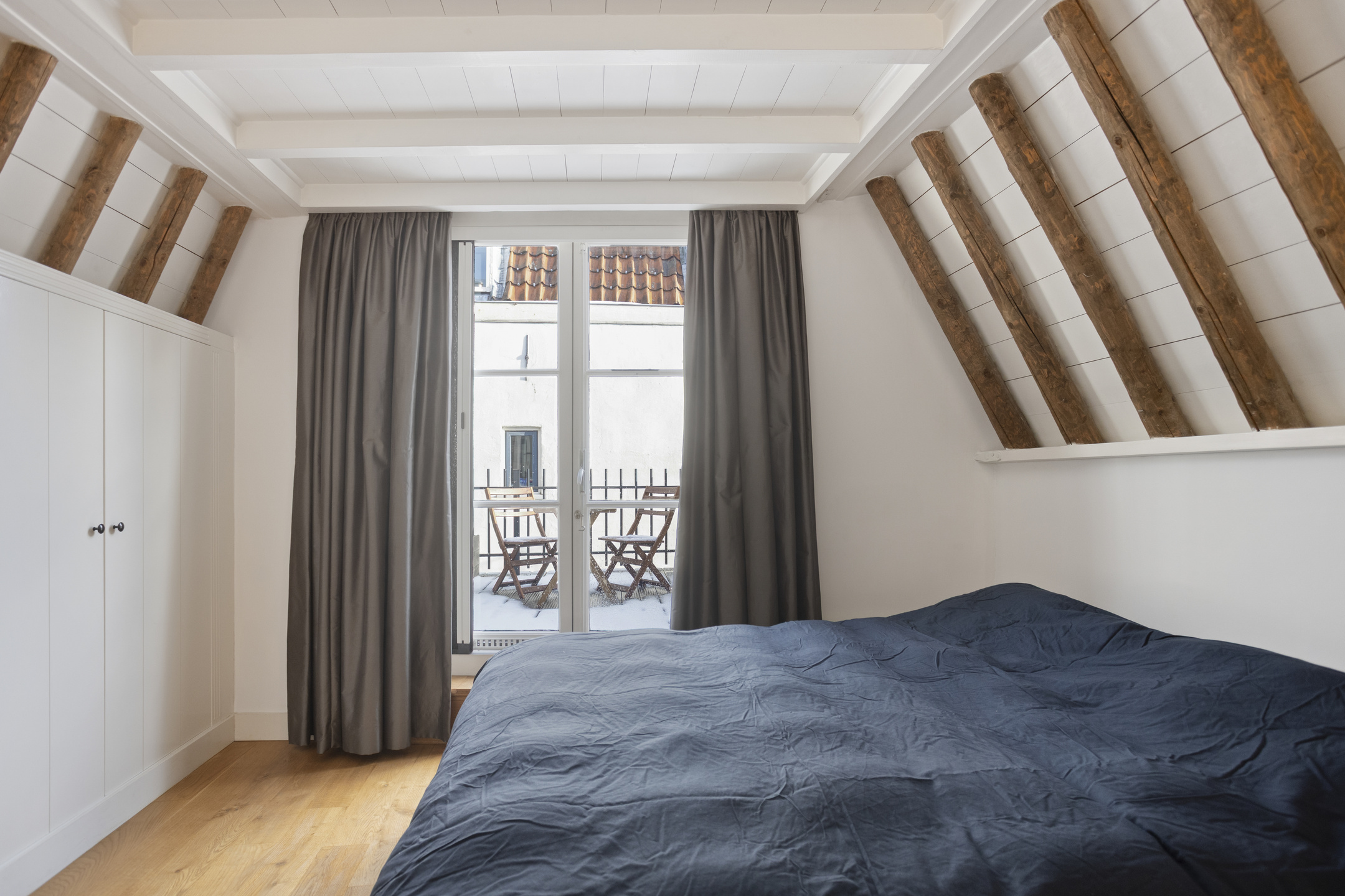 Op de eerste etage bevindt zich aan de voorzijde een slaapkamer en een complete badkamer met douche, ligbad, wastafel en toilet. Aan de achterzijde ligt de sfeervolle master bedroom met openslaande deuren naar het royale dakterras, waar u in alle privacy kunt genieten van de historische daken en de stadse stilte.