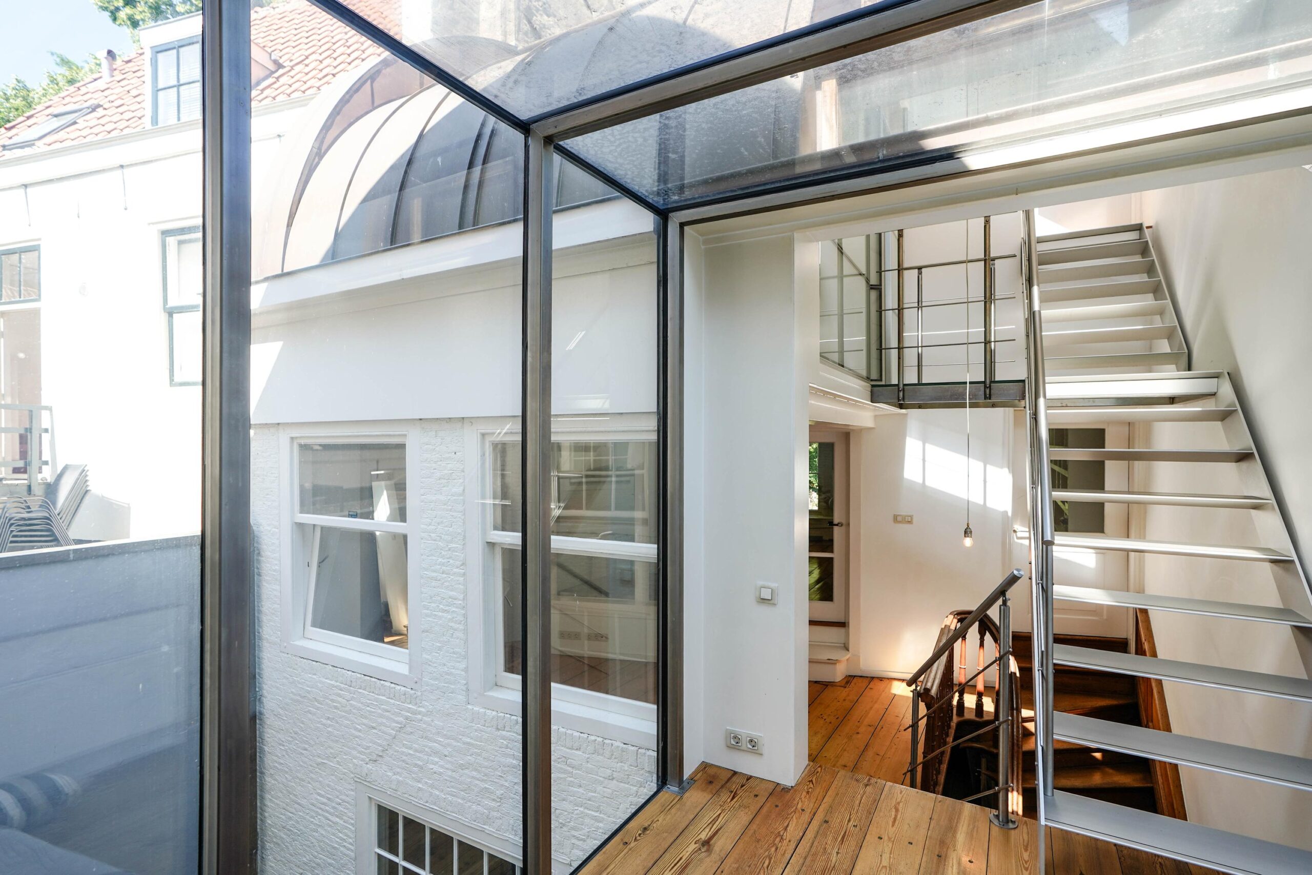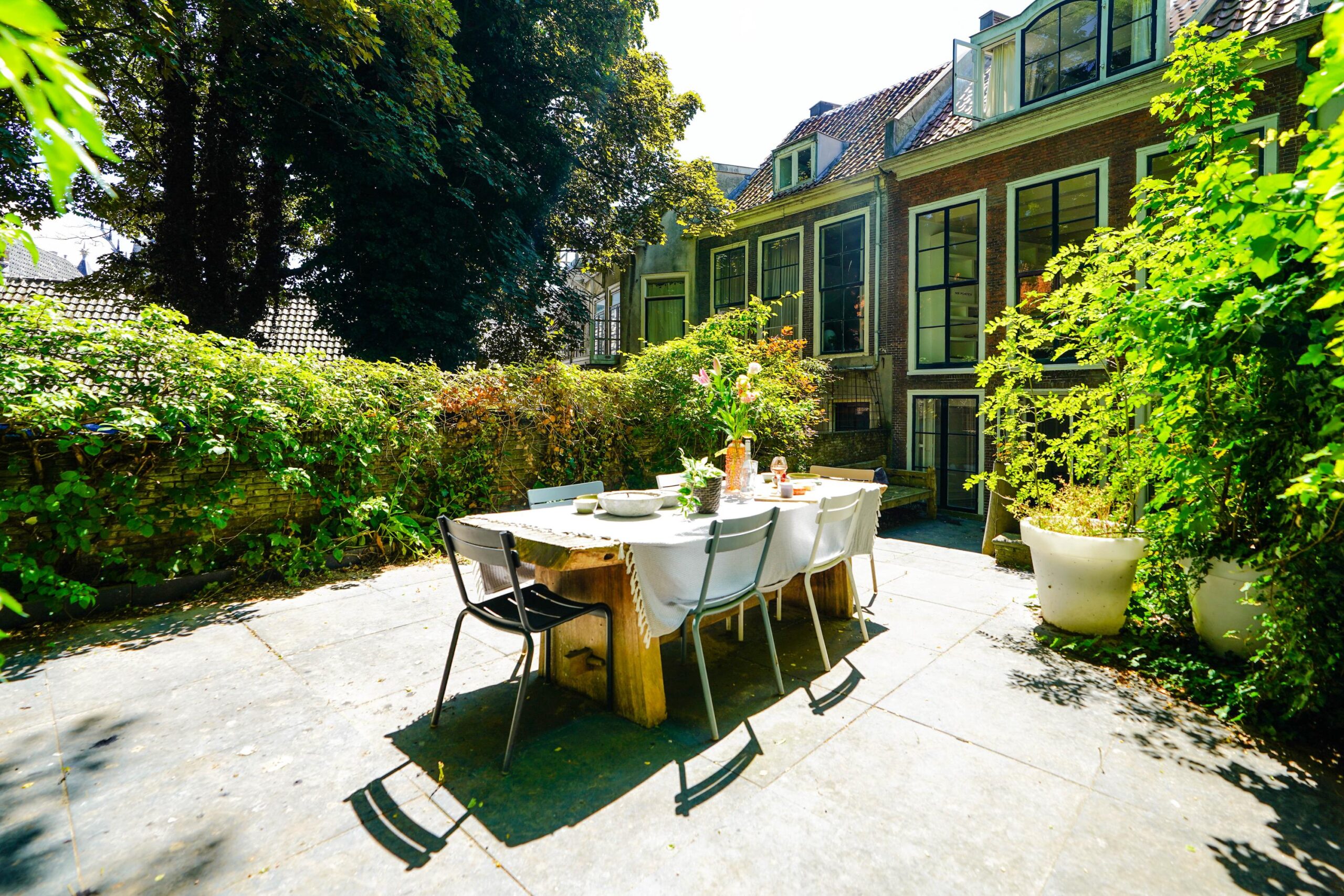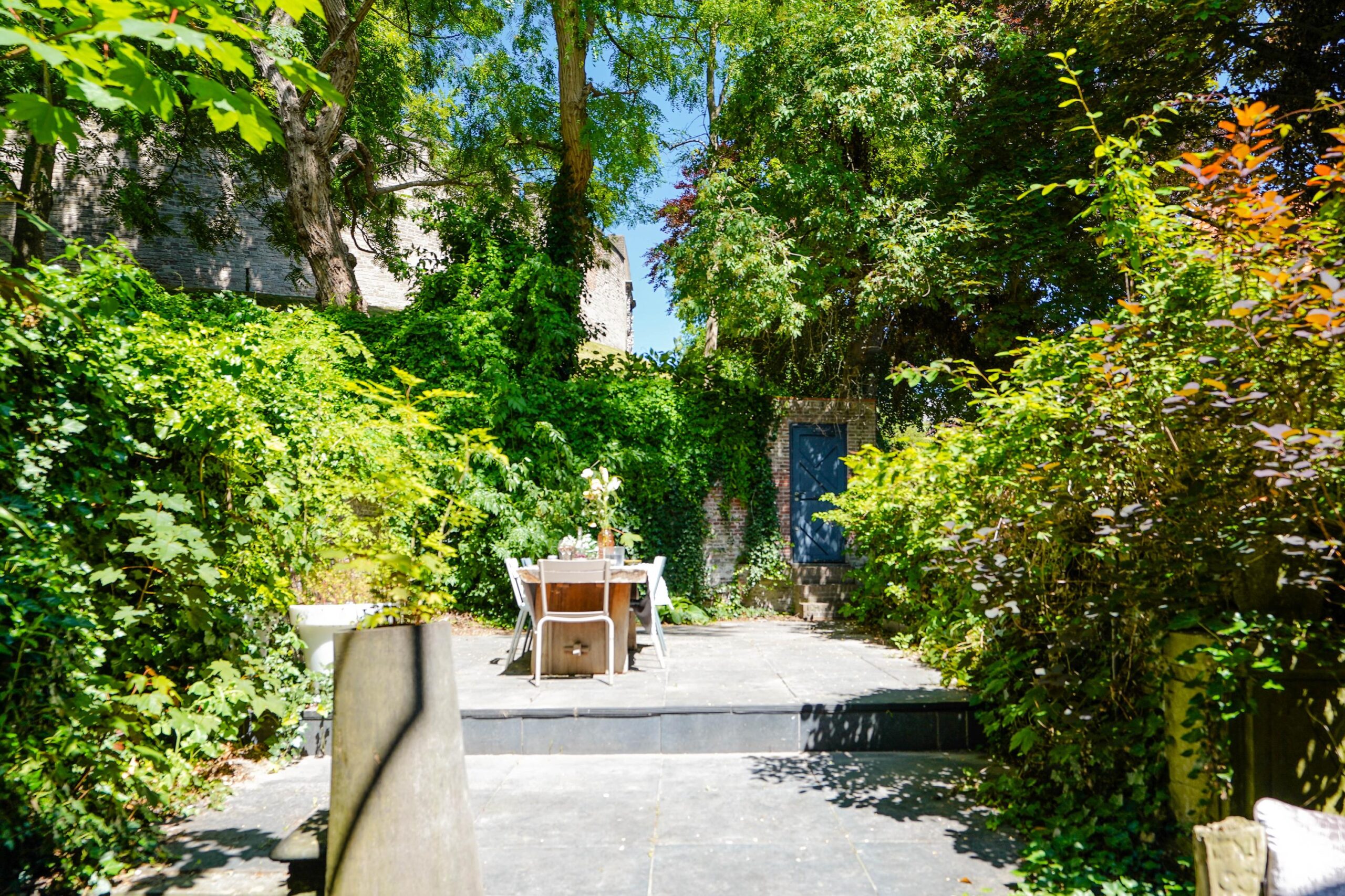 Het achterhuis is gericht op de tuin en de burchtheuvel. Vanuit de verschillende ruimtes zie je het oude onderkomen van de Burggraaf door mooie hoge raampartijen: een 800 jaar oude oase van groen midden in de binnenstad. Hier heeft de huidige eigenaar op de begane grond een tuinkamer met daarbij een extra keuken. Deze heb je ook wel nodig, want om elke keer het hele pand weer door te moeten voor een hapje of drankje als je in de tuin zit is wel wat veel gevraagd. Het zijn nogal afstanden die je hier kan afleggen. Op de 1e etage bevindt zich nu een tweede woonkamer. met hoge plafonds, een haard en het beste zicht op de Burcht. Het zou ook een heerlijk kantoor of een bibliotheek kunnen zijn. Boven is een apart gastenverblijf met eigen badkamer en wc. Een au pair zou hier ook een heel fijn plekje kunnen hebben.