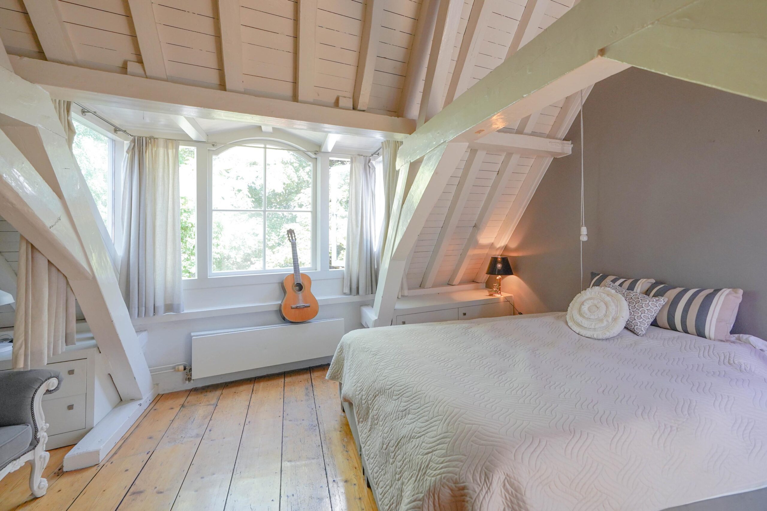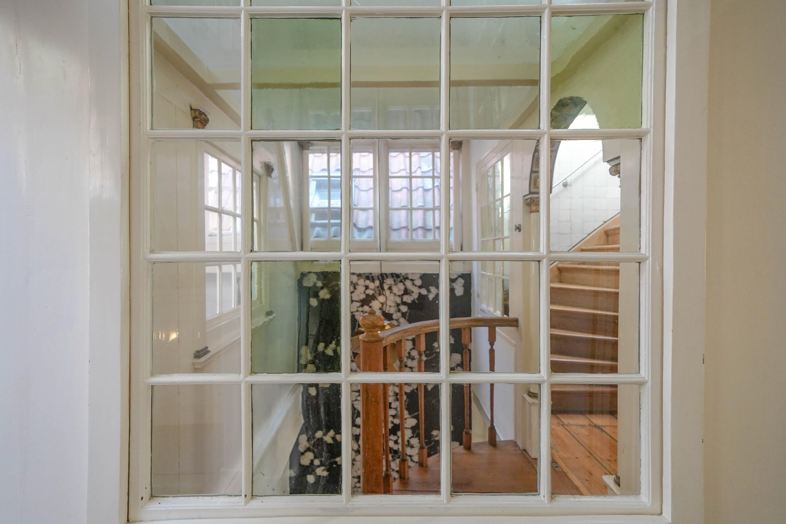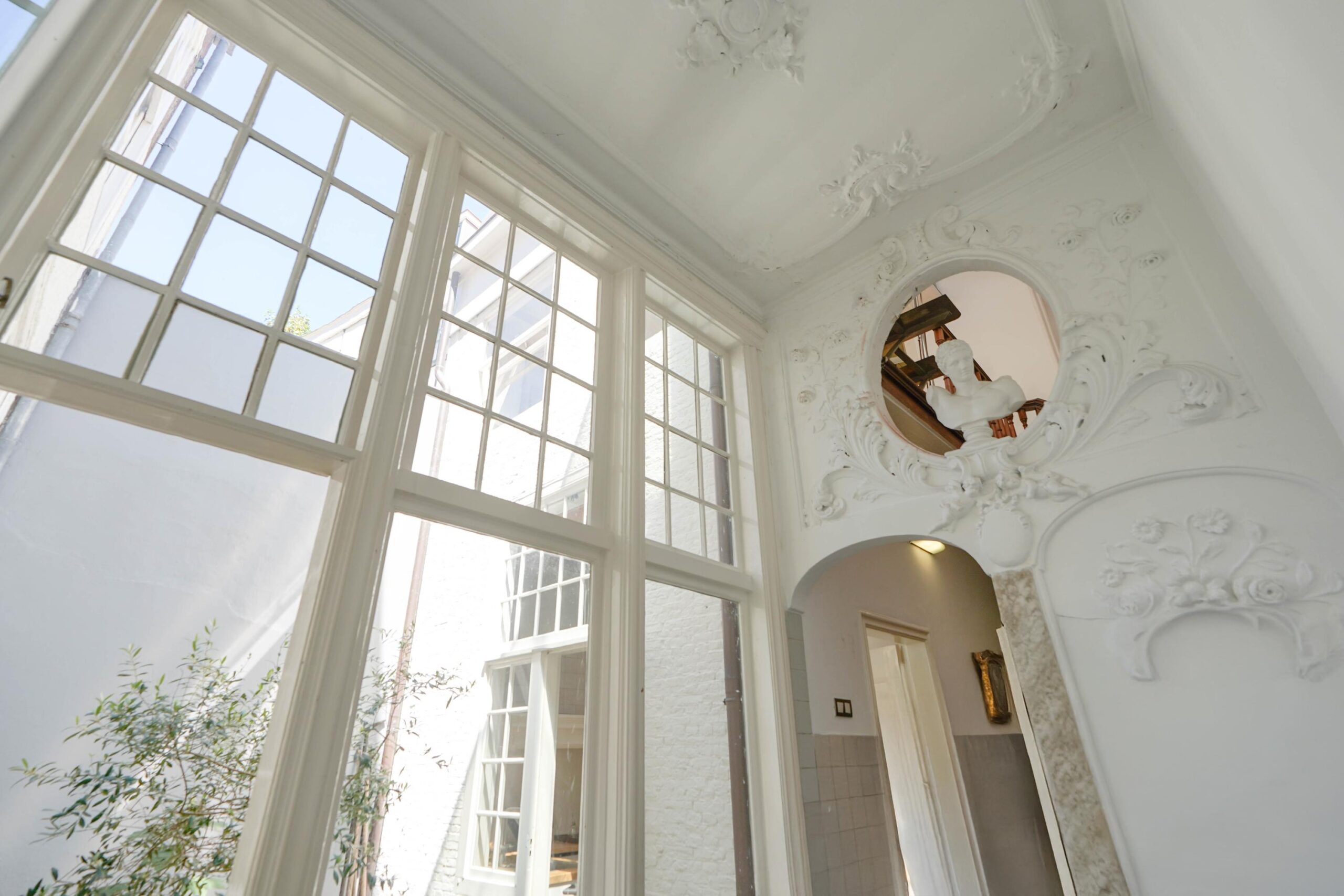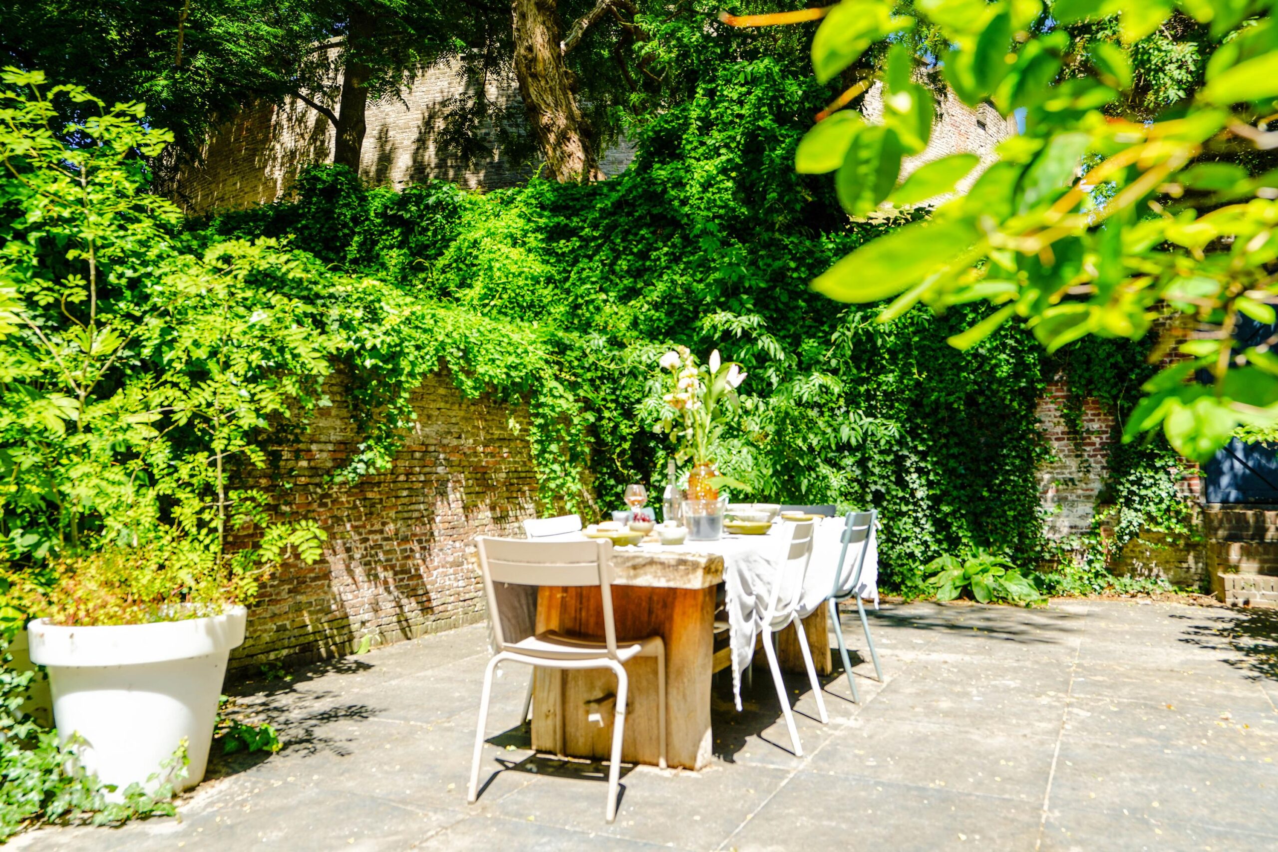 Het achterhuis is gericht op de tuin en de burchtheuvel. Vanuit de verschillende ruimtes zie je het oude onderkomen van de Burggraaf door mooie hoge raampartijen: een 800 jaar oude oase van groen midden in de binnenstad. Hier heeft de huidige eigenaar op de begane grond een tuinkamer met daarbij een extra keuken. Deze heb je ook wel nodig, want om elke keer het hele pand weer door te moeten voor een hapje of drankje als je in de tuin zit is wel wat veel gevraagd. Het zijn nogal afstanden die je hier kan afleggen. Op de 1e etage bevindt zich nu een tweede woonkamer. met hoge plafonds, een haard en het beste zicht op de Burcht. Het zou ook een heerlijk kantoor of een bibliotheek kunnen zijn. Boven is een apart gastenverblijf met eigen badkamer en wc. Een au pair zou hier ook een heel fijn plekje kunnen hebben.