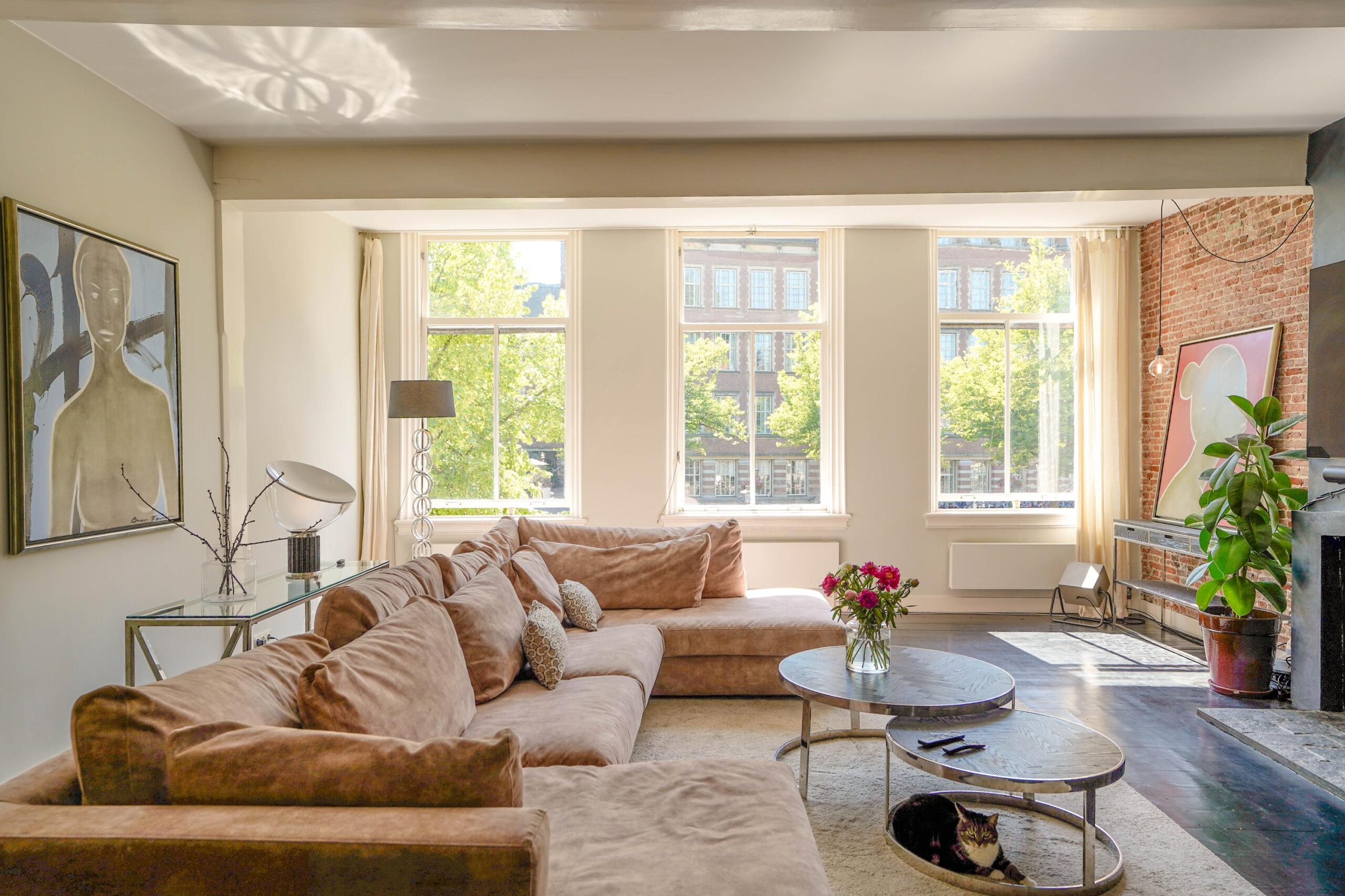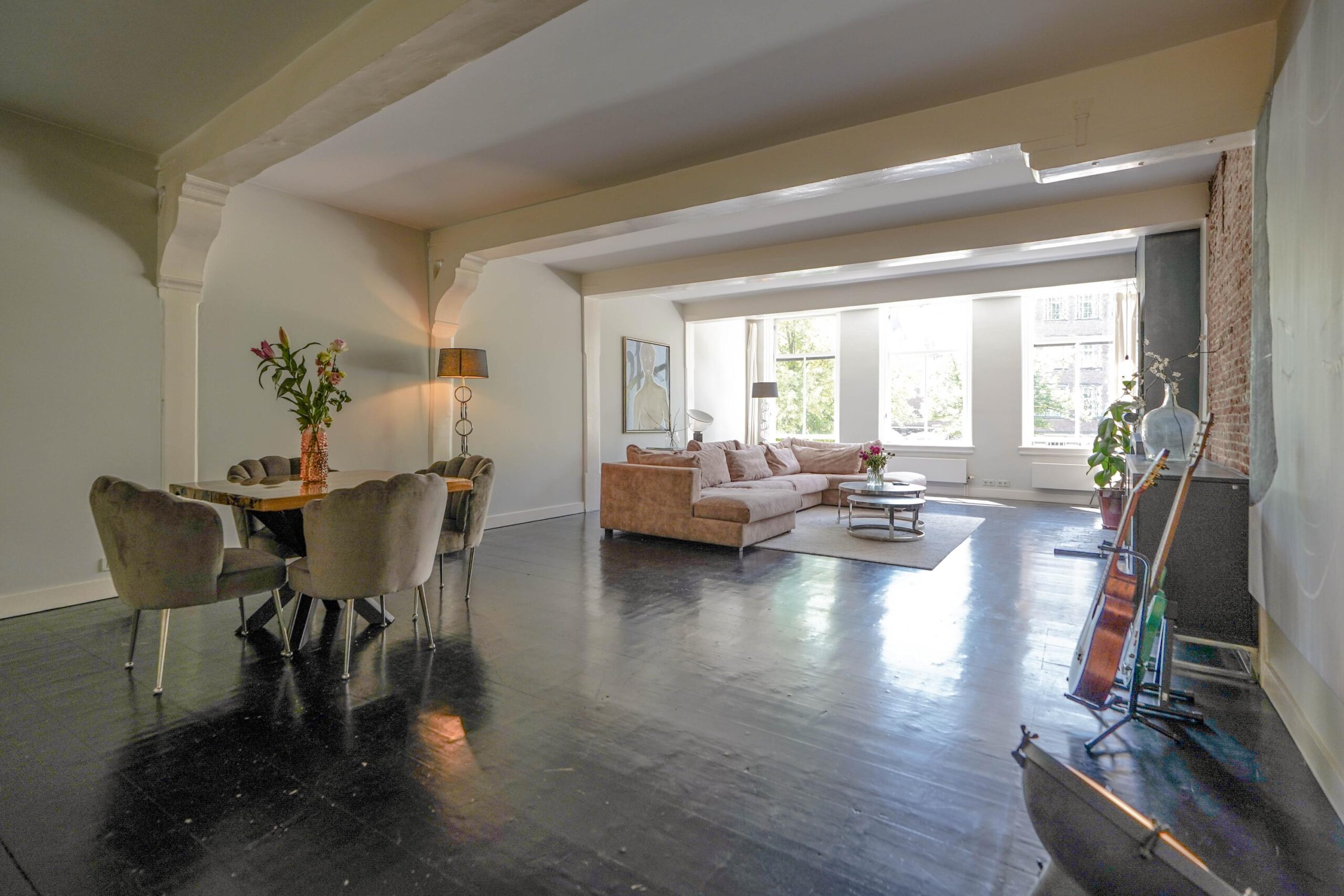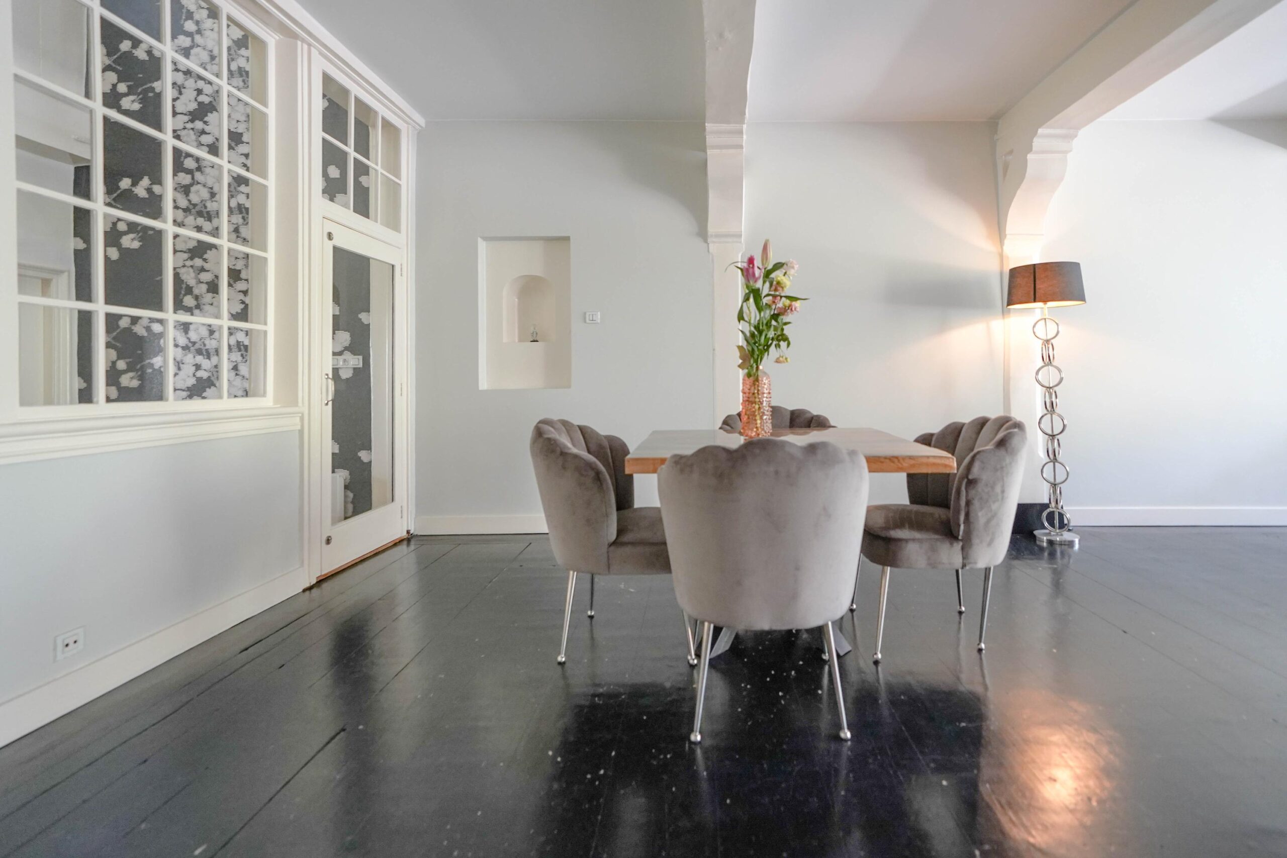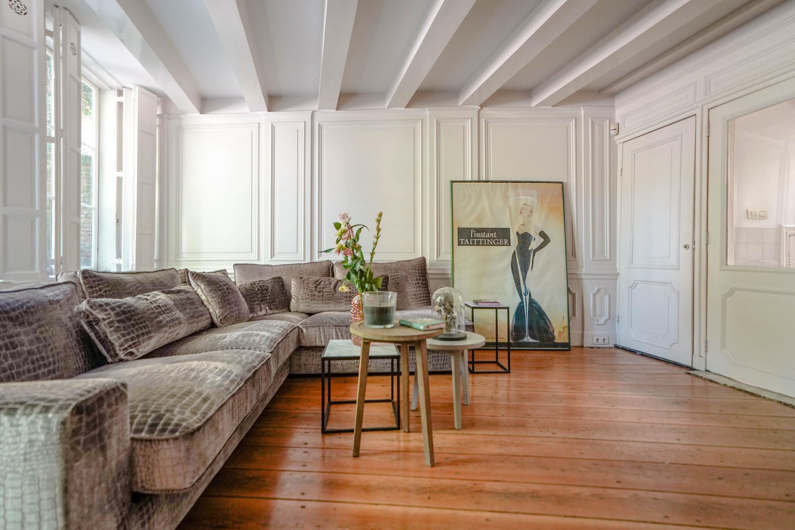 Het voorhuis is het oorspronkelijke hoofdhuis. Op de begane grond is een winkel gevestigd (kan in verhuurde staat worden gekocht) en hier vindt je nu op de 1e etage de woonkamer van maar liefst 70 m² van waar je uitkijkt over de Rijn en het Stadhuisplein. Aan de achterzijde ligt de woonkeuken met ruimte. Veel ruimte. Met 50 m², lange werkbladen en een eettafel met plek voor 12 is dit nu het hart van het huis. Vanuit hier is ook een van de doorgangen naar het achterhuis langs de binnenplaats wat voor veel lichtinval zorgt. Een etage hoger zijn de slaapverdiepingen. Hier is de woning afgepeld tot de structuur met de prachtige houten sporenkap vol in het zicht. Tussen de sporen zijn hoge Velux ramen aangebracht die zorgen voor een fraaie lichtinval op elk moment van de dag. Aan voorzijde vindt je verdeeld over twee verdiepingen drie slaapkamers, een badkamer en vooral veel bergruimte met inbouwkasten en een linnenkamer. Aan achterzijde beslaat de master bedroom met badkamer ensuite de gehele kap met een nok van maar liefst 8 meter hoog.