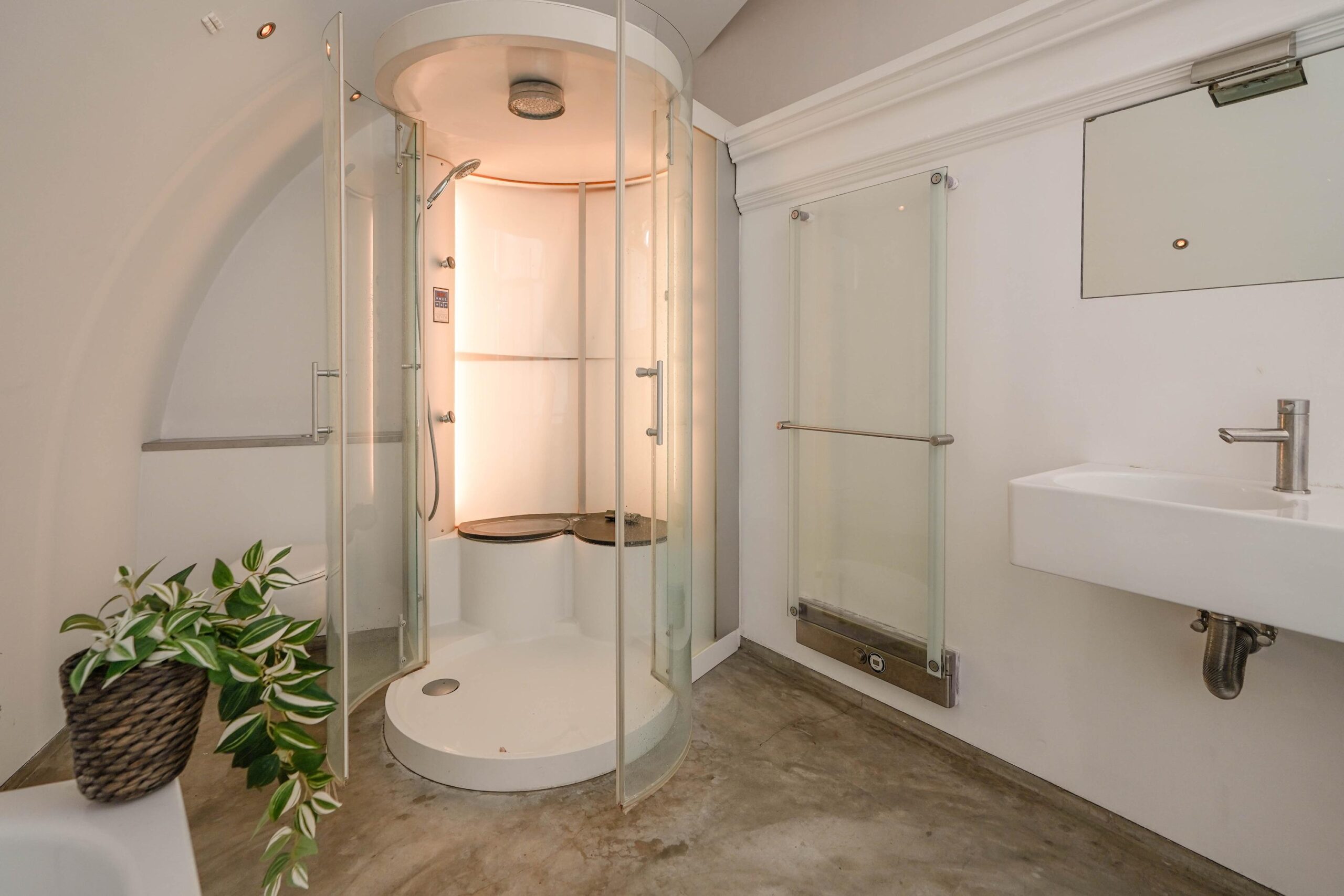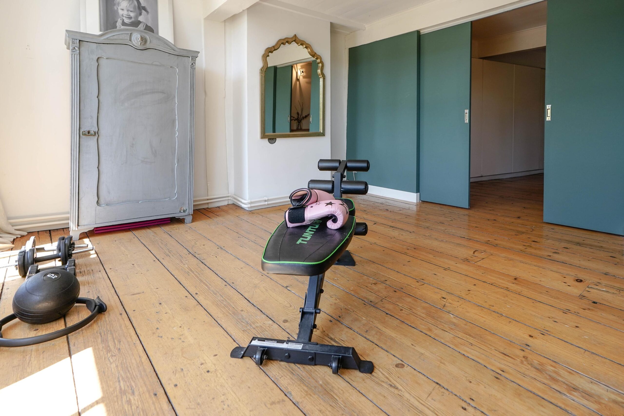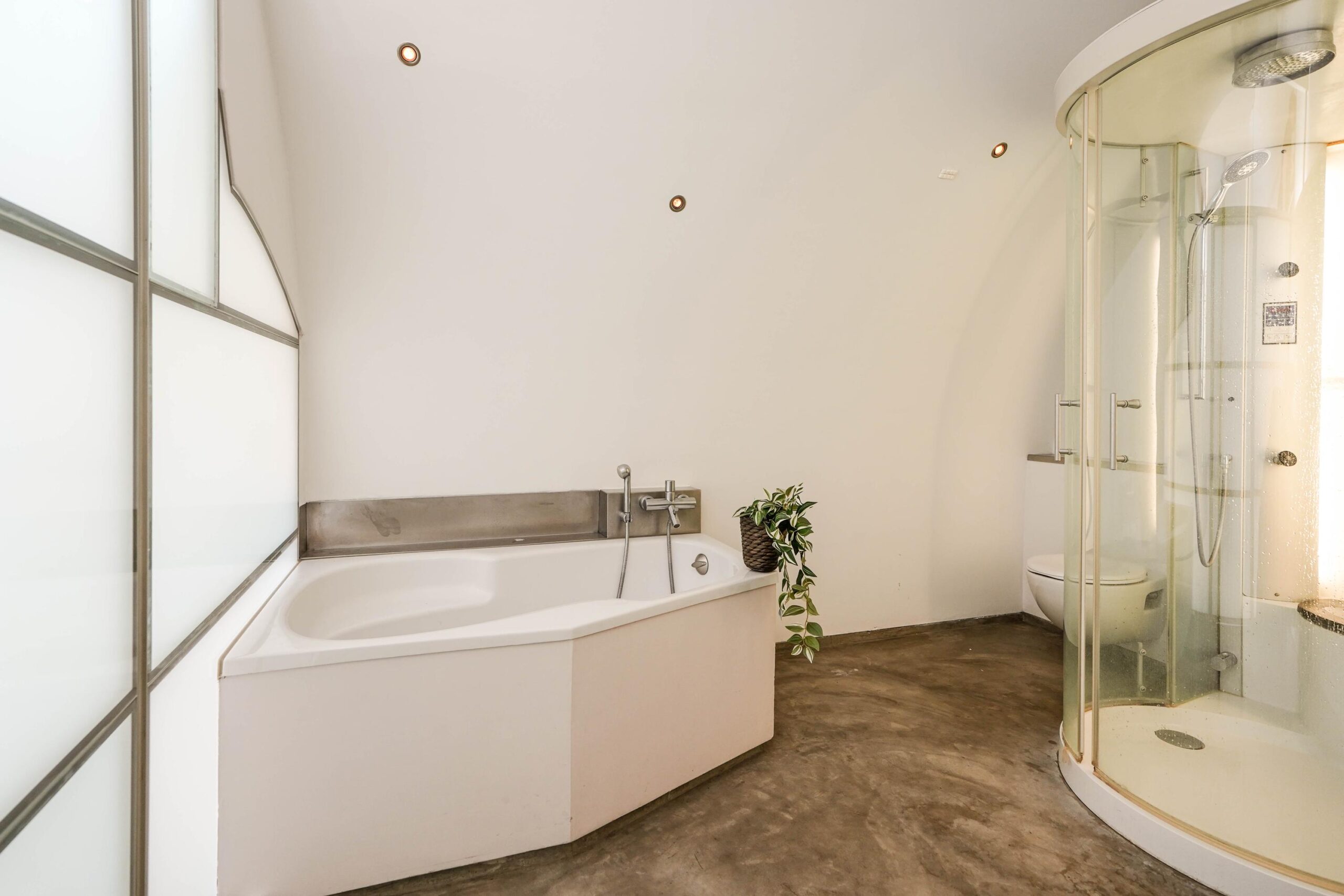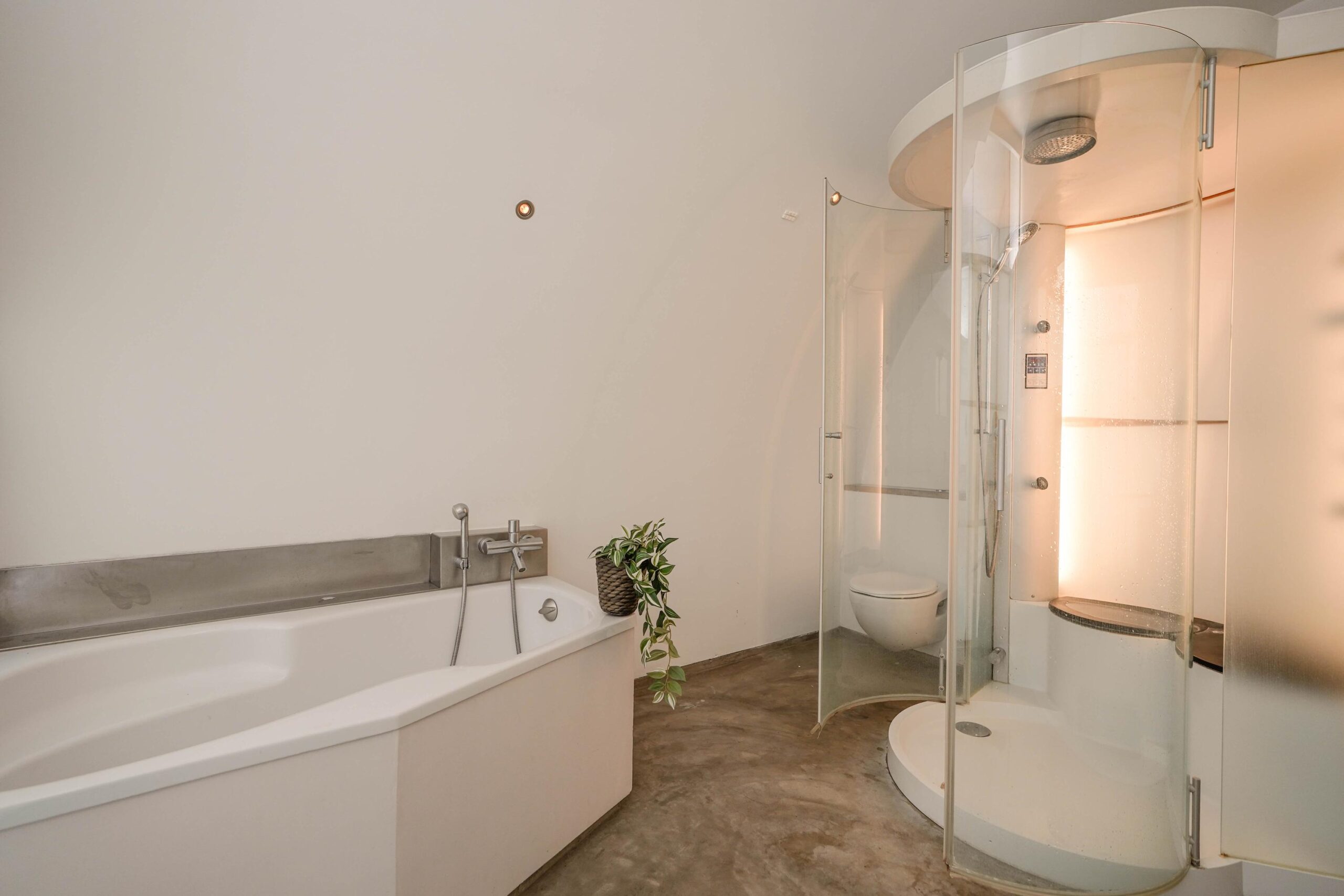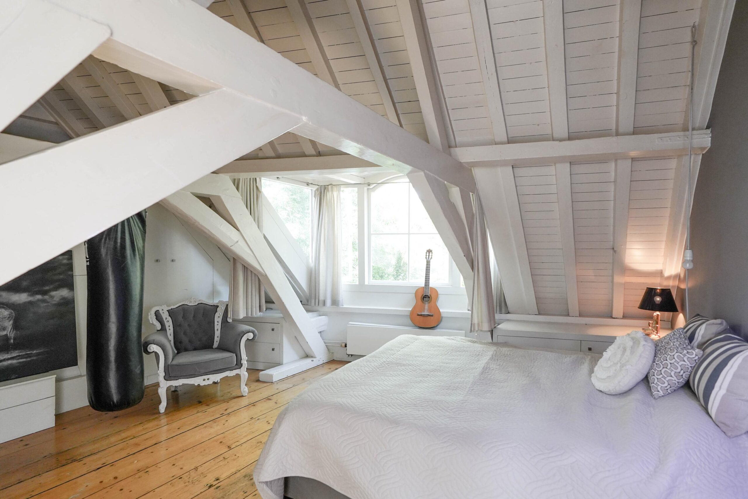 Het voorhuis is het oorspronkelijke hoofdhuis. Op de begane grond is een winkel gevestigd (kan in verhuurde staat worden gekocht) en hier vindt je nu op de 1e etage de woonkamer van maar liefst 70 m² van waar je uitkijkt over de Rijn en het Stadhuisplein. Aan de achterzijde ligt de woonkeuken met ruimte. Veel ruimte. Met 50 m², lange werkbladen en een eettafel met plek voor 12 is dit nu het hart van het huis. Vanuit hier is ook een van de doorgangen naar het achterhuis langs de binnenplaats wat voor veel lichtinval zorgt. Een etage hoger zijn de slaapverdiepingen. Hier is de woning afgepeld tot de structuur met de prachtige houten sporenkap vol in het zicht. Tussen de sporen zijn hoge Velux ramen aangebracht die zorgen voor een fraaie lichtinval op elk moment van de dag. Aan voorzijde vindt je verdeeld over twee verdiepingen drie slaapkamers, een badkamer en vooral veel bergruimte met inbouwkasten en een linnenkamer. Aan achterzijde beslaat de master bedroom met badkamer ensuite de gehele kap met een nok van maar liefst 8 meter hoog.