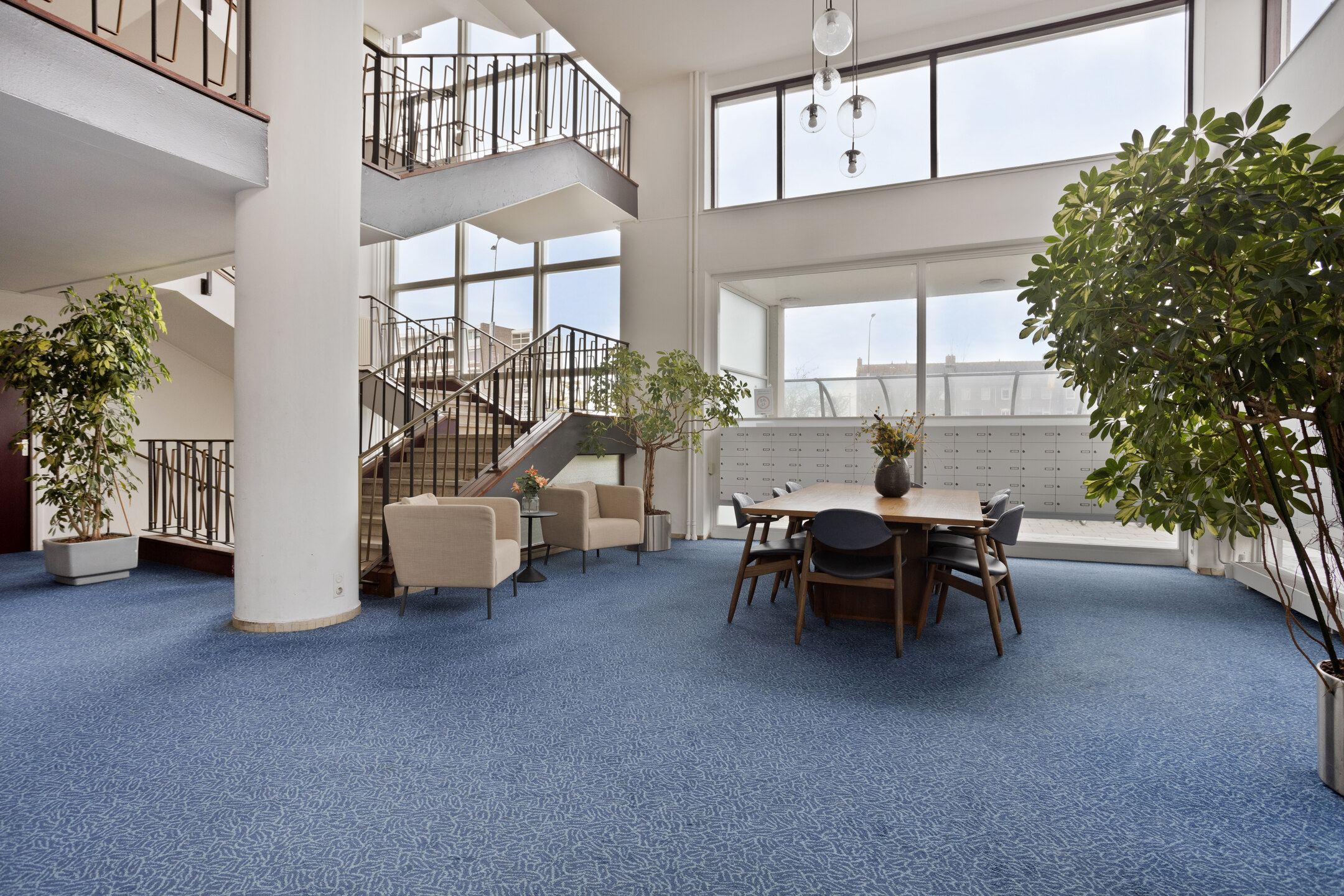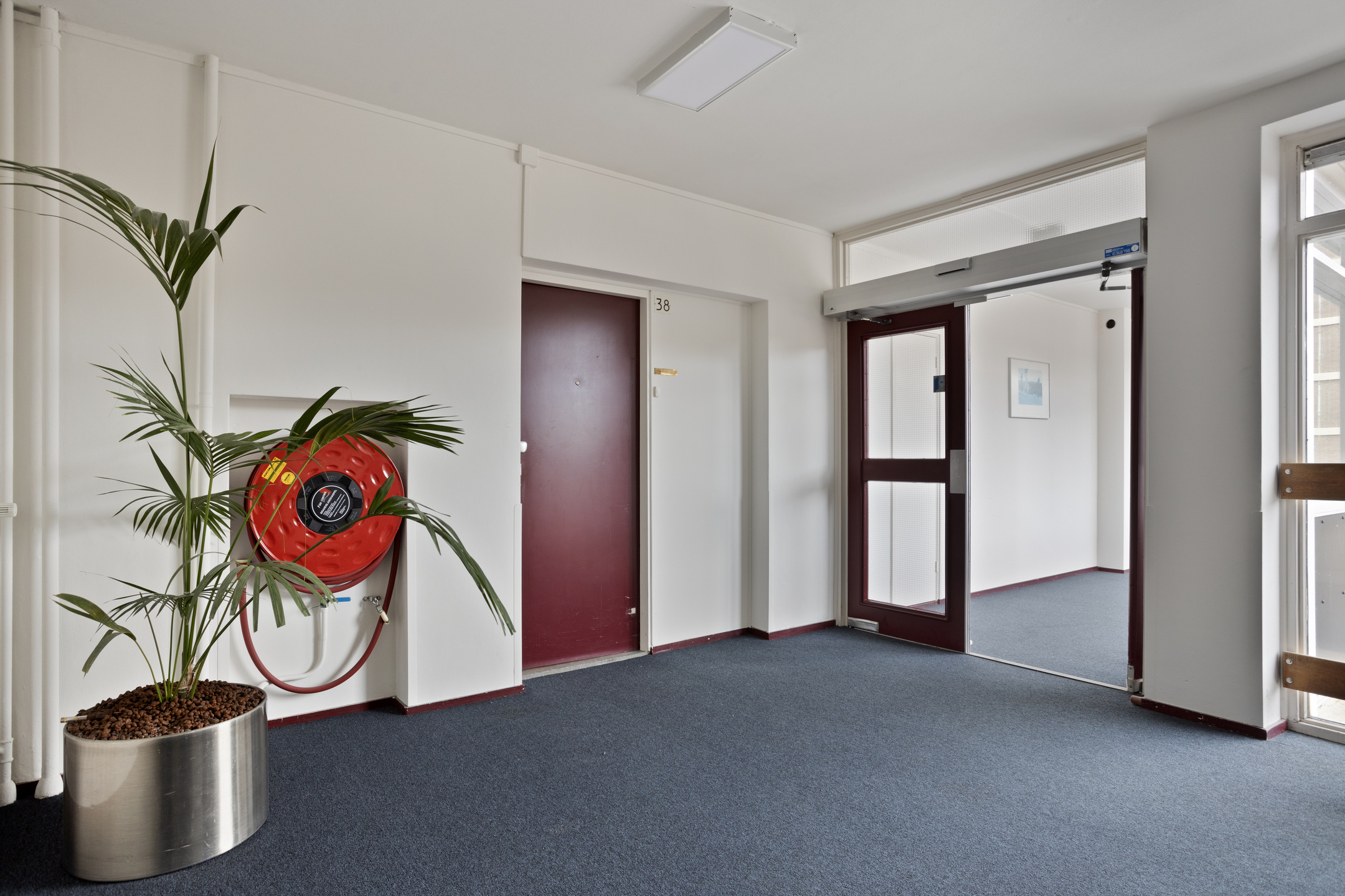 Centrale hal met huismeester, trappenhuis, lift en gang naar de bergingen.