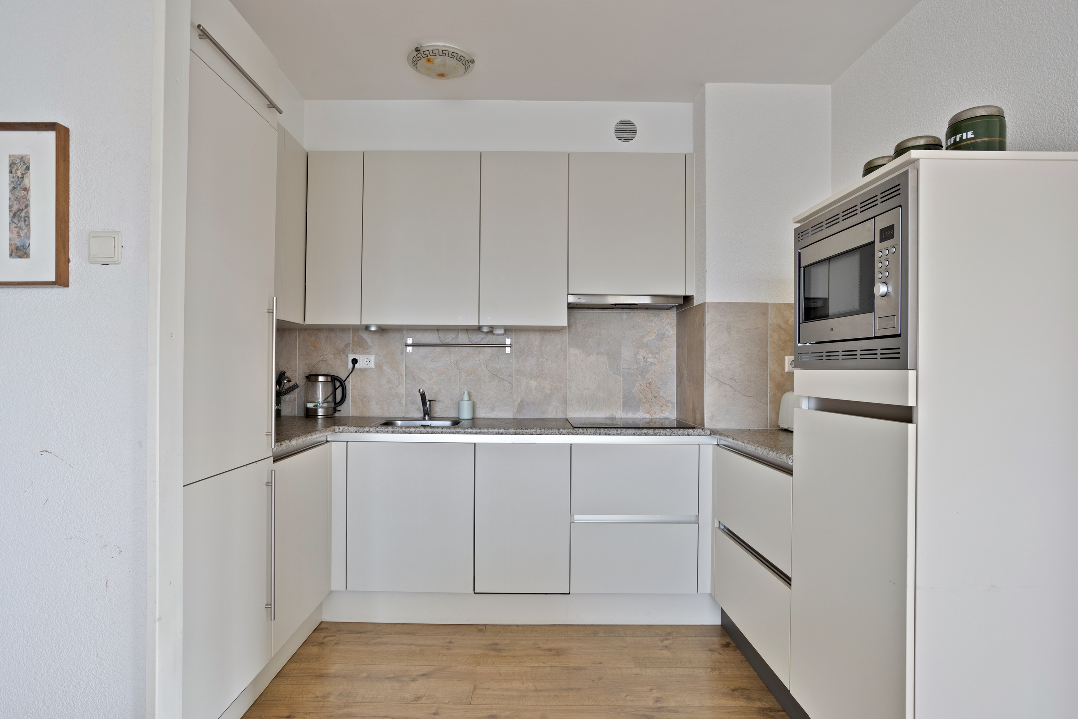 Hal met intercom en toegang tot alle vertrekken. Zeer ruime woongedeelte met open keuken, eetgedeelte, zitgedeelte en balkon. Master bedroom en tweede slaapkamer, beide met toegang tot het tweede balkon. Recent geheel gemoderniseerde luxe badkamer met douche, wc en wastafel.