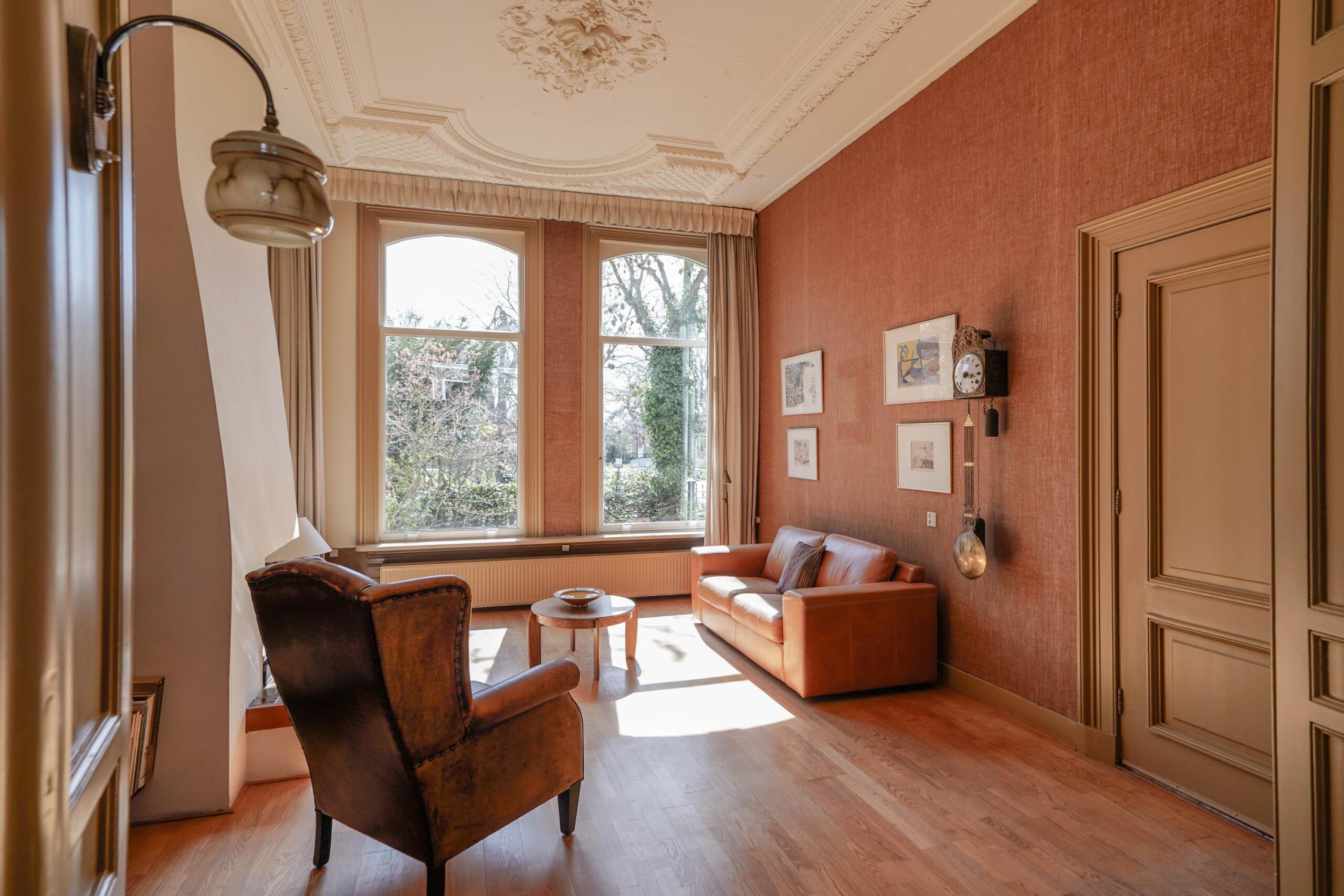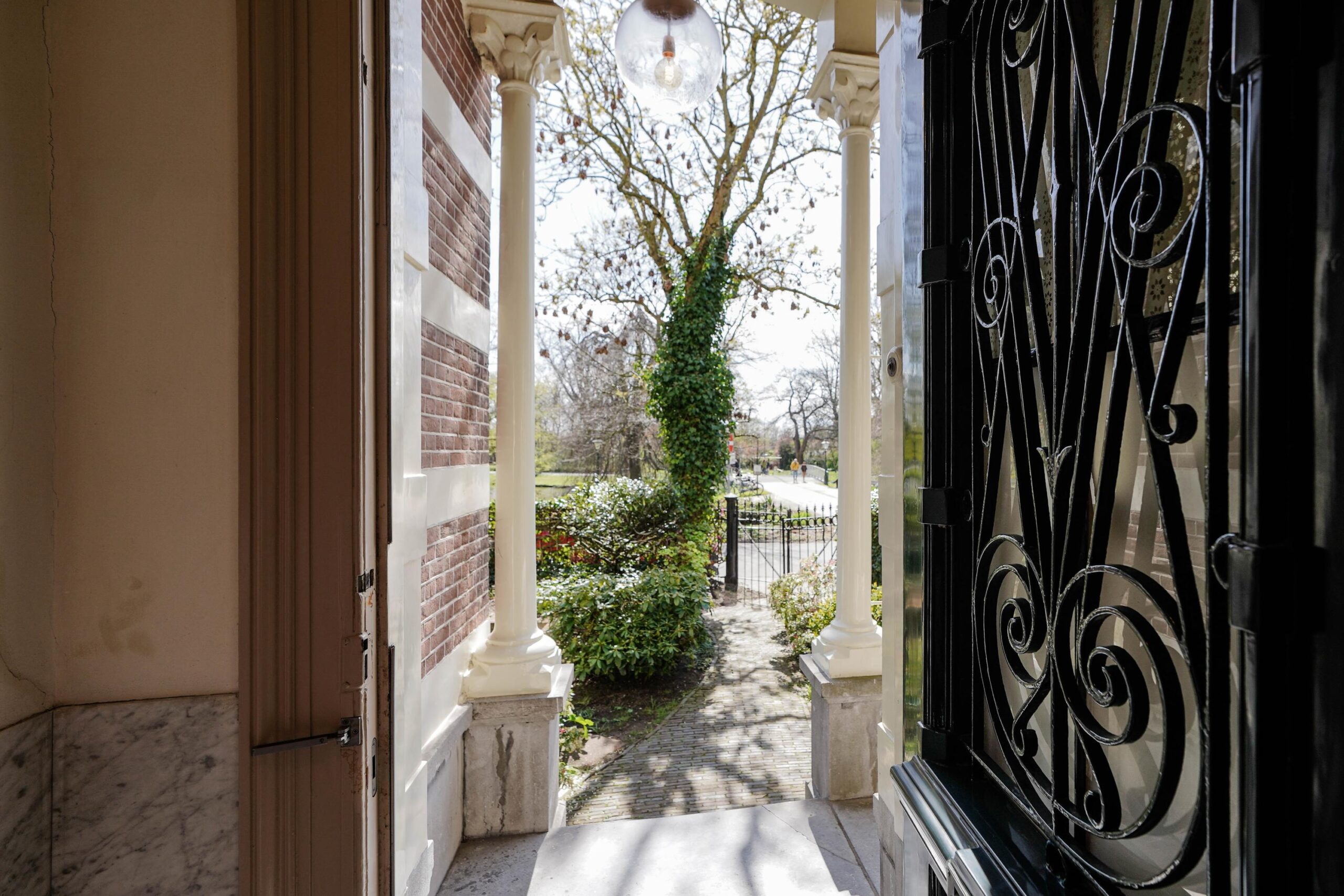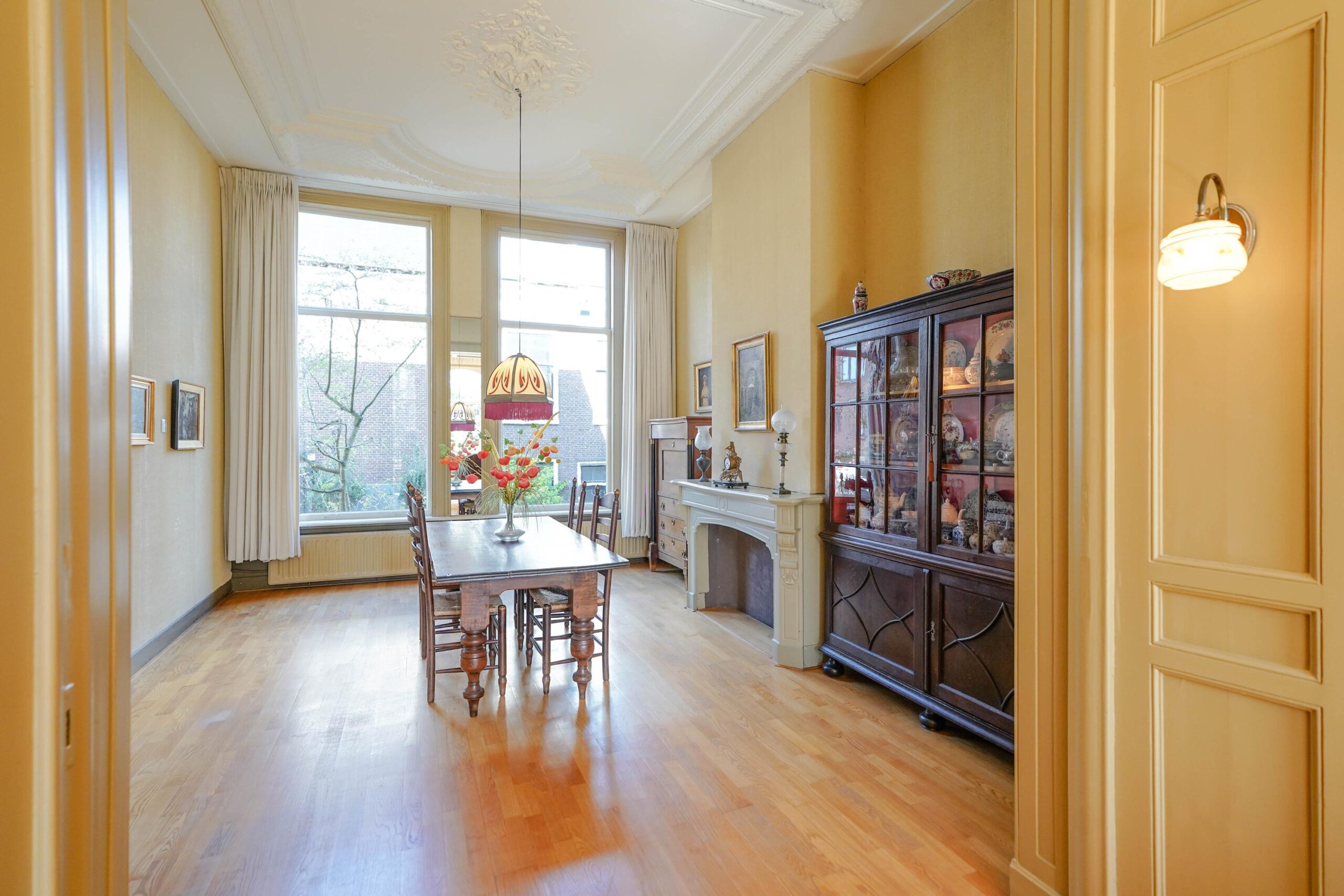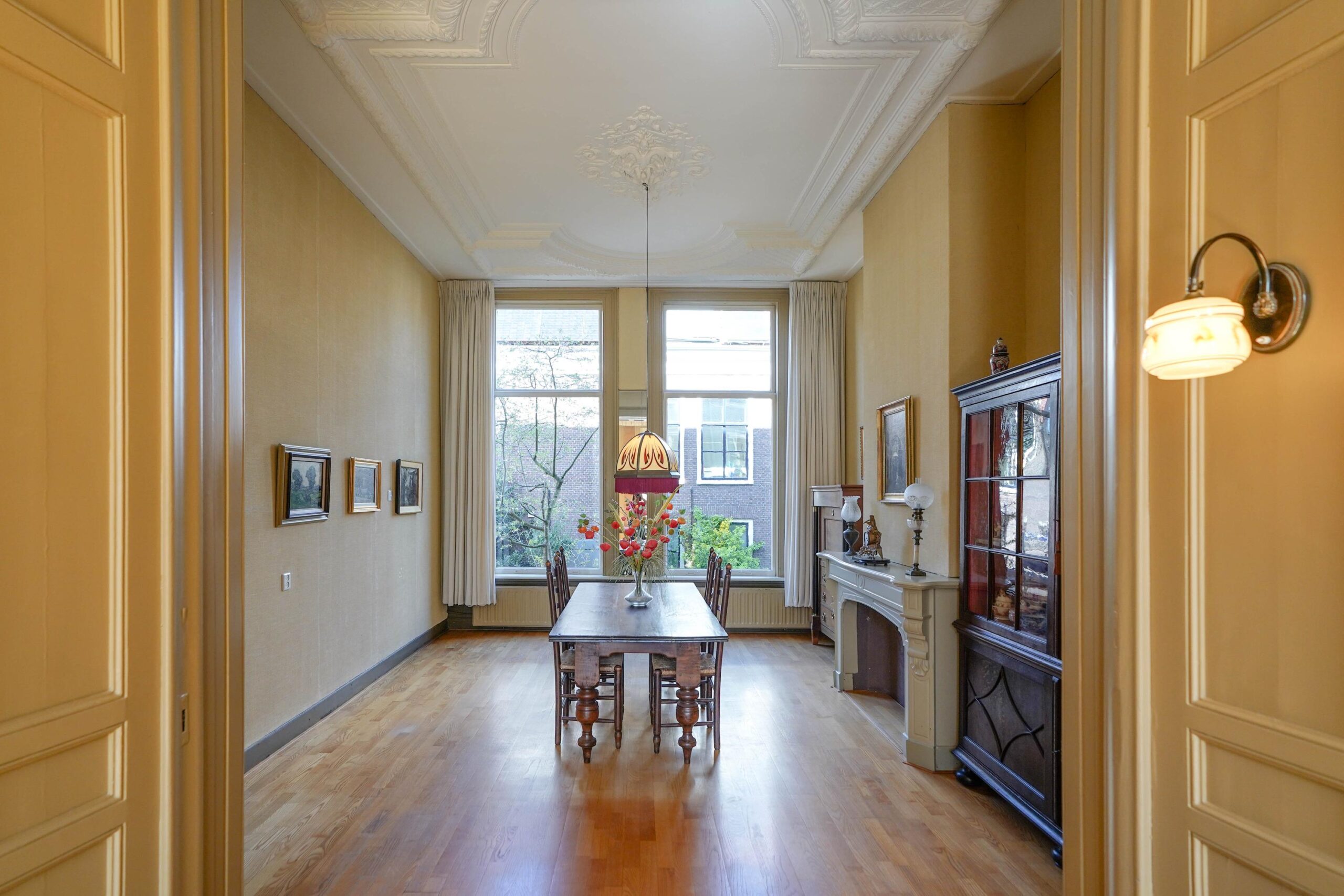 • De bel-etage, toegankelijk via de voortuin en de indrukwekkende entree met bordes. Hier werden de gasten ontvangen en was het de bedoeling dat ze werden geïmponeerd door de marmeren vloer in voorportaal en hal, het imposante trappenhuis en de hoge, rijkversierde plafonds en grote raampartijen in de kamer en suite. Hier vind je ook de ruime woonkeuken.
