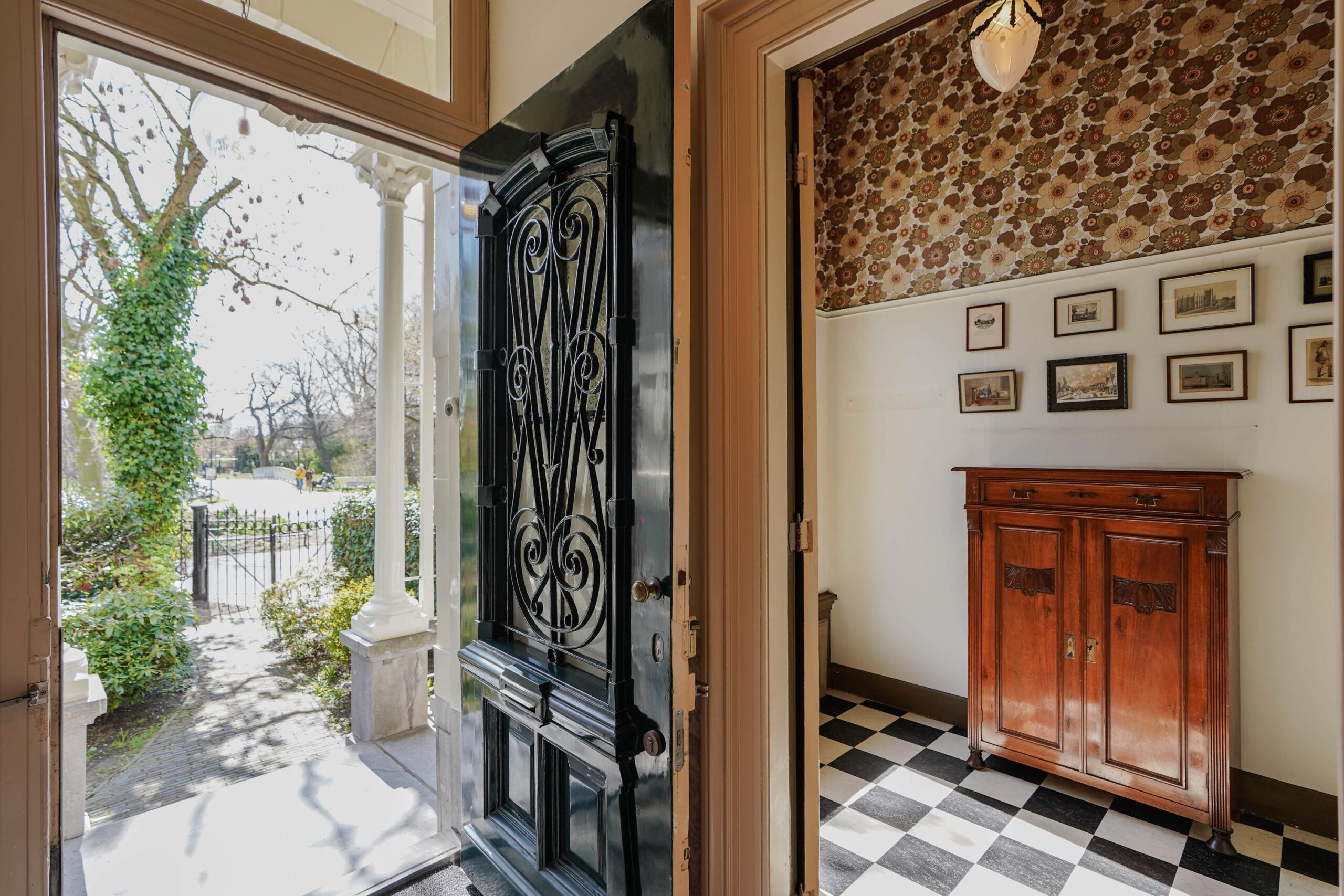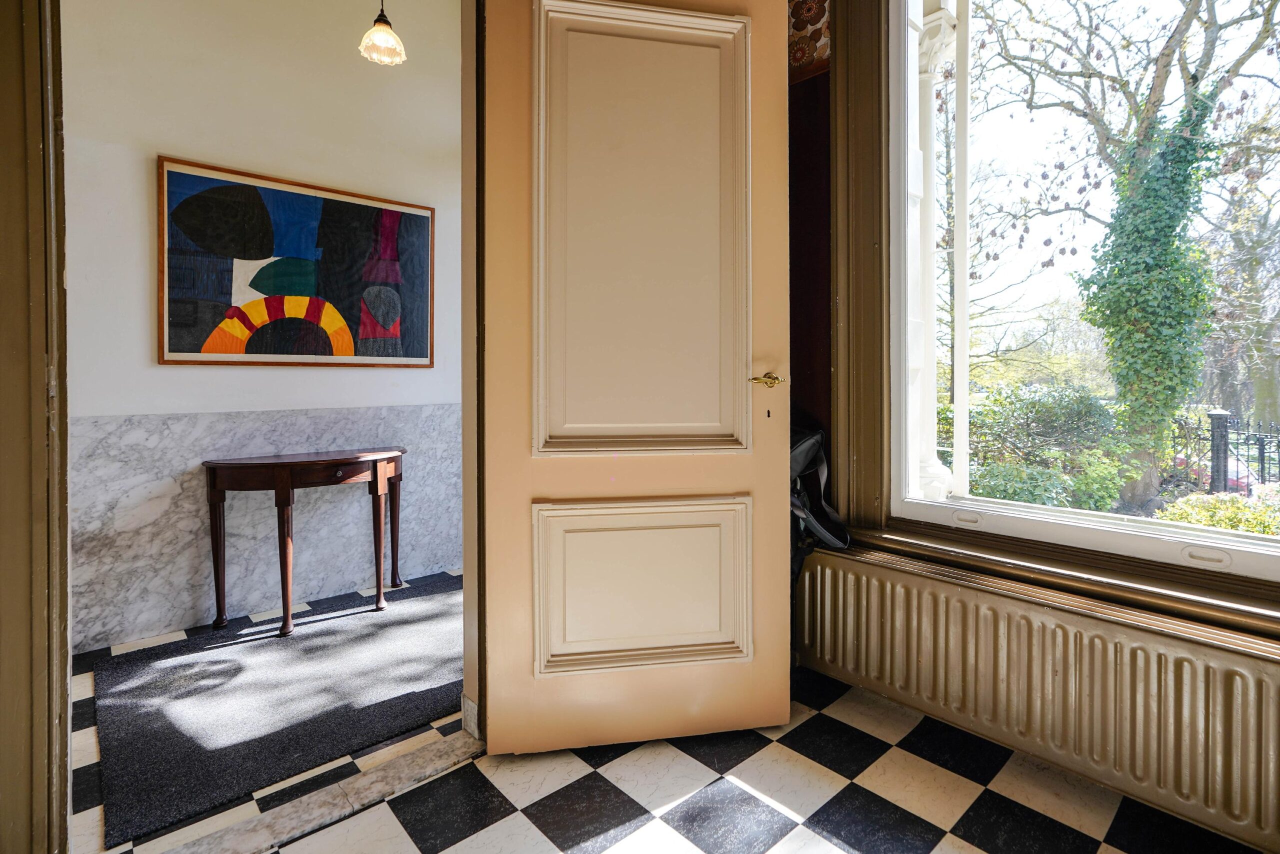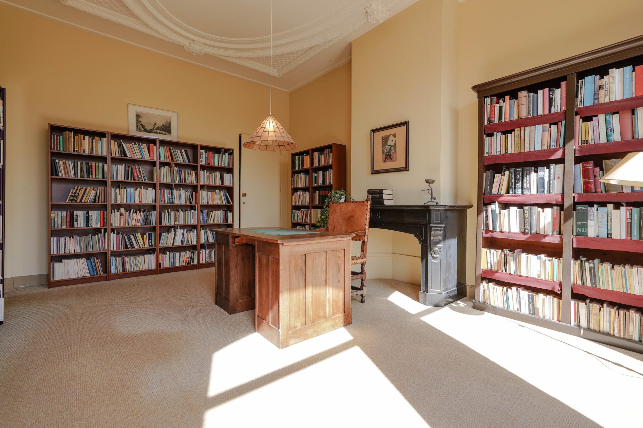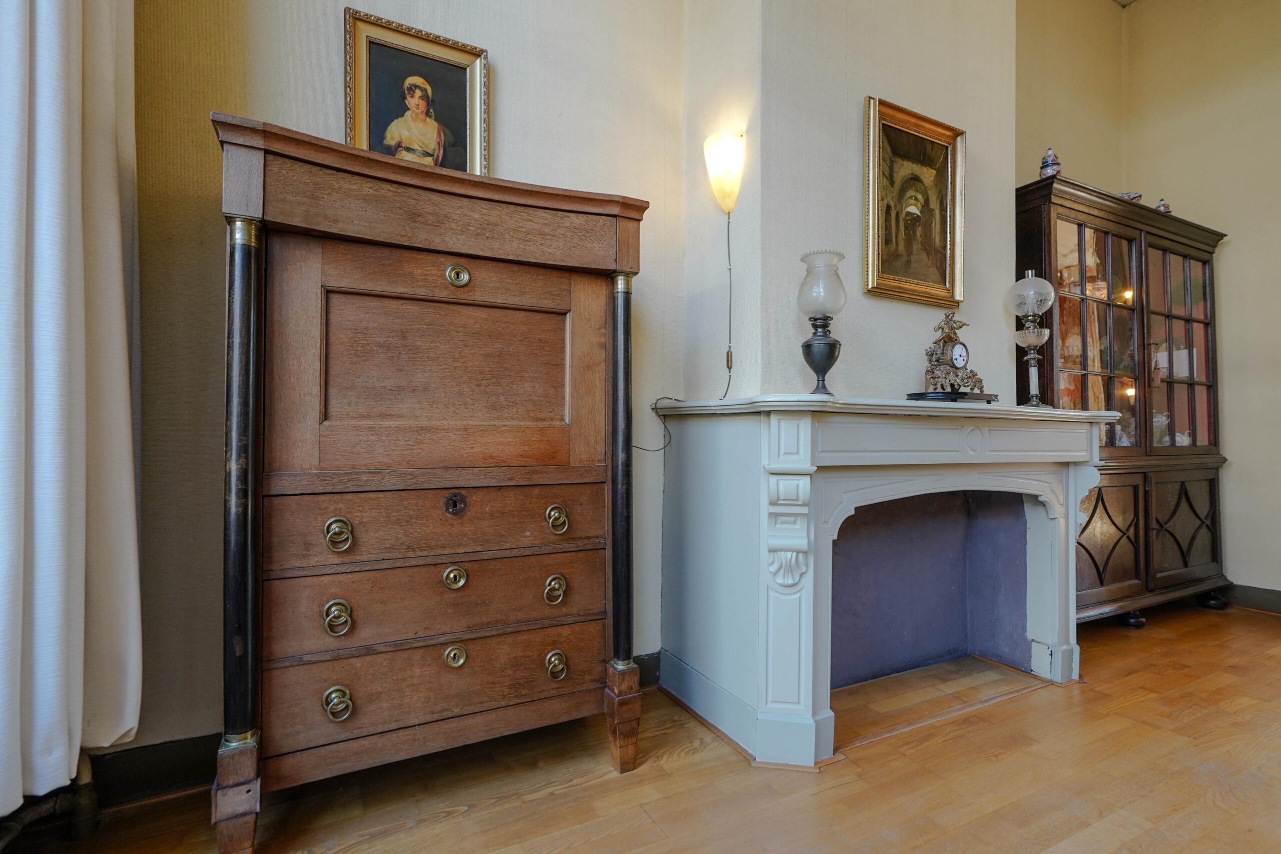 • De bel-etage, toegankelijk via de voortuin en de indrukwekkende entree met bordes. Hier werden de gasten ontvangen en was het de bedoeling dat ze werden geïmponeerd door de marmeren vloer in voorportaal en hal, het imposante trappenhuis en de hoge, rijkversierde plafonds en grote raampartijen in de kamer en suite. Hier vind je ook de ruime woonkeuken.
