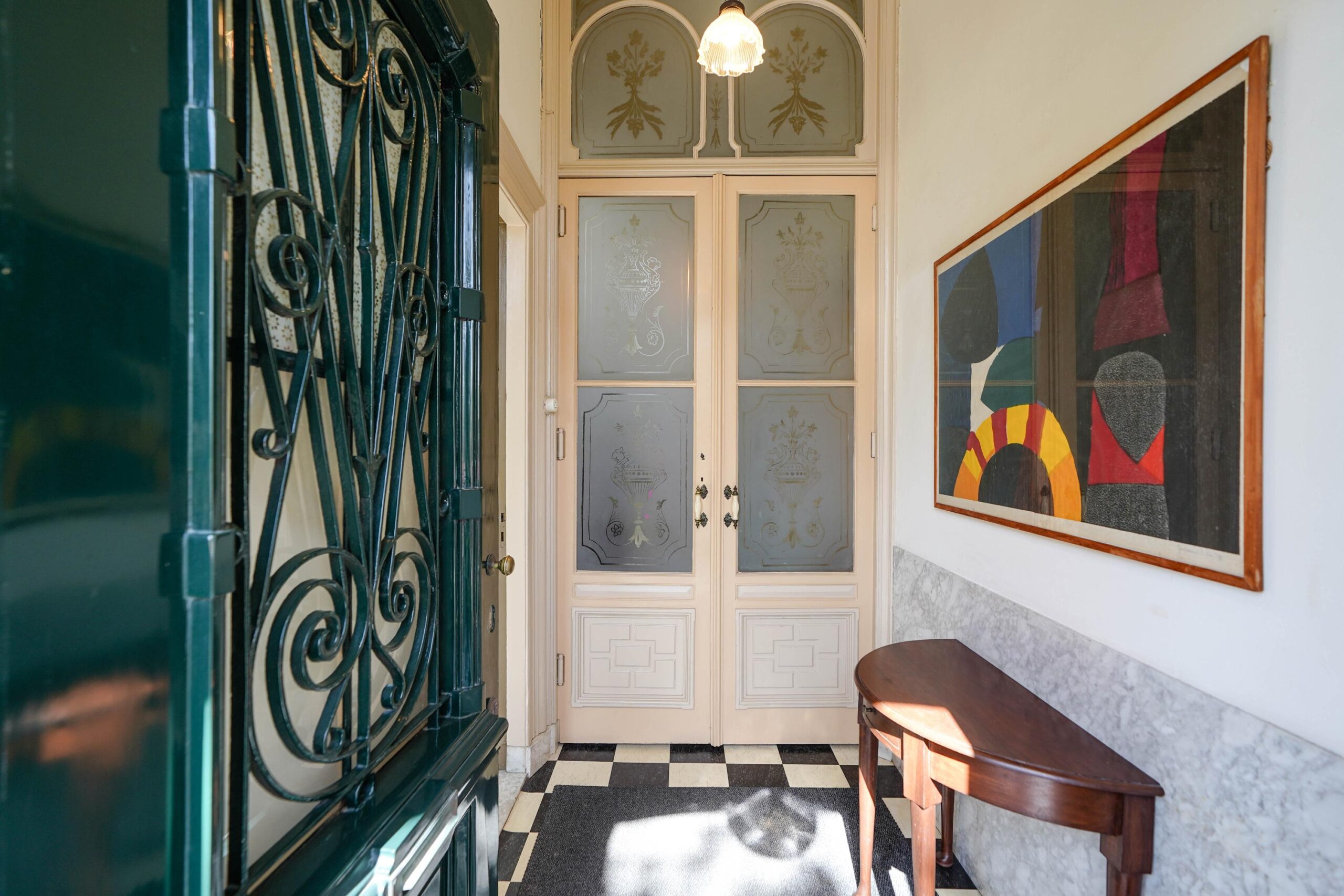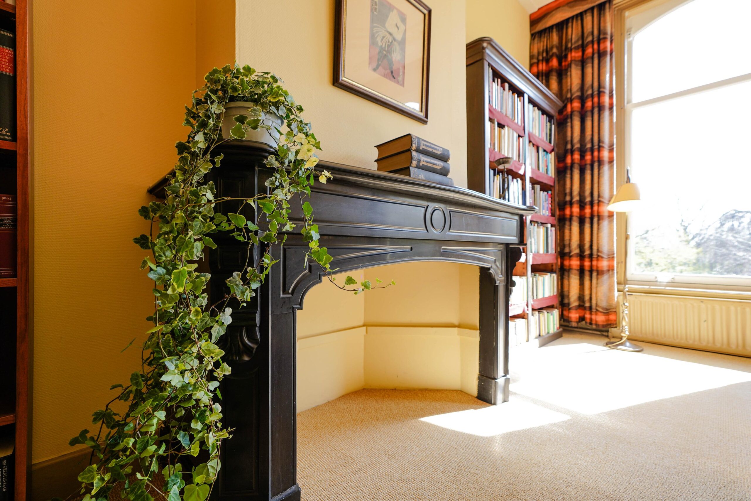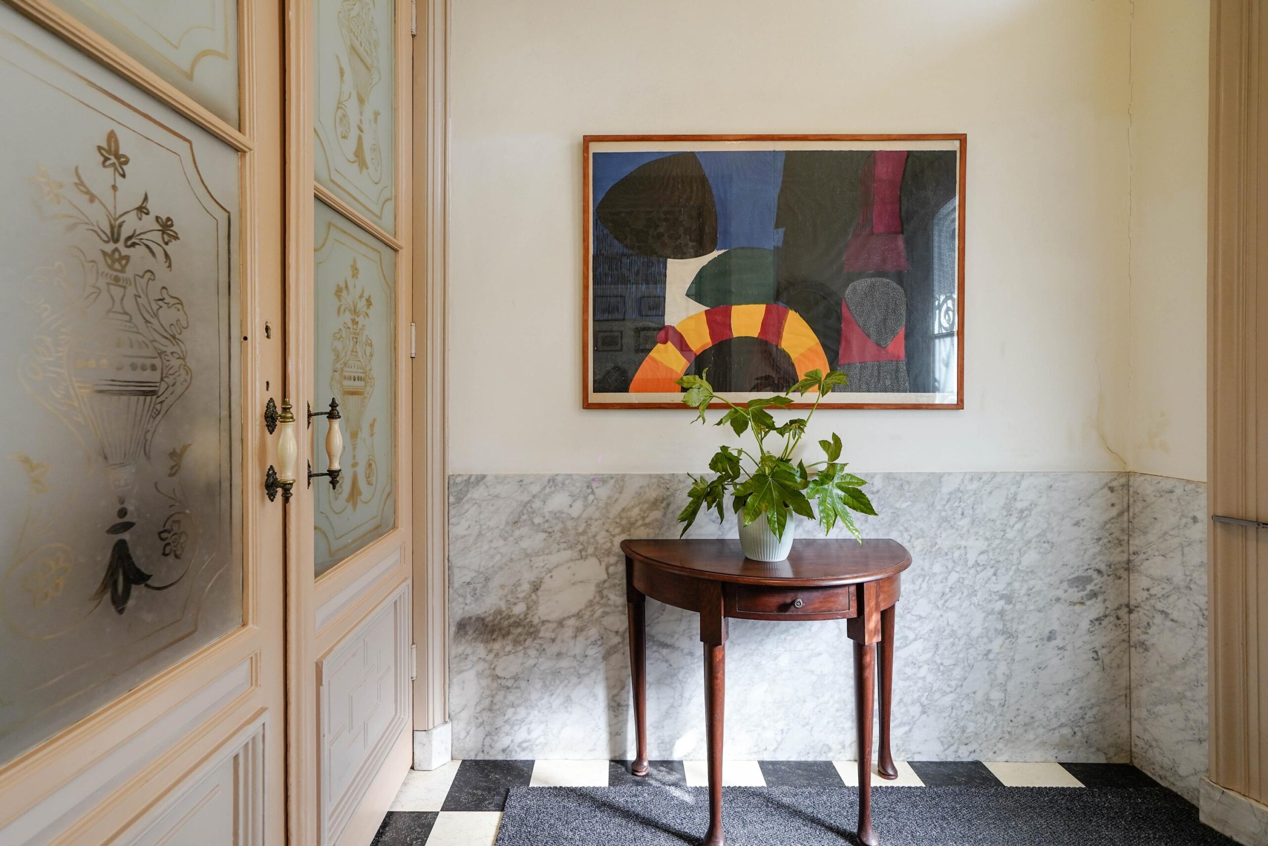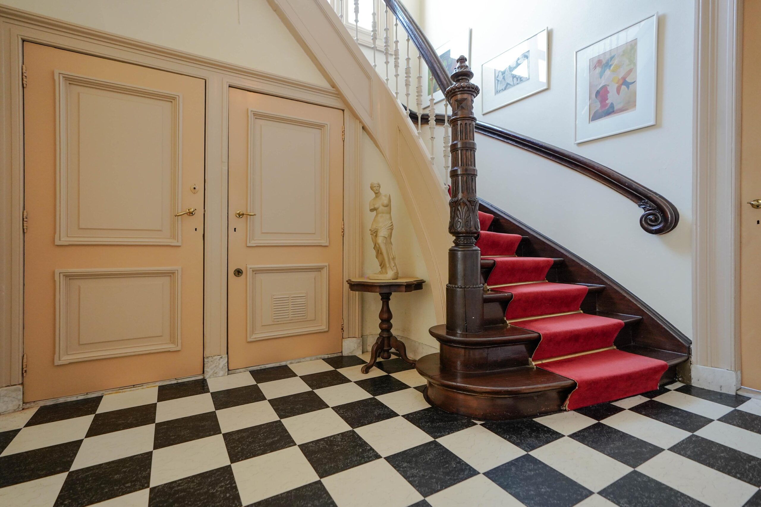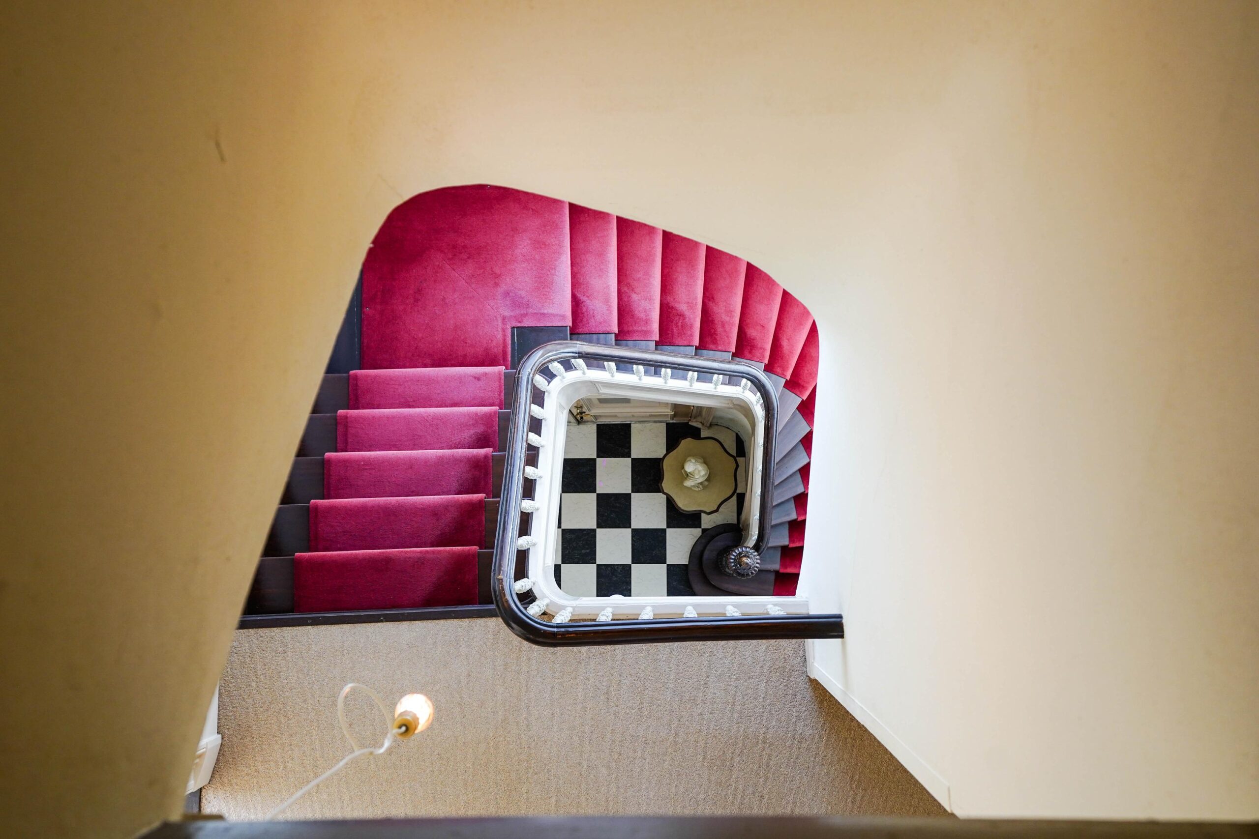 • De bel-etage, toegankelijk via de voortuin en de indrukwekkende entree met bordes. Hier werden de gasten ontvangen en was het de bedoeling dat ze werden geïmponeerd door de marmeren vloer in voorportaal en hal, het imposante trappenhuis en de hoge, rijkversierde plafonds en grote raampartijen in de kamer en suite. Hier vind je ook de ruime woonkeuken.