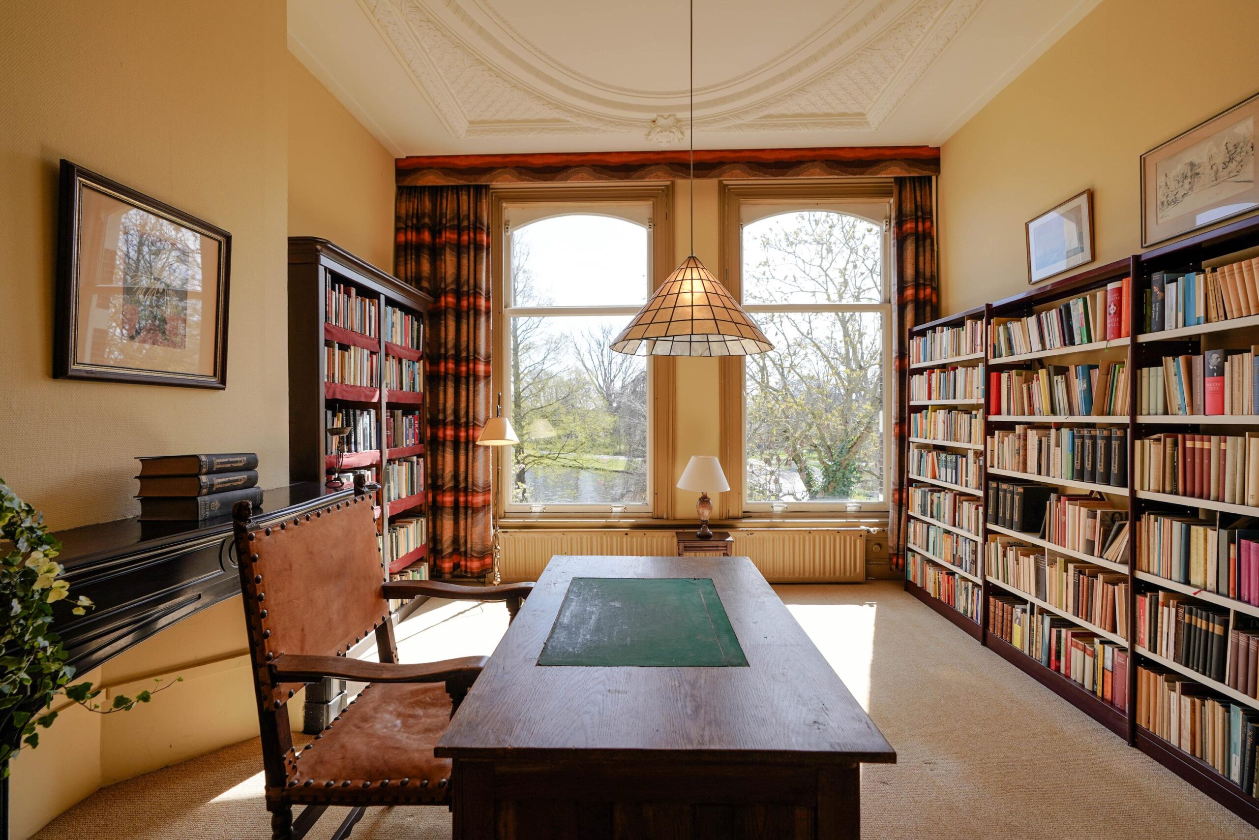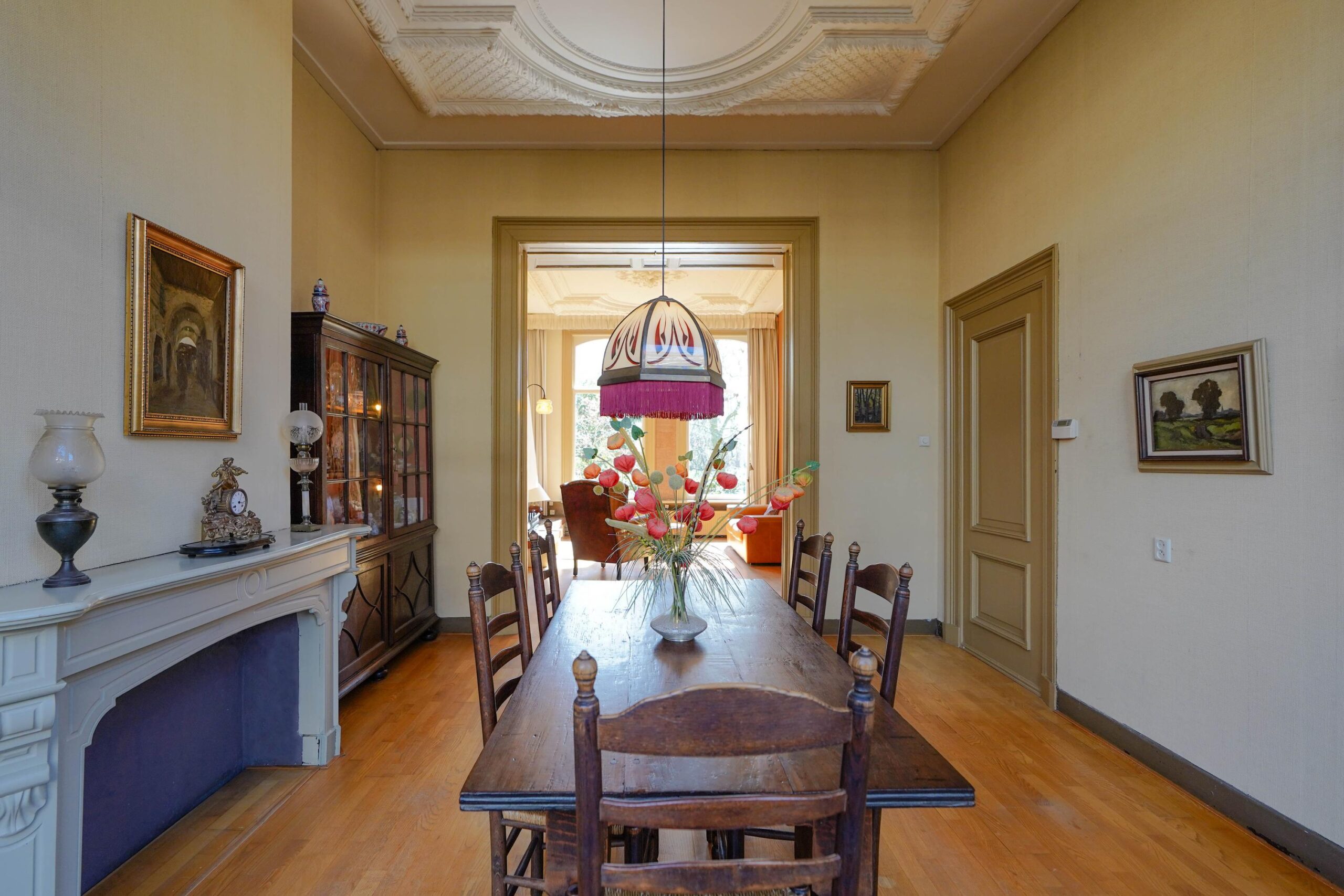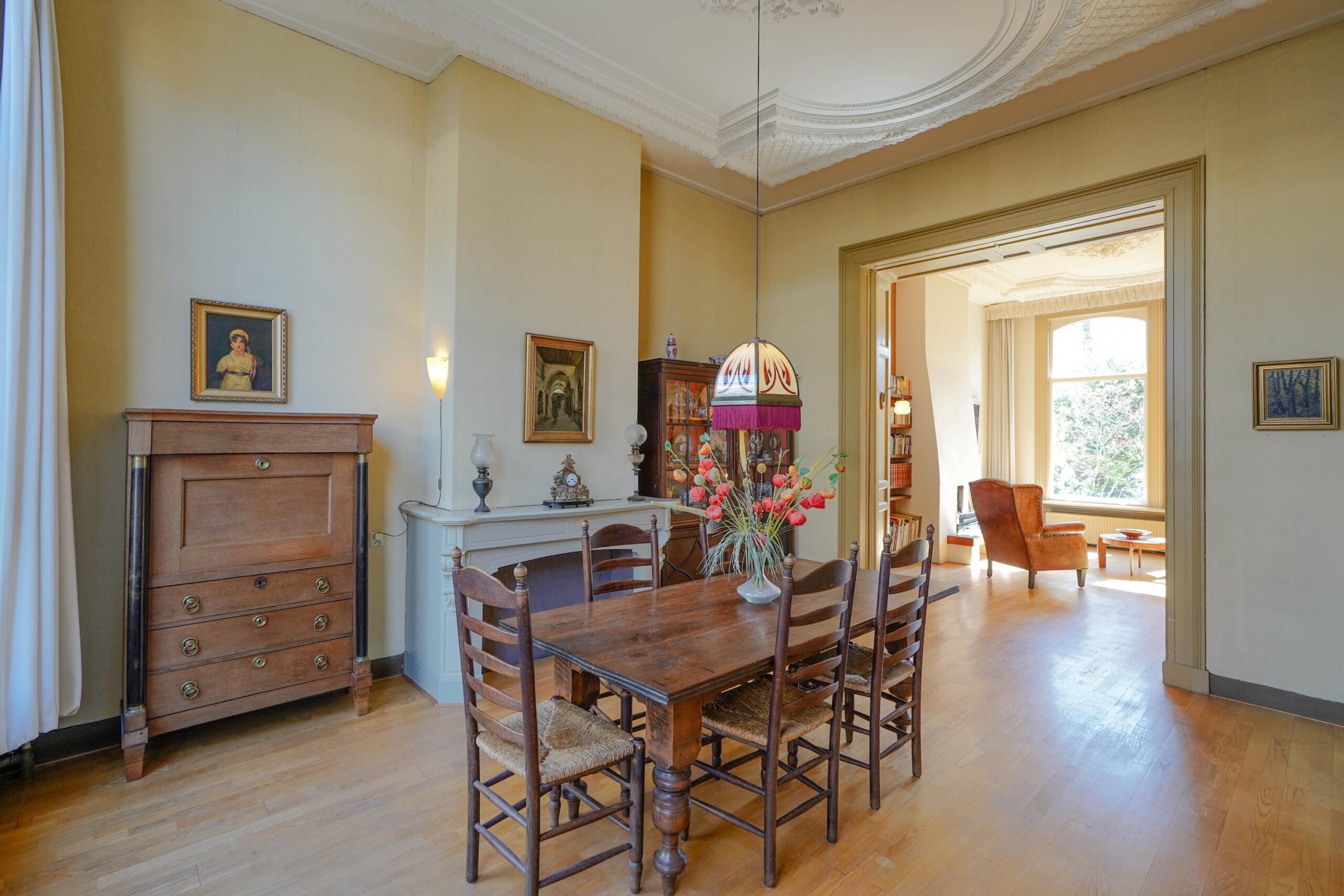 • De eerste etage met de slaapvertrekken en de badkamer van de familie. Ook deze verdieping kenmerkt zich door het hoge, rijk versierde stuc plafond, de grote raampartijen en vooral het grandioze uitzicht over het park.