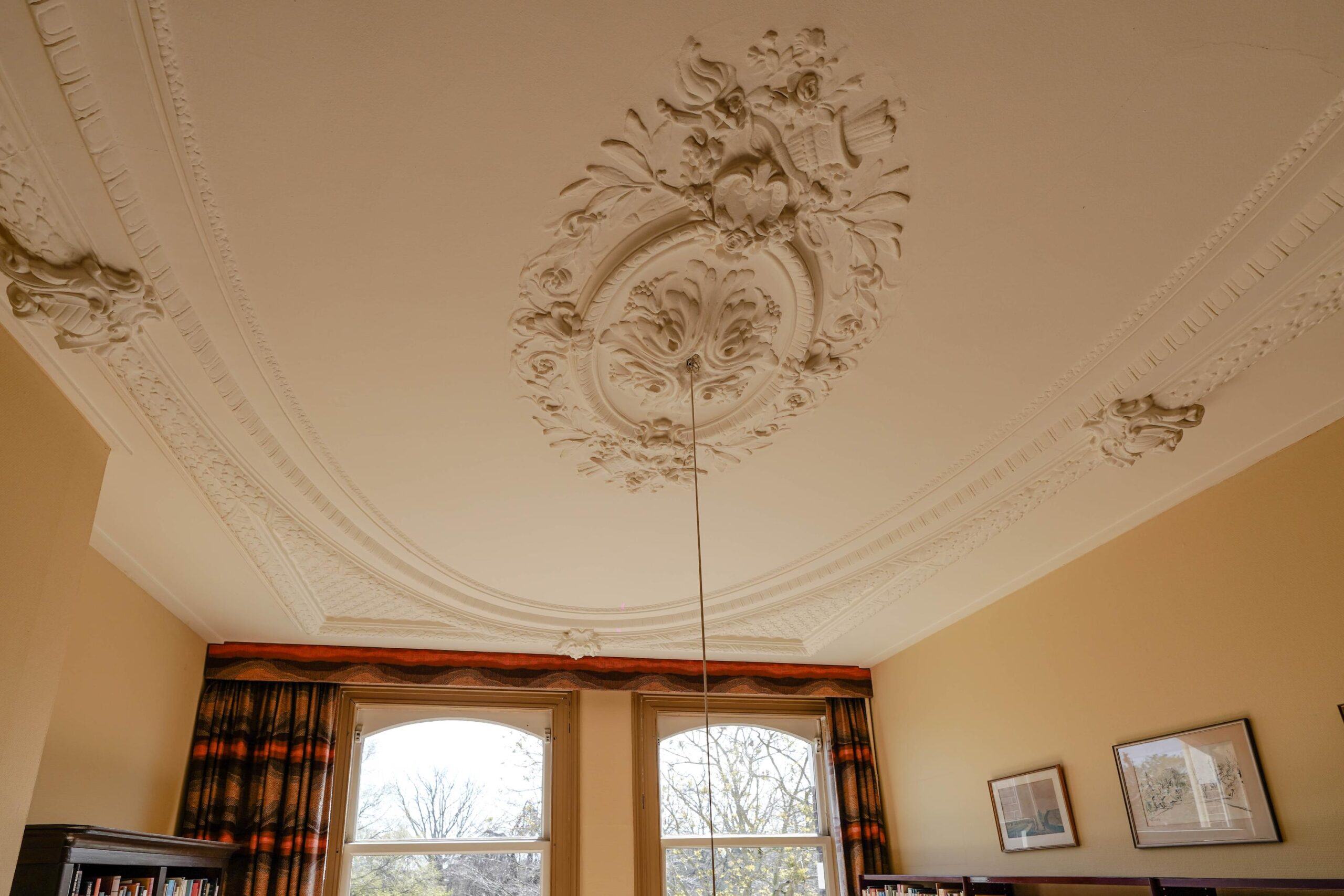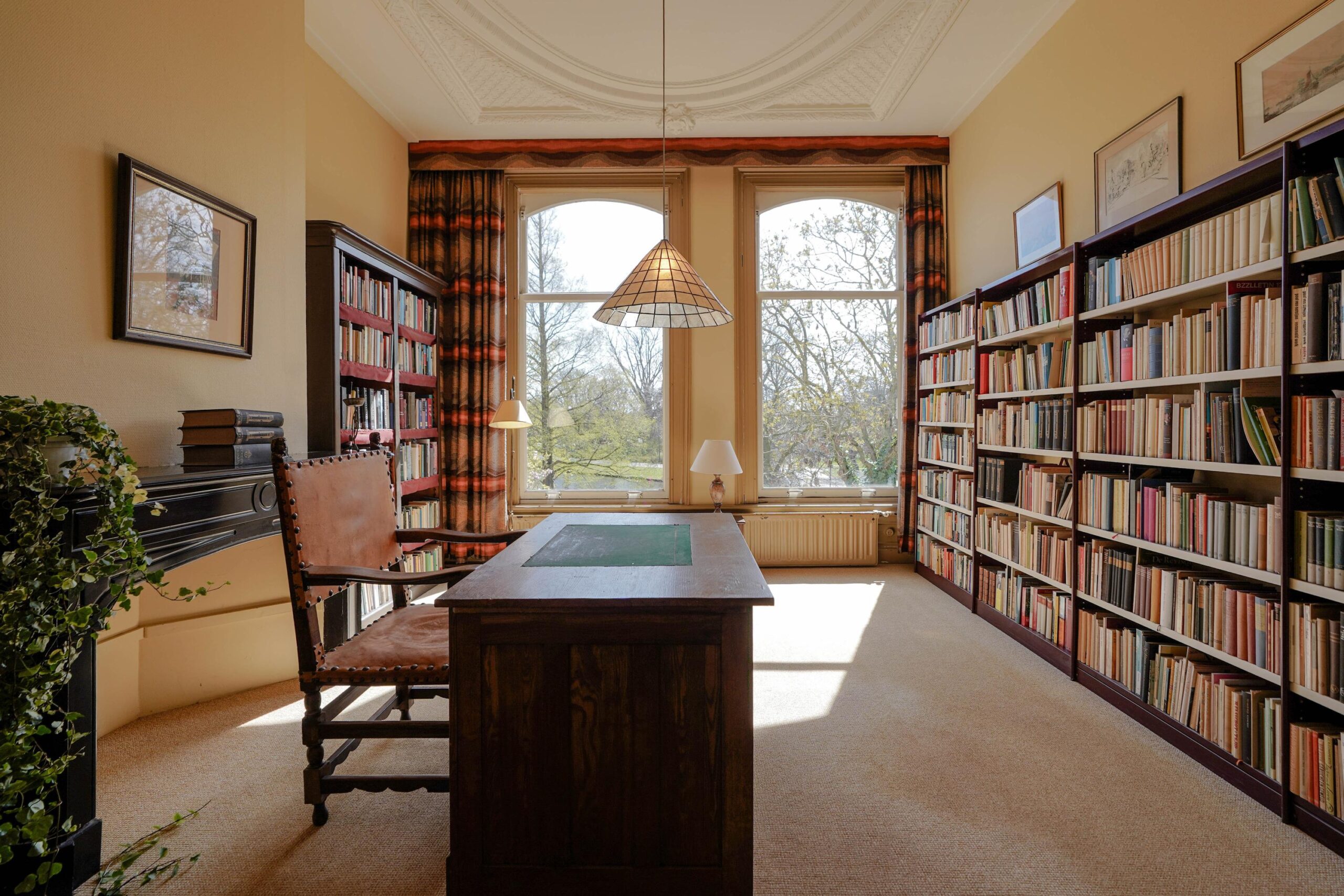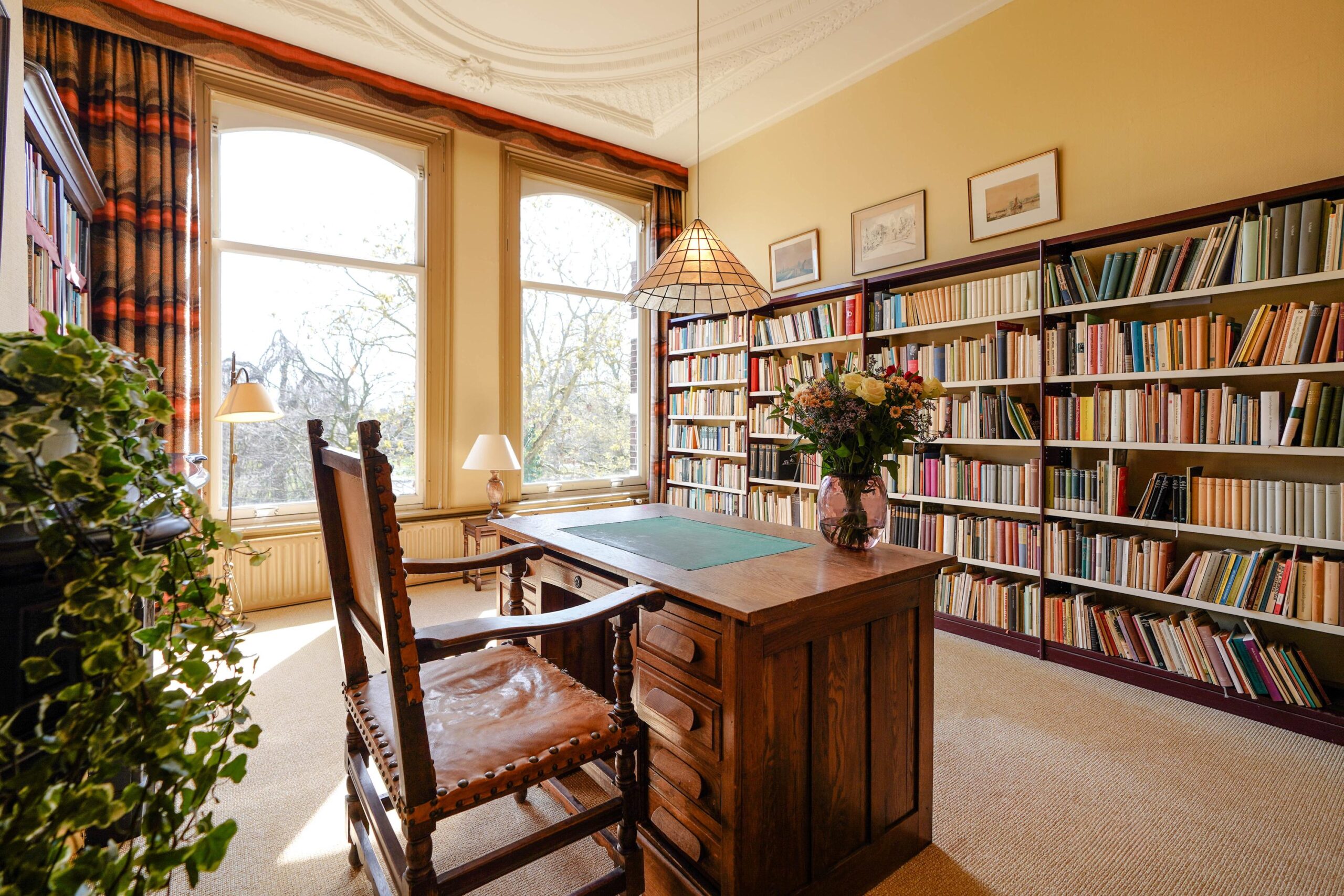 • De eerste etage met de slaapvertrekken en de badkamer van de familie. Ook deze verdieping kenmerkt zich door het hoge, rijk versierde stuc plafond, de grote raampartijen en vooral het grandioze uitzicht over het park.