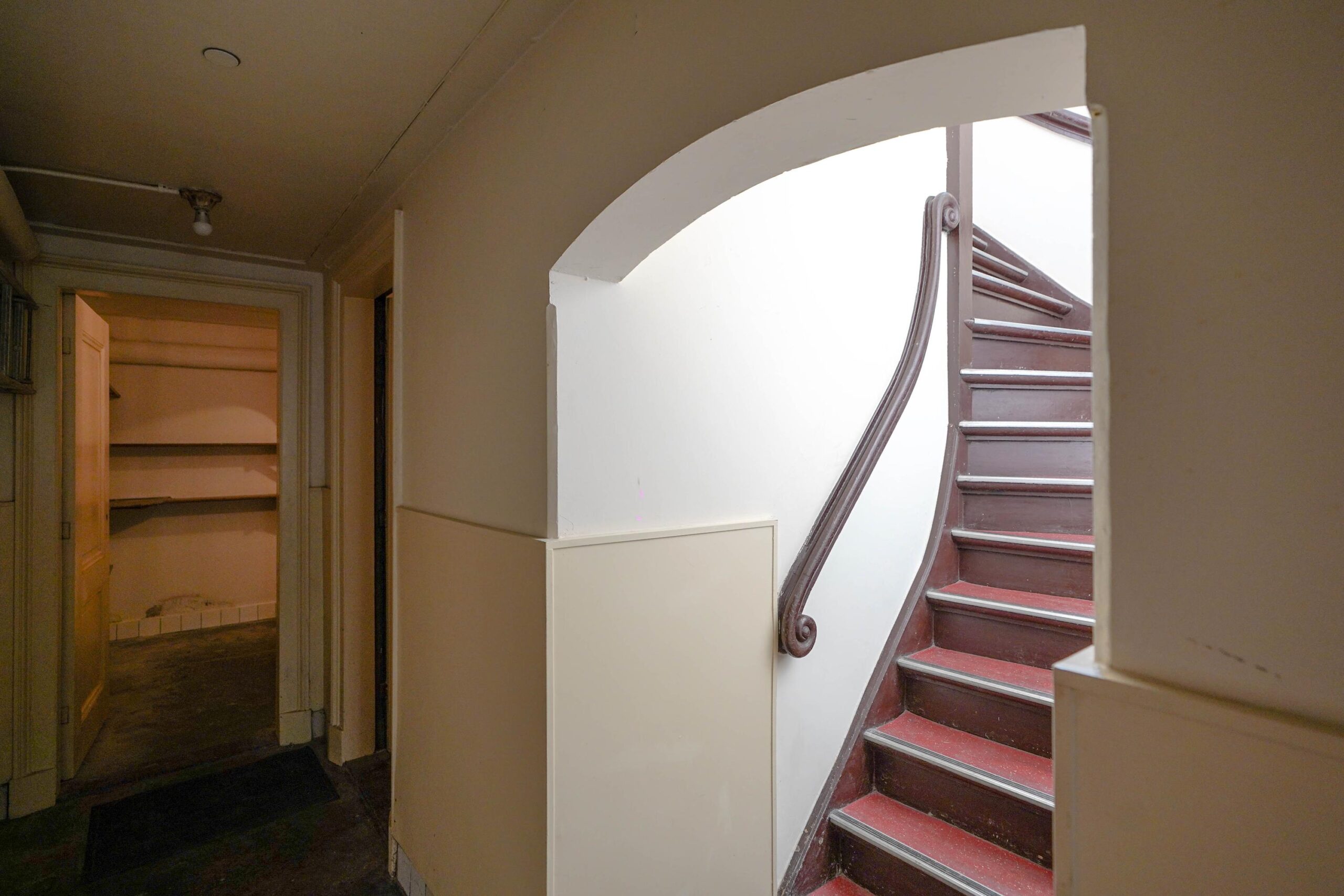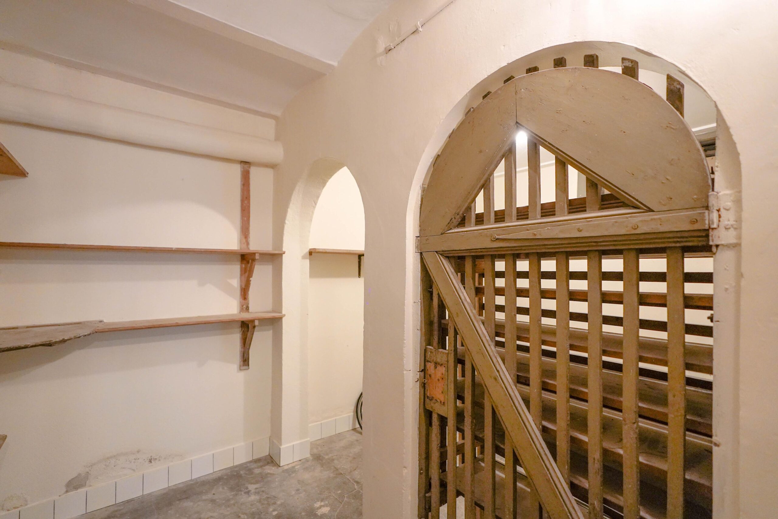 • Het souterrain met achteringang, waar in het verleden vooral het personeel kwam. Hier werd gekookt (de grote schouw is nog aanwezig), gewassen en wijn en voorraden opgeslagen.?