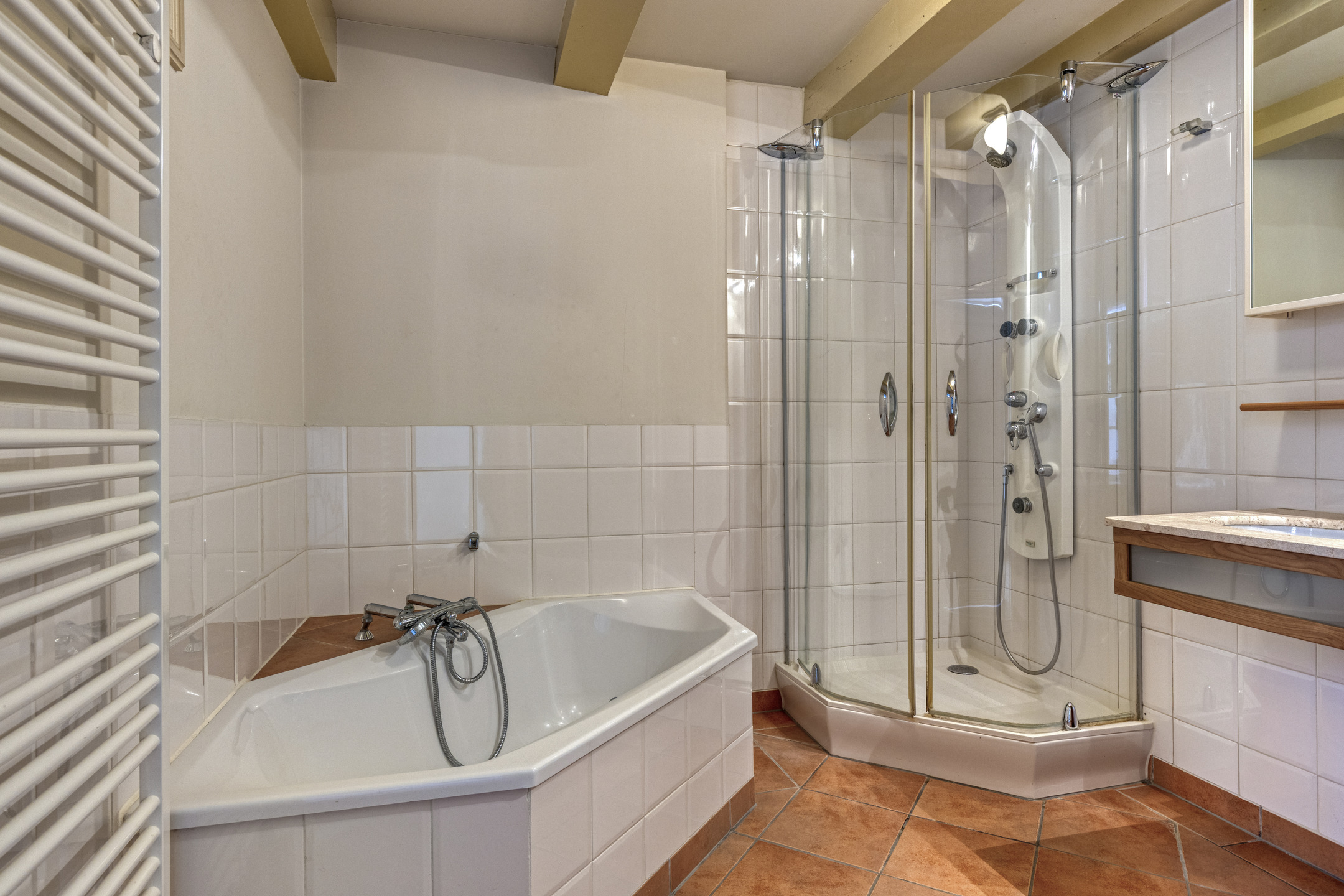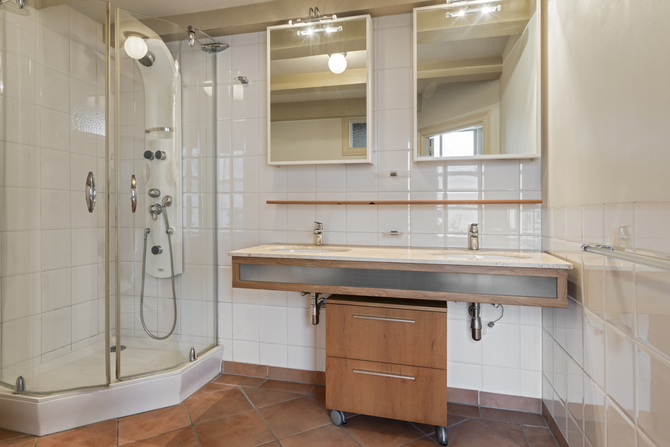 Aan de achterzijde tref je een extra ruimte dat geschikt is als bijvoorbeeld werk-/hobbykamer. De badkamer is voorzien van en ligbad, douche en dubbele vaste wastafel. Via een ruime hal met veel kastruimte is er een doorgang naar de sfeervolle slaapkamer.