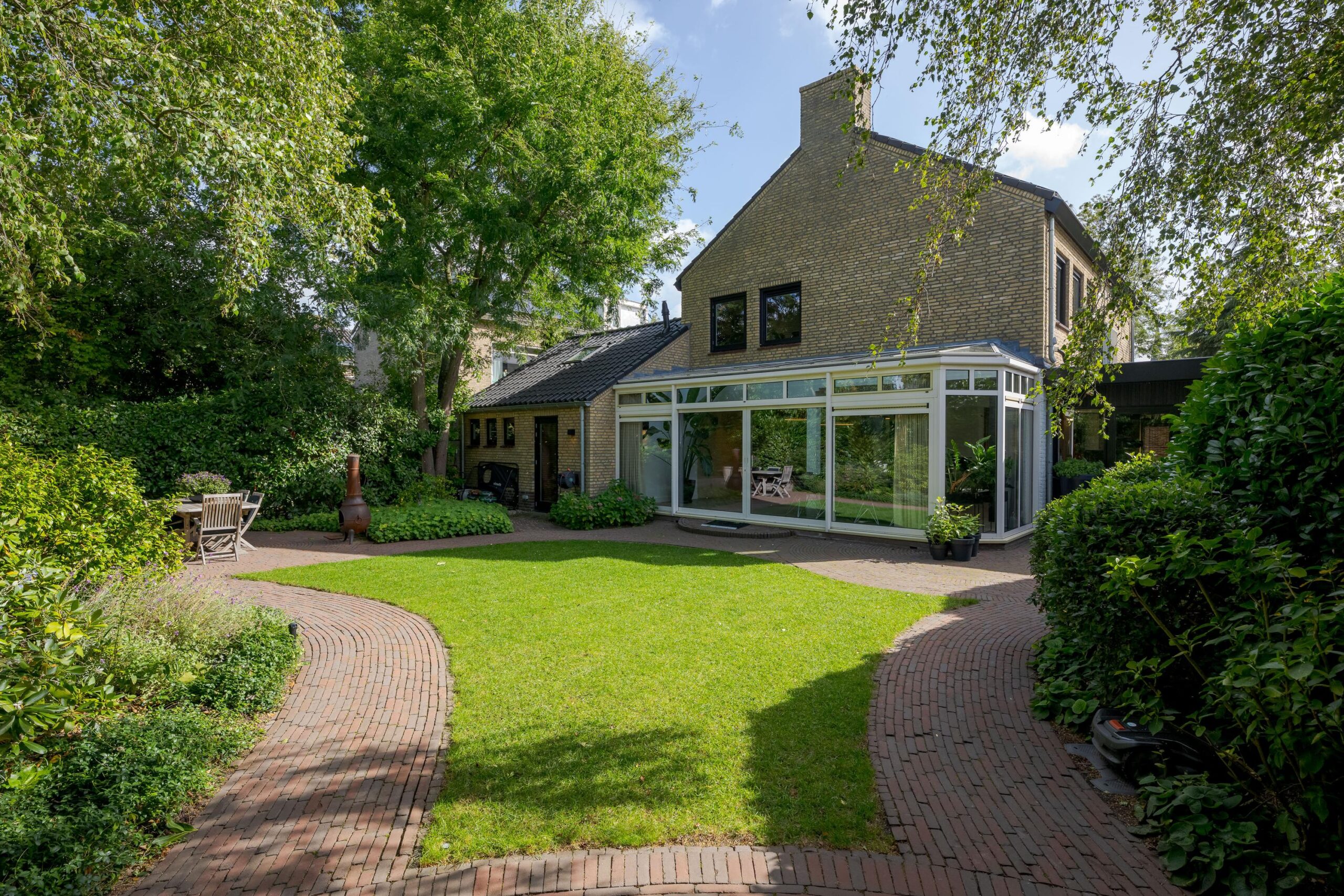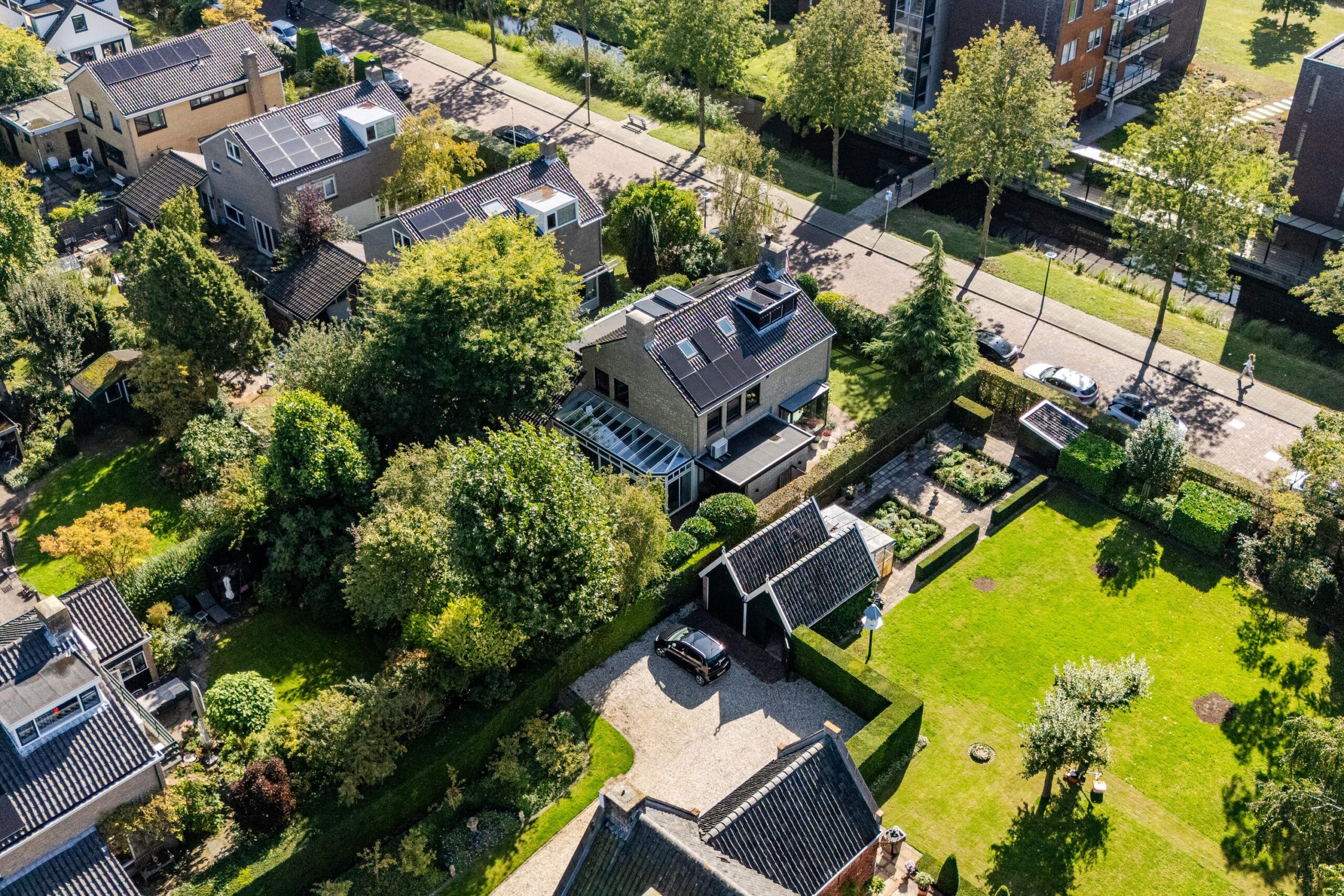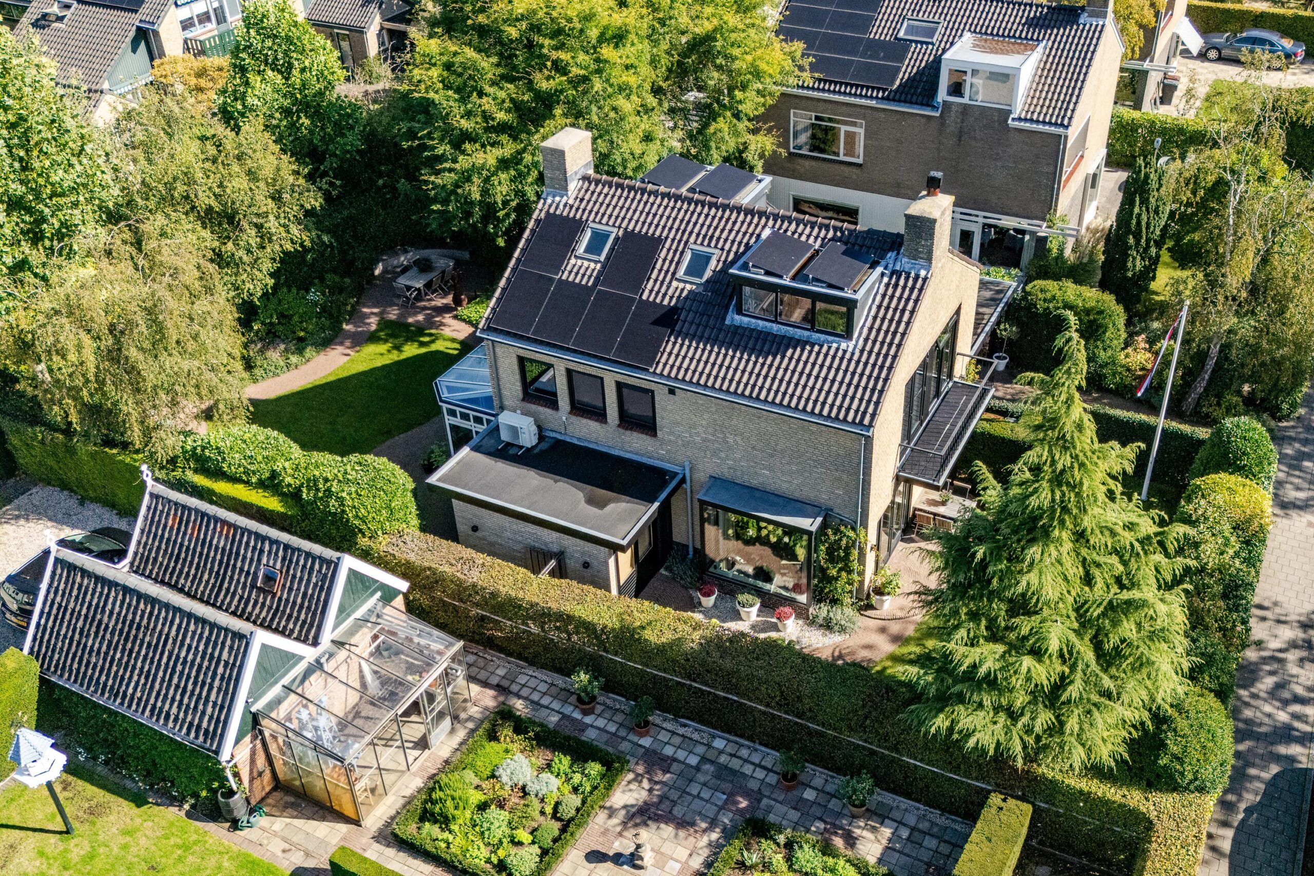 Daarnaast beschikt de woning over een ruime oprit met plaats voor meerdere auto’s, een oplaadpunt, een zonnige voortuin (ca. 100 m²) met beschut terras op het zuiden én een fraai aangelegde achtertuin (ruim 200 m²) op het westen en noorden, voorzien van meerdere terrassen en een irrigatiesysteem.