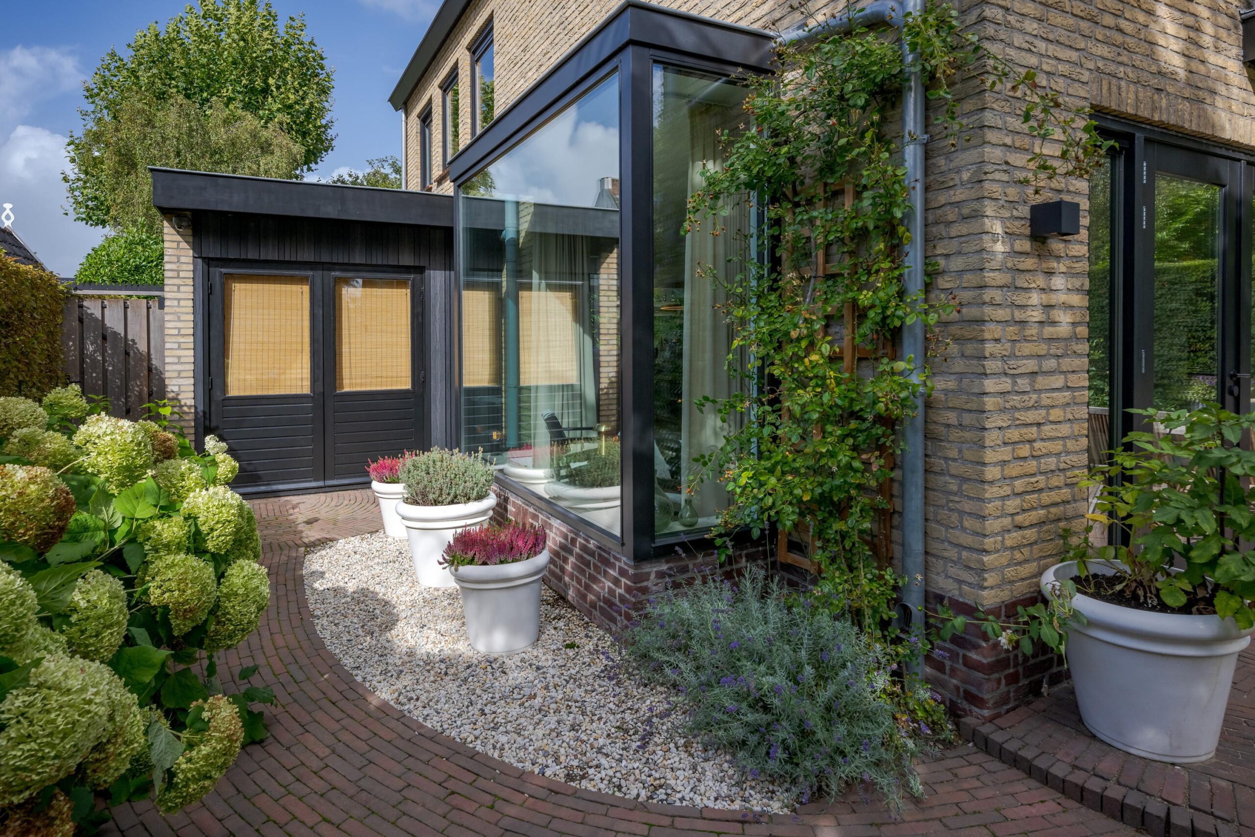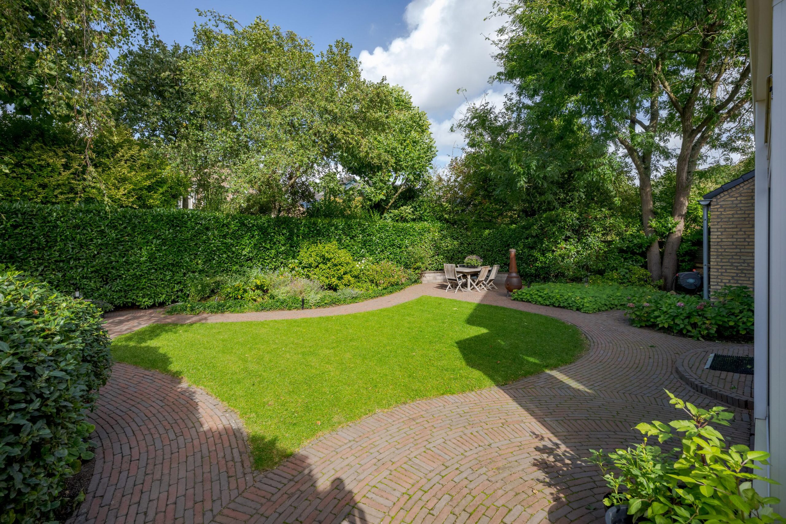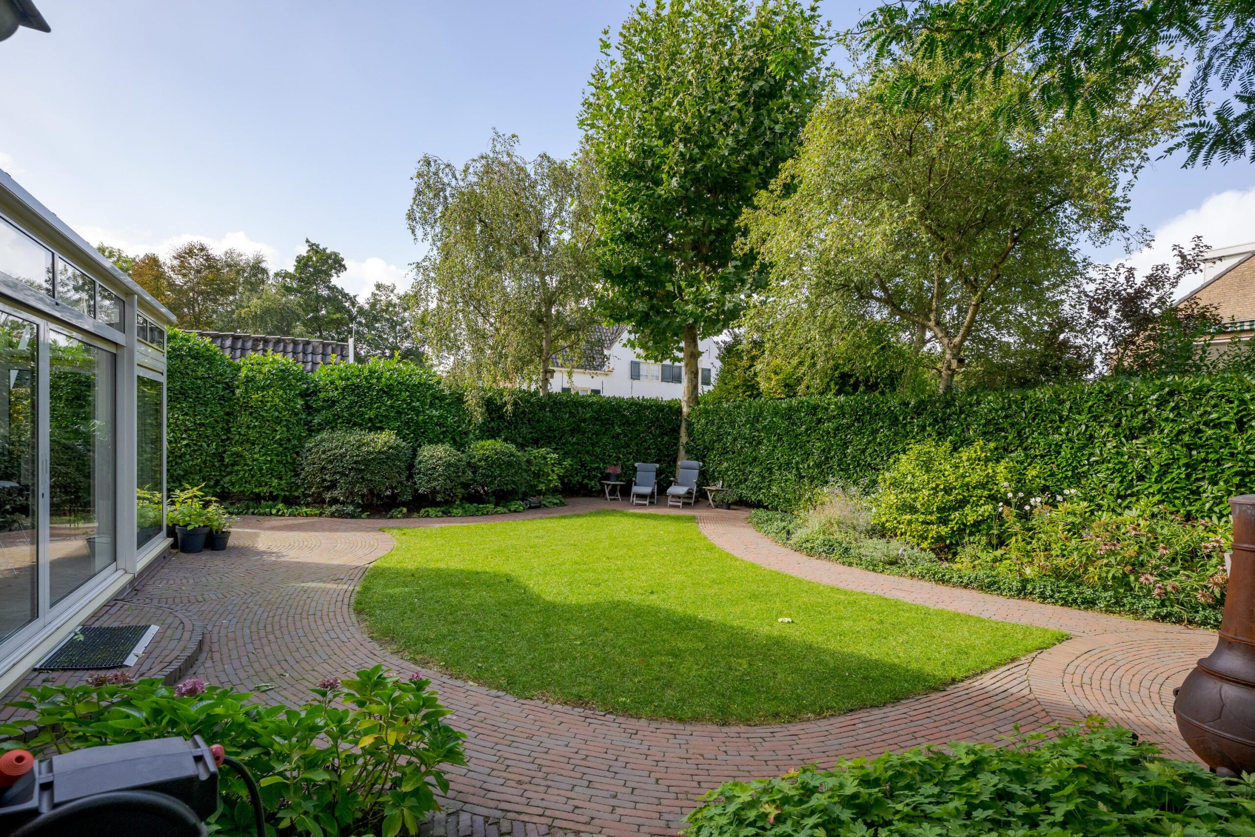 De beschutte tuin is een heerlijke plek om te ontspannen. De tuin is onder architectuur aangelegd en biedt meerdere terrassen en zitjes, waardoor u de hele dag kunt kiezen voor zon of schaduw. Aan de zijkant bevindt zich een ruime stenen berging met dubbele deuren, ideaal voor fietsen en tuingereedschap.