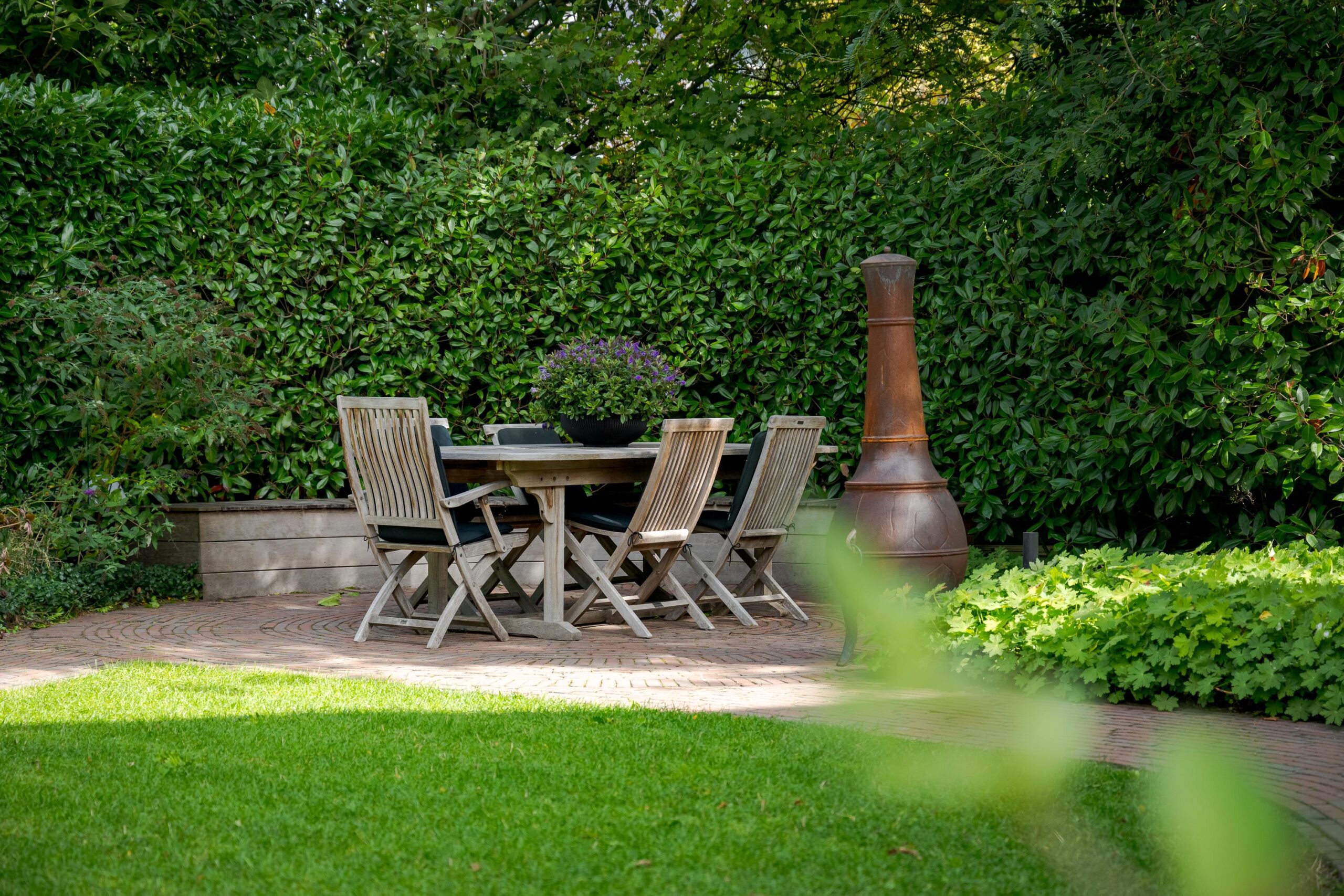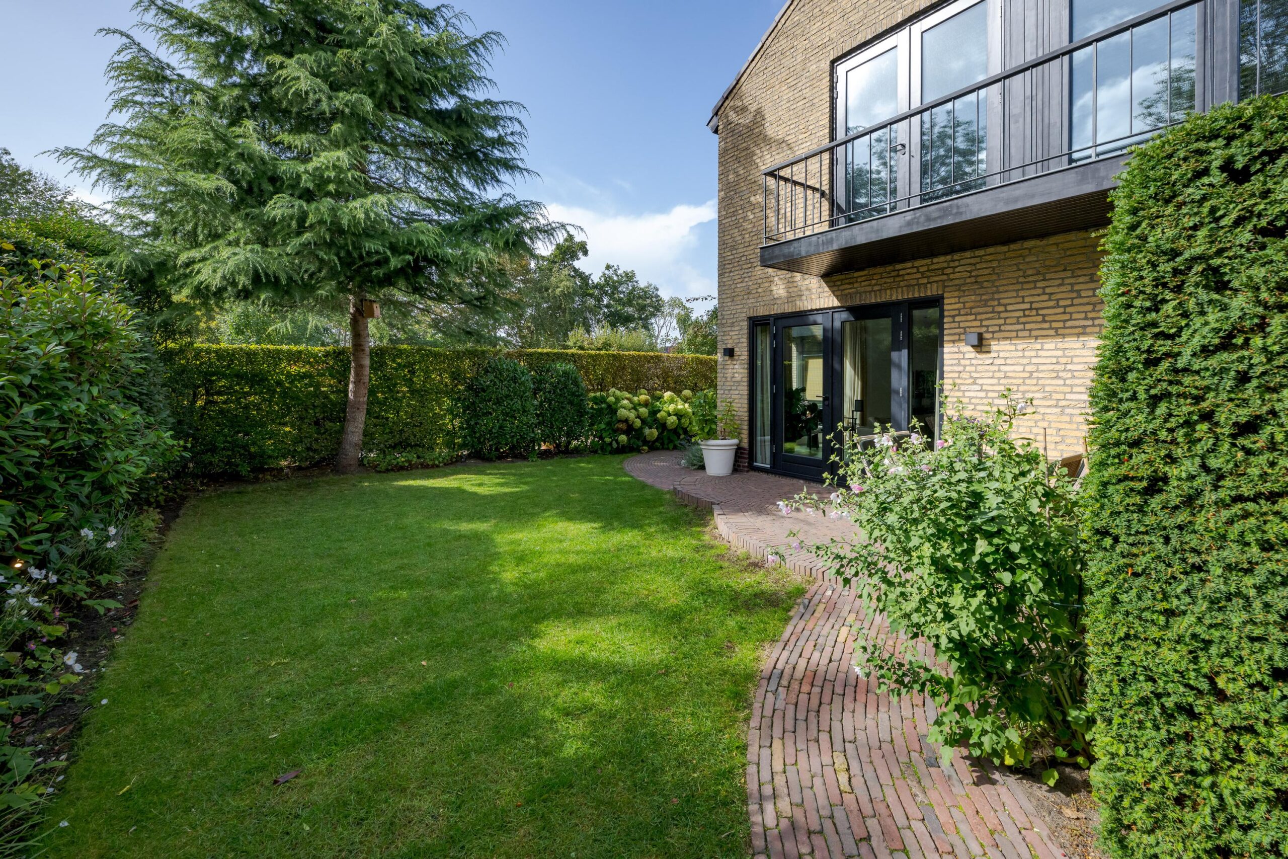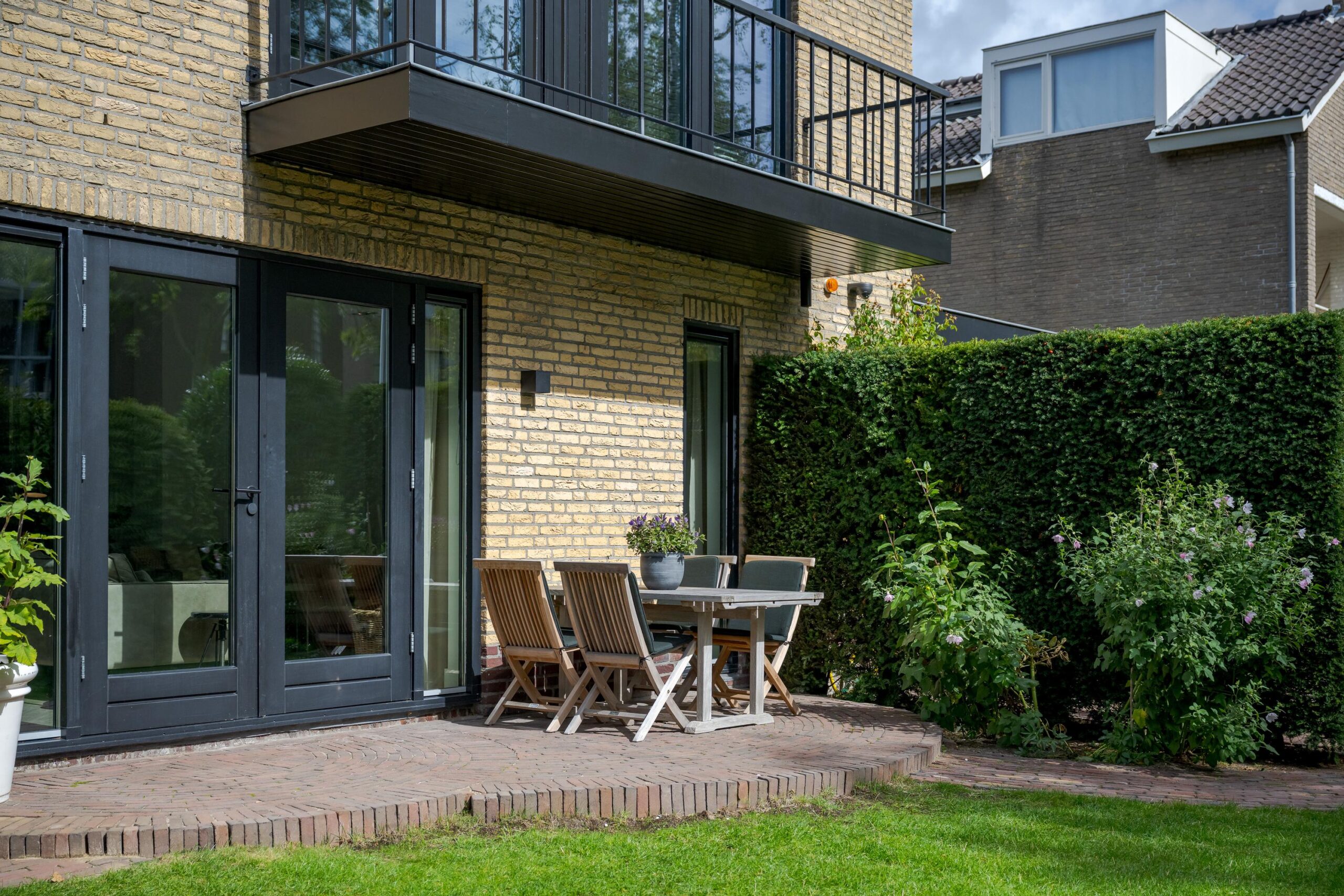 De beschutte tuin is een heerlijke plek om te ontspannen. De tuin is onder architectuur aangelegd en biedt meerdere terrassen en zitjes, waardoor u de hele dag kunt kiezen voor zon of schaduw. Aan de zijkant bevindt zich een ruime stenen berging met dubbele deuren, ideaal voor fietsen en tuingereedschap.