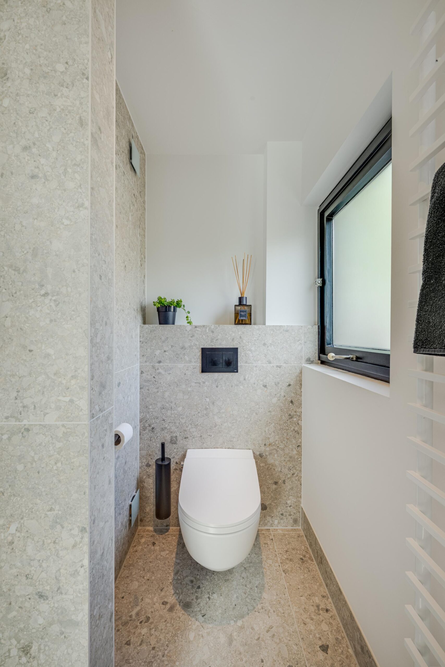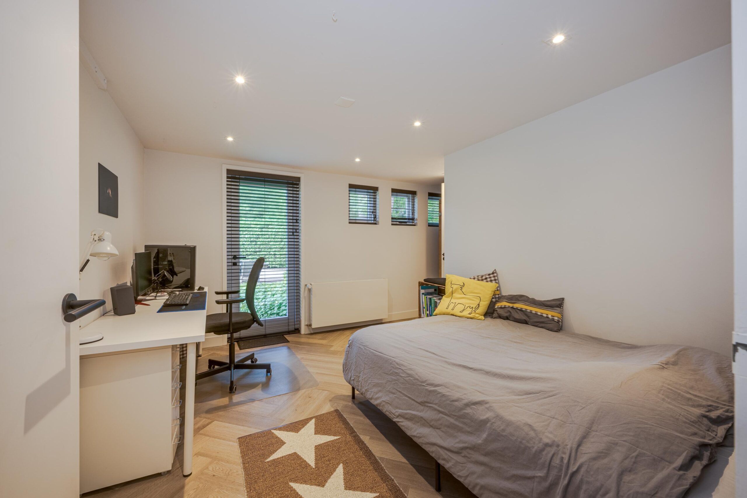 Aan de achterzijde van de woning ligt een royale slaapkamer met deur naar de tuin en een moderne badkamer en-suite met wastafel, douche en toilet; ideaal voor gasten of een au-pair.