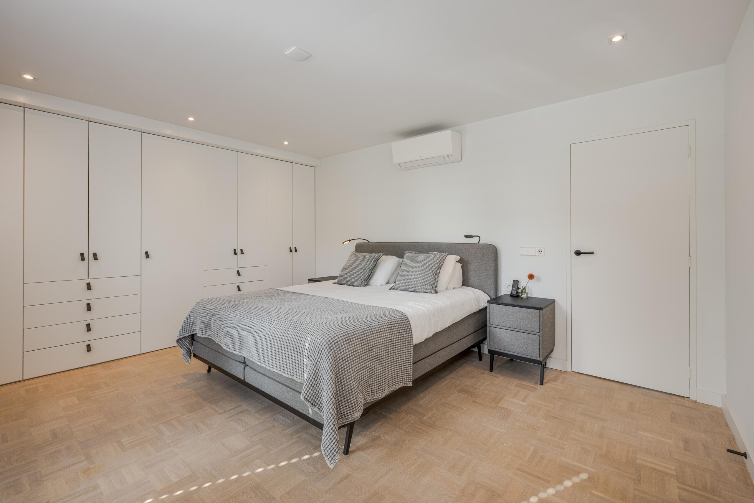 Ruime overloop met inbouwkasten en een luxe, moderne badkamer met douche, dubbele wastafel en toilet. Twee slaapkamers met inbouwkasten aan de achterzijde en een ruime master bedroom aan de voorzijde met airconditioning en met vaste kastenwand en ingebouwde verlichting én een eigen badkamer en-suite met inloopdouche voorzien van Sunshower met zonnebank en infrarood functie, ligbad, dubbele wastafel en douche-toilet. De slaapkamer geeft toegang tot een balkon aan de voorzijde.