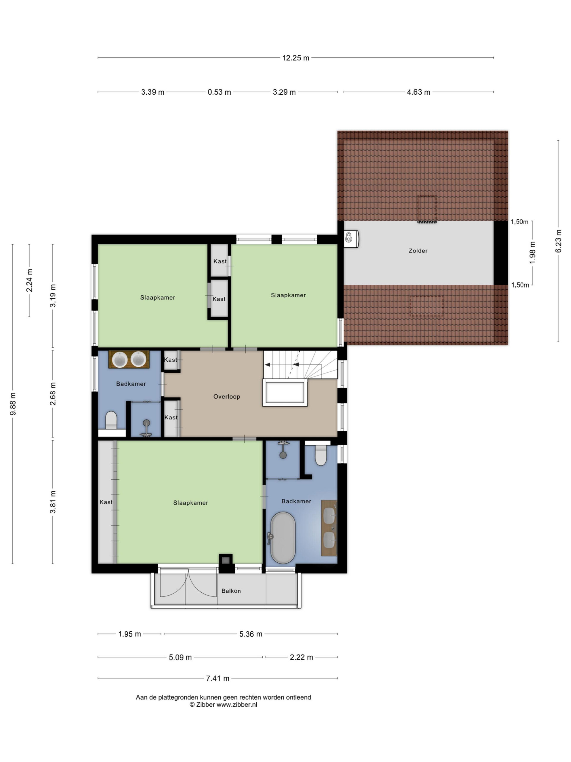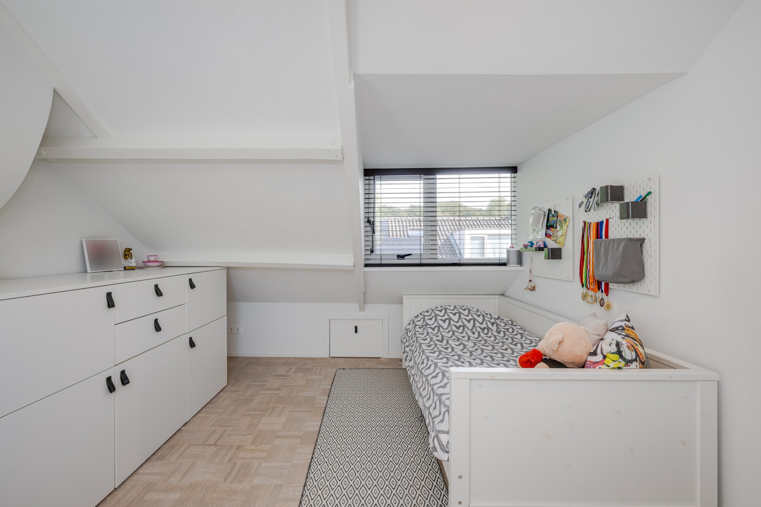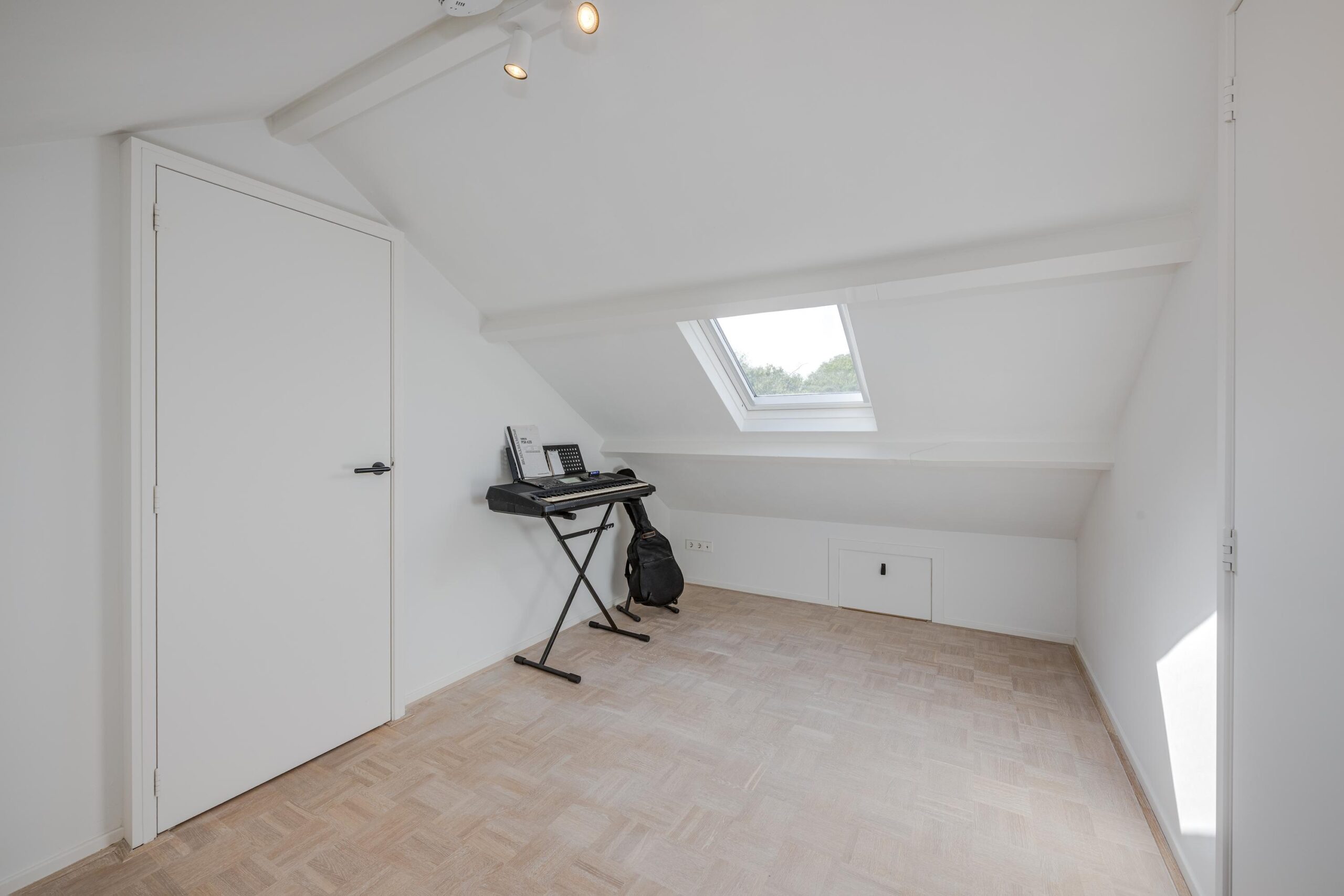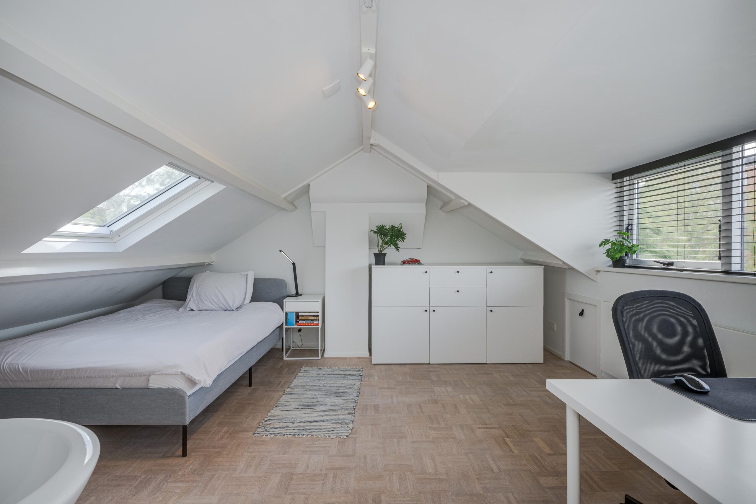 Ruime overloop met Veluxraam en bergkast (voorzieningen aangelegd voor creëren extra badkamer), plus twee goed bemeten slaapkamers met dakkapel en veel bergruimte achter de knieschotten. Ook deze kamers zijn voorzien van airconditioning.