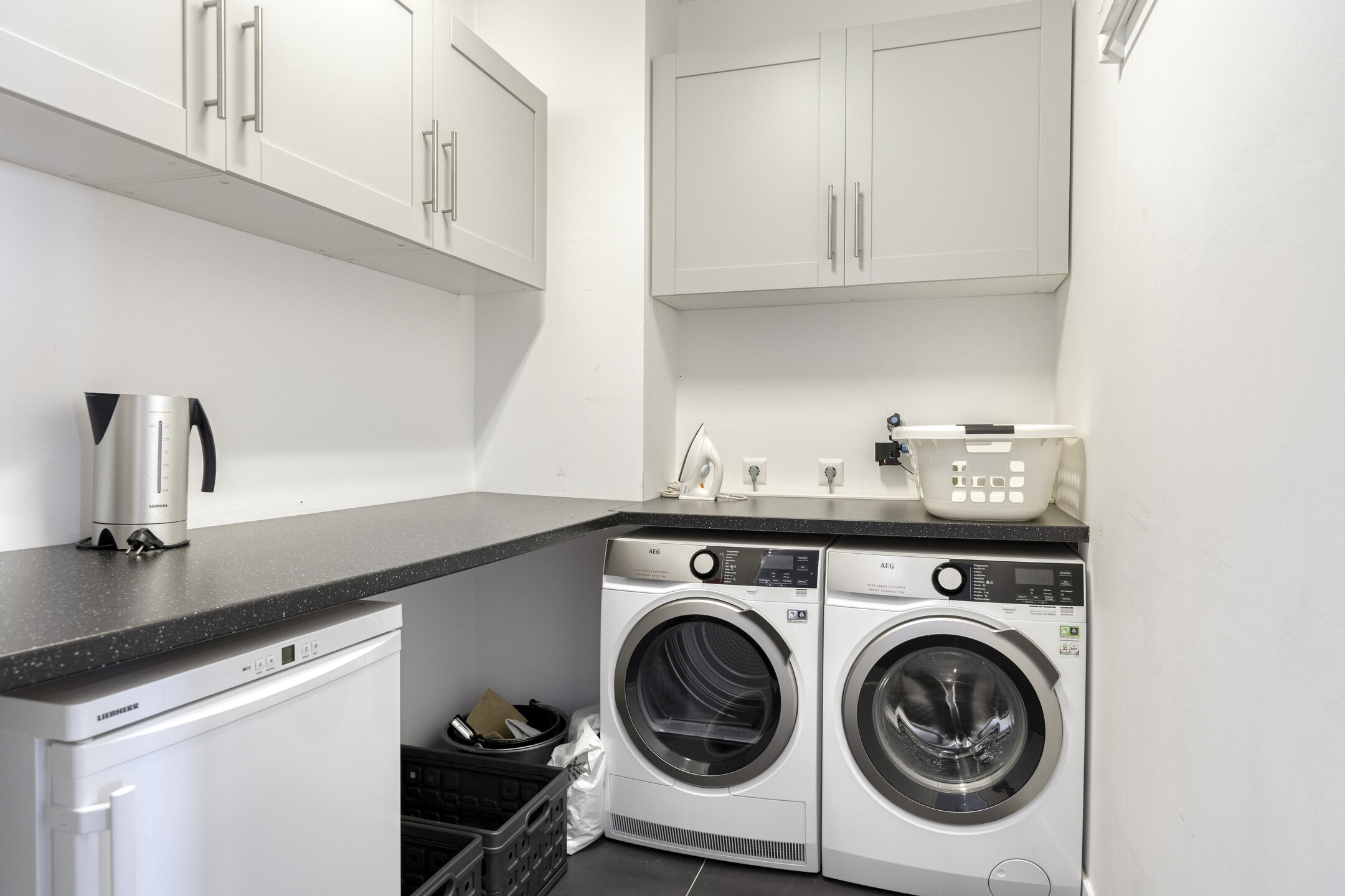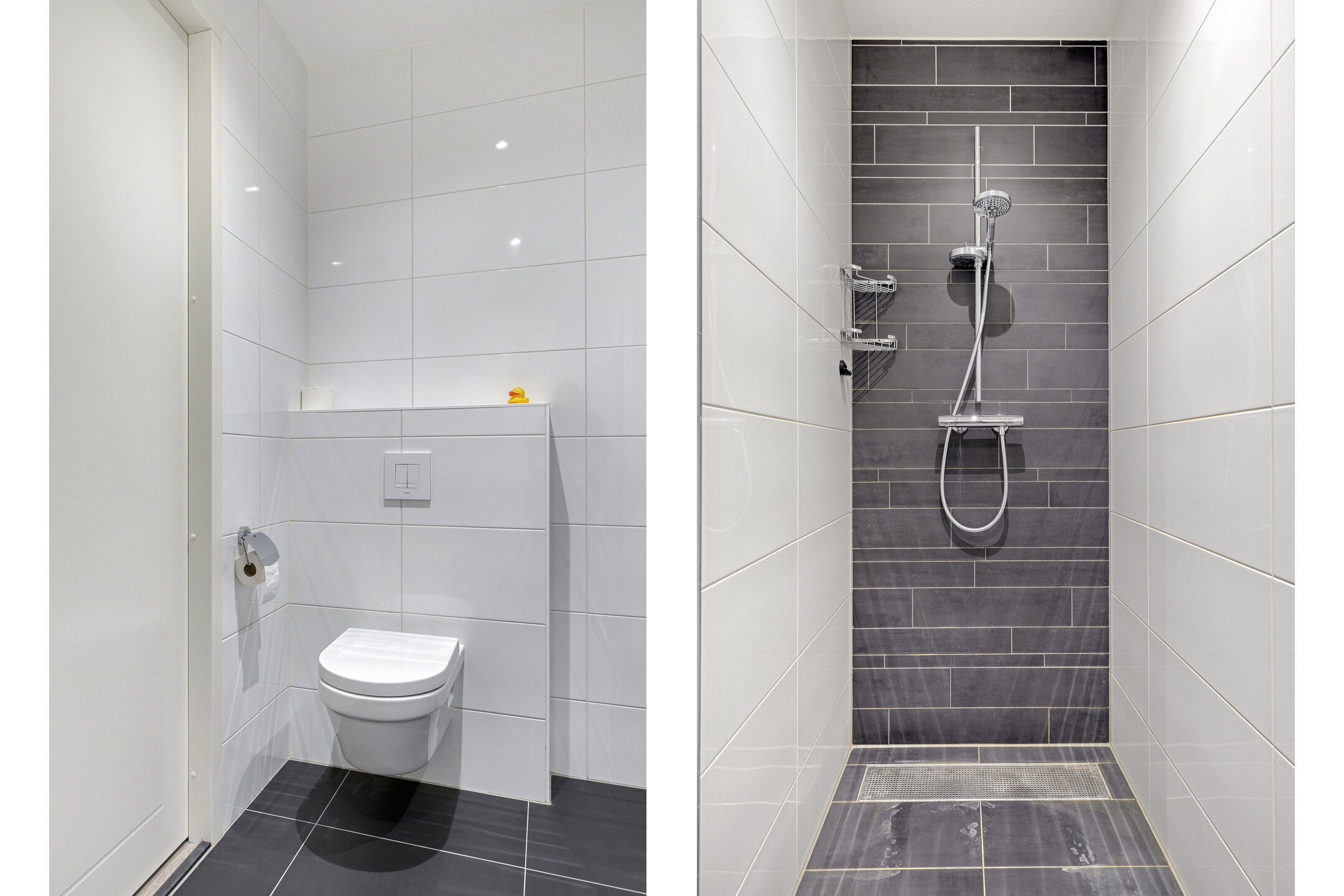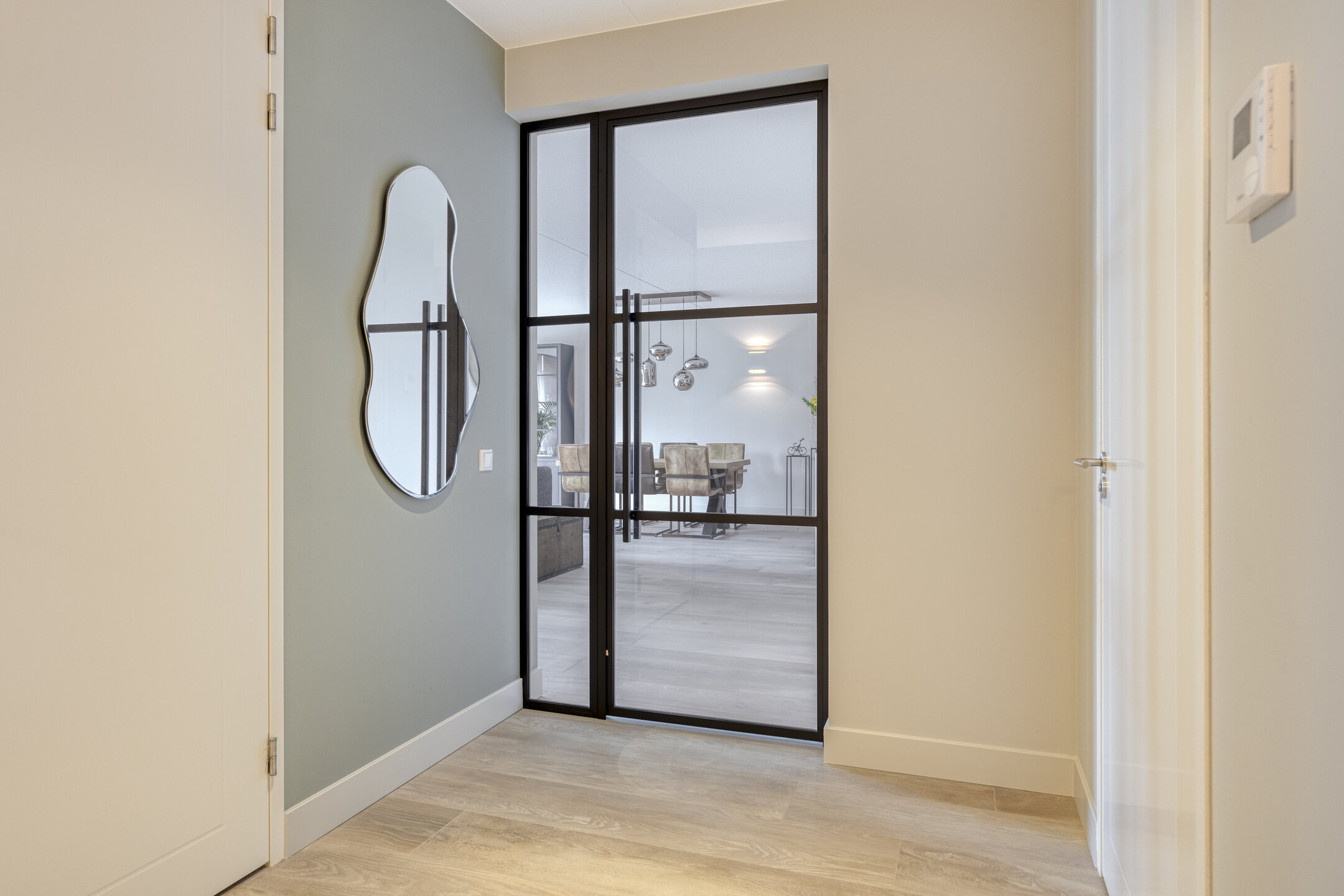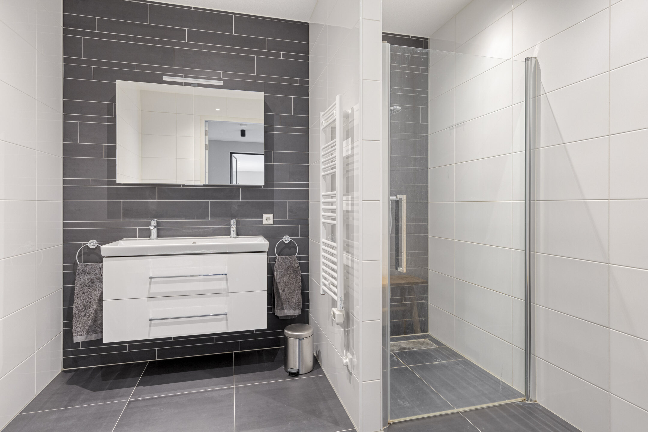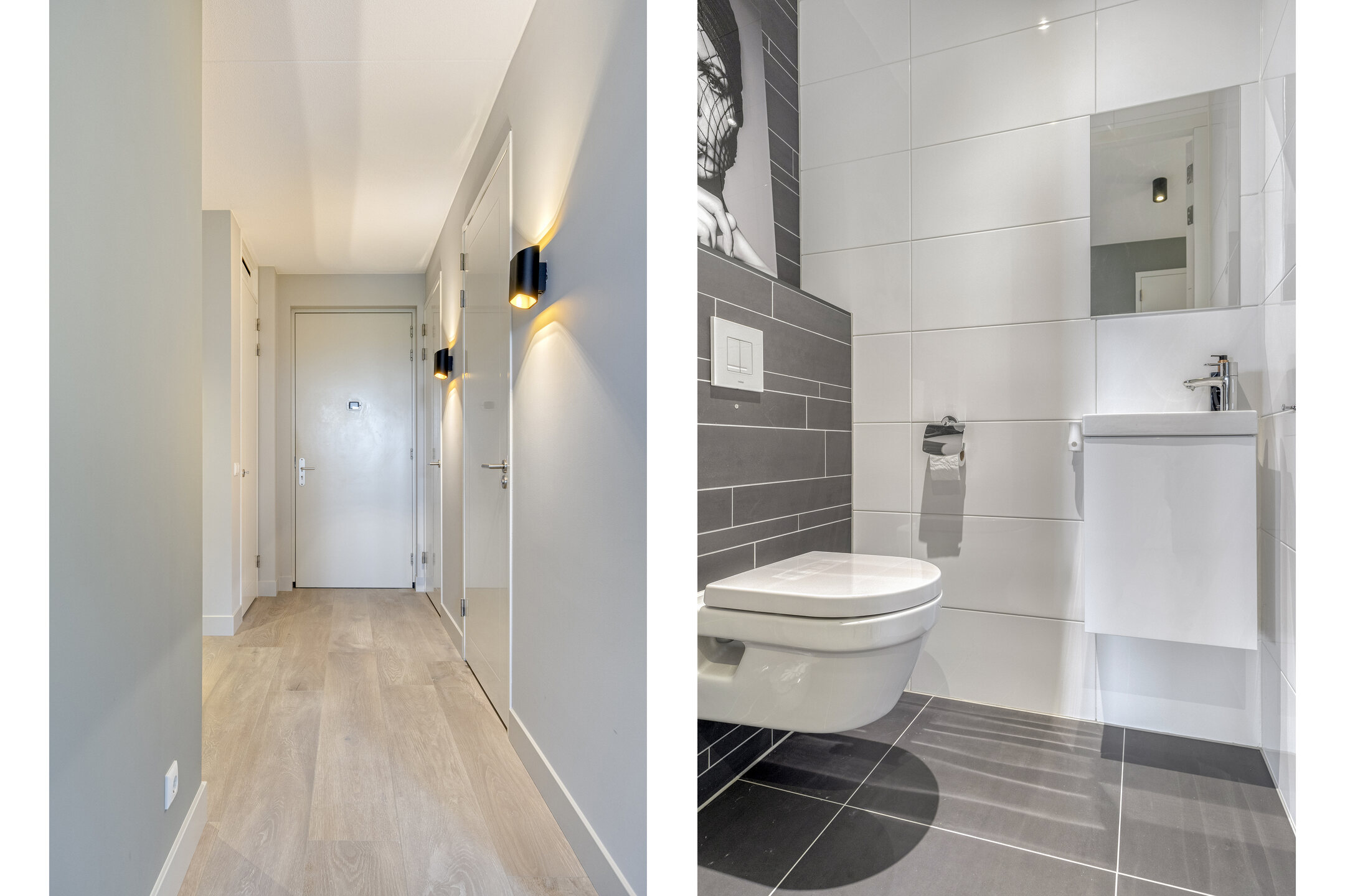 Lift naar de eerste verdieping: ruime entree met een garderobekast, meterkast en een inpandige berging met CV-opstelling. Tevens een modern toilet met fontein en een luxe badkamer met inloopdouche, dubbel wastafelmeubel en toilet.