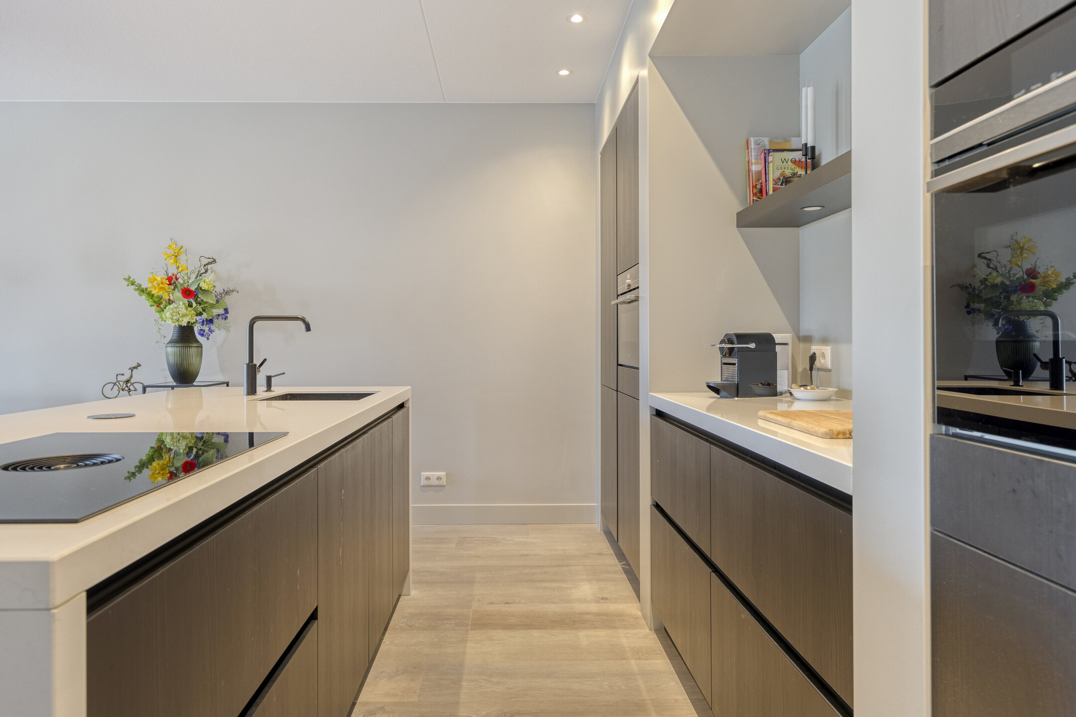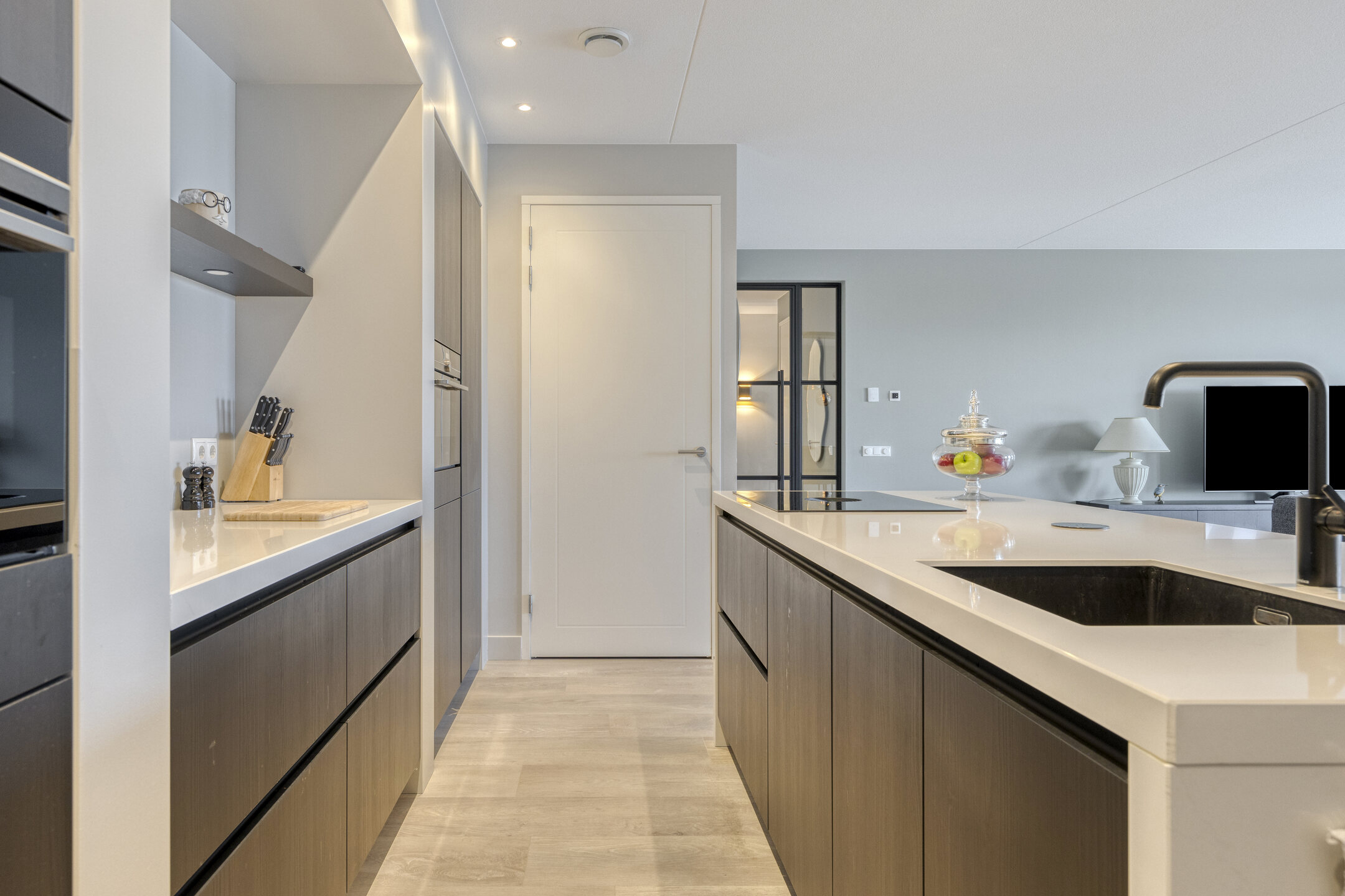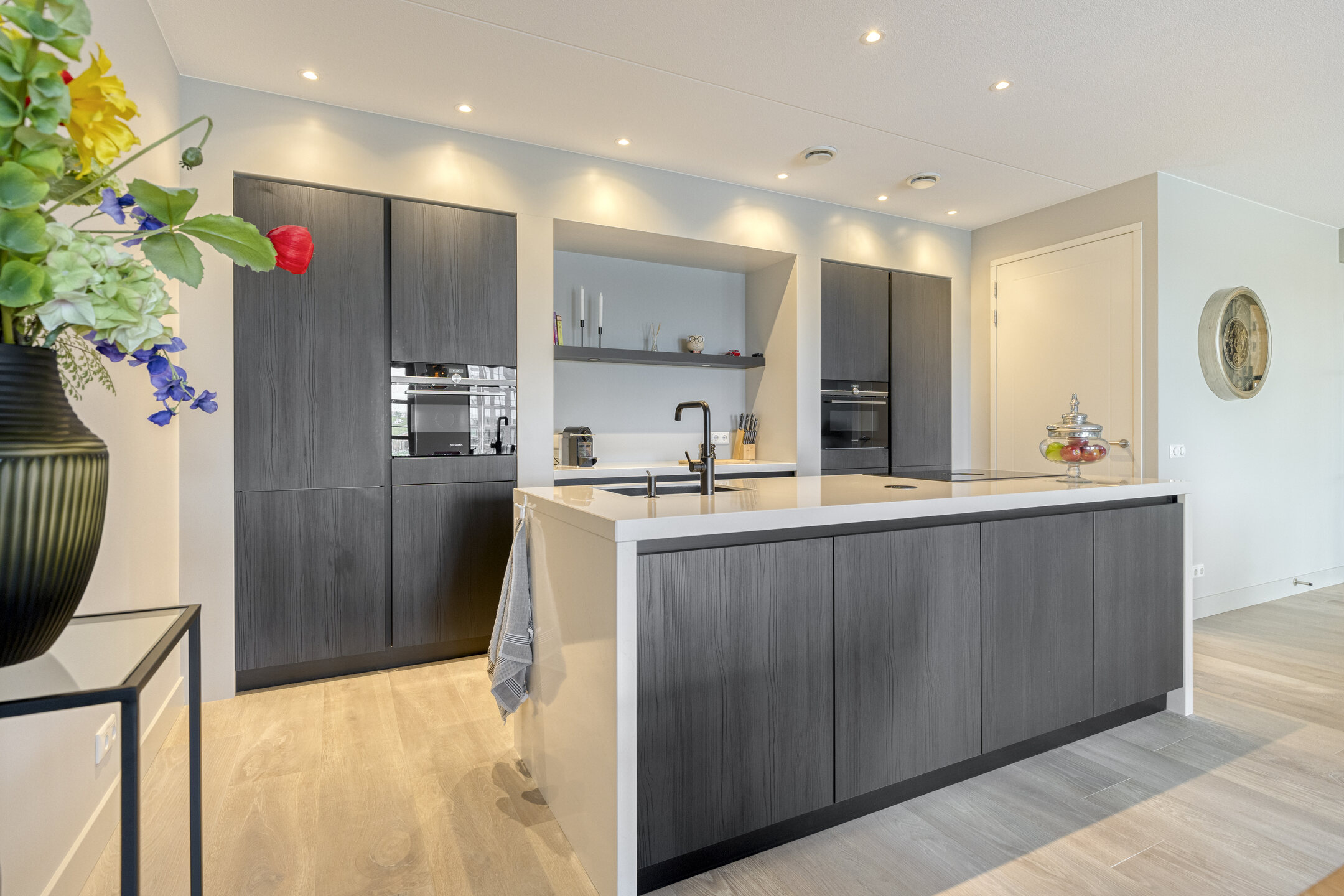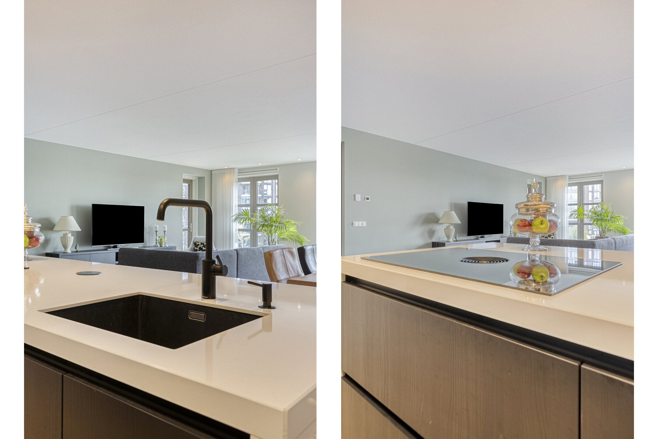 Tenslotte de zeer ruime, lichte woonkamer met open leefkeuken. De luxe Tieleman keuken met kookeiland is volledig uitgerust met moderne Siemens apparatuur en een geïntegreerde Bora inductiekookplaat met afzuiging. Naast de keuken bevindt zich de bijkeuken met wasmachine en droger opstelling en veel extra kastruimte. De woonkamer heeft 2 x openslaande deuren van het type ‘Frans balkon’ en een panoramaraam van vloer tot plafond, wat een fantastisch uitzicht geeft op de voorbijvarende bootjes. Vanuit de woonkamer heeft u tevens toegang tot het ruime balkon.