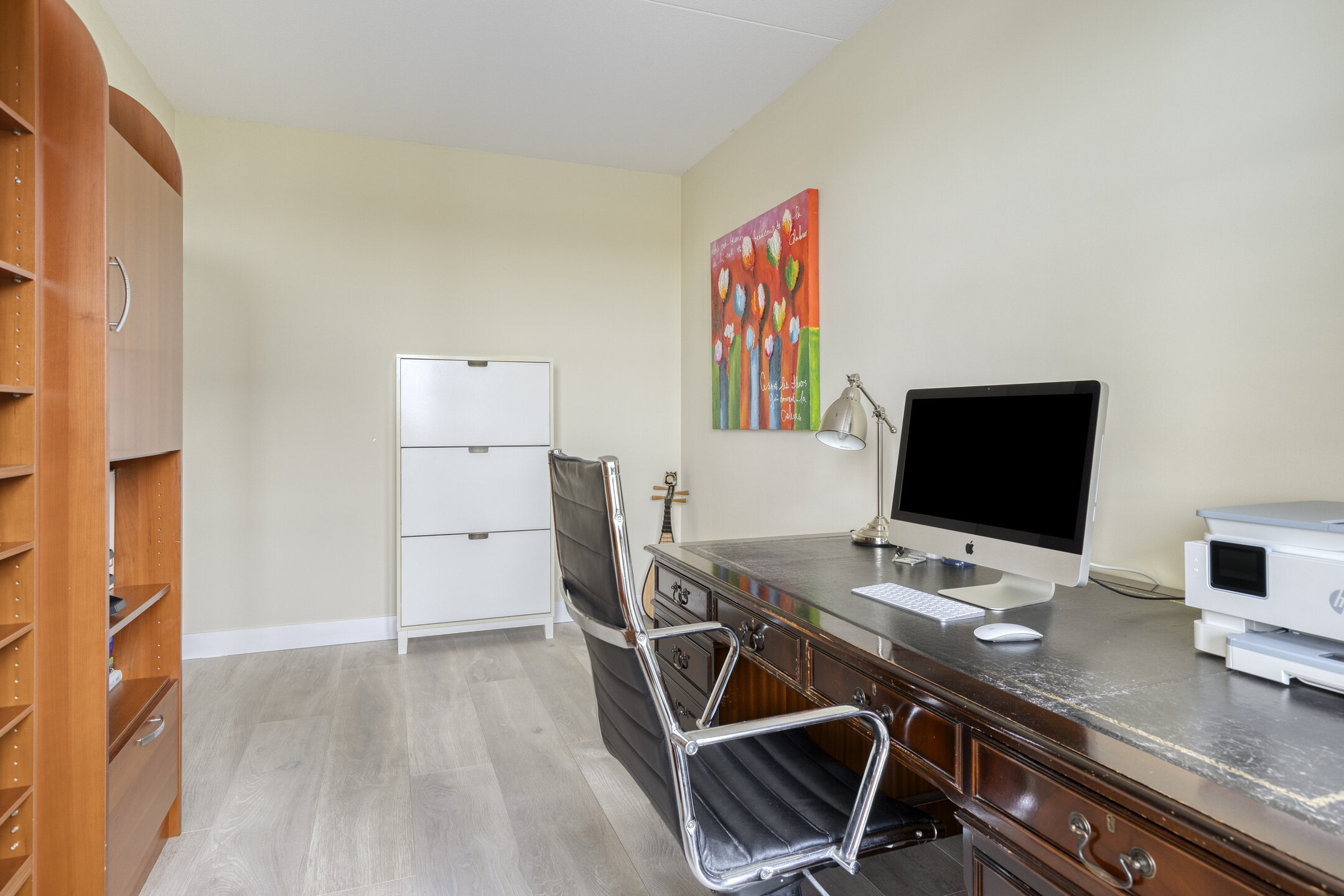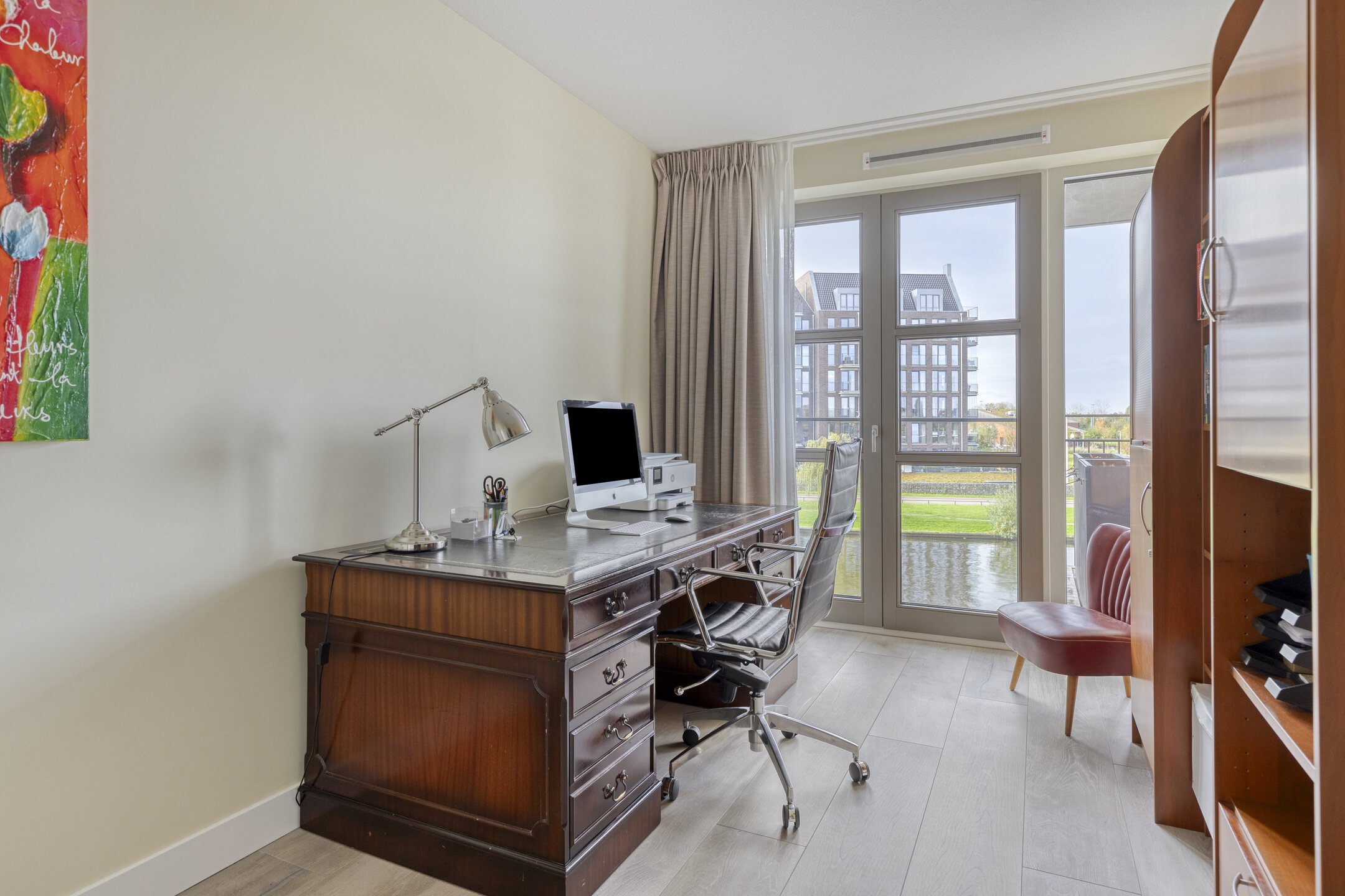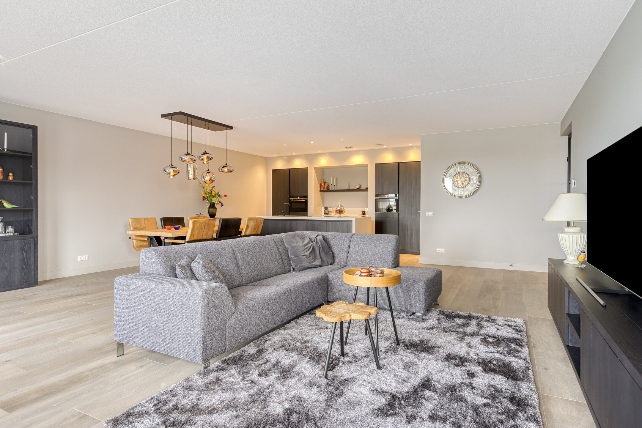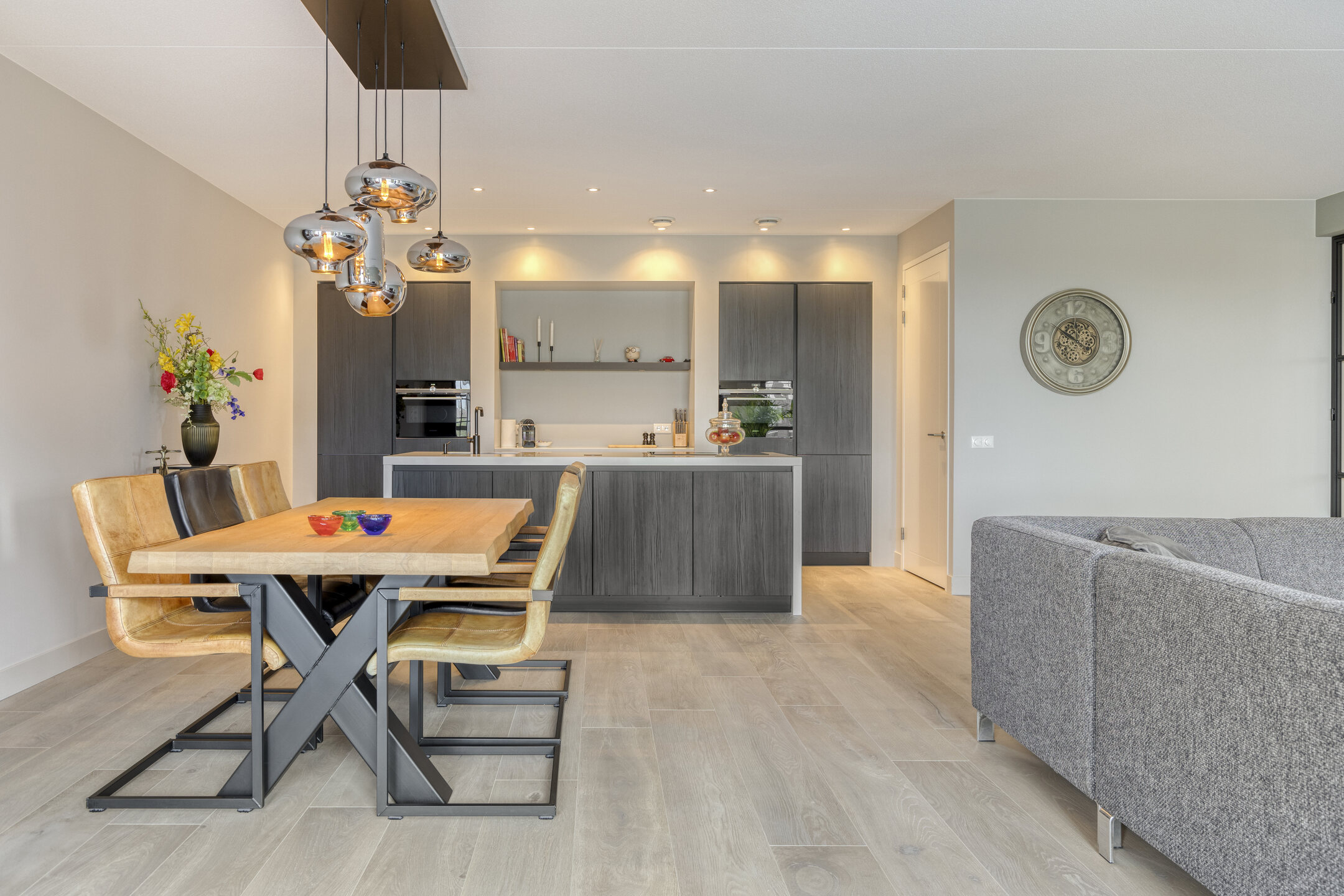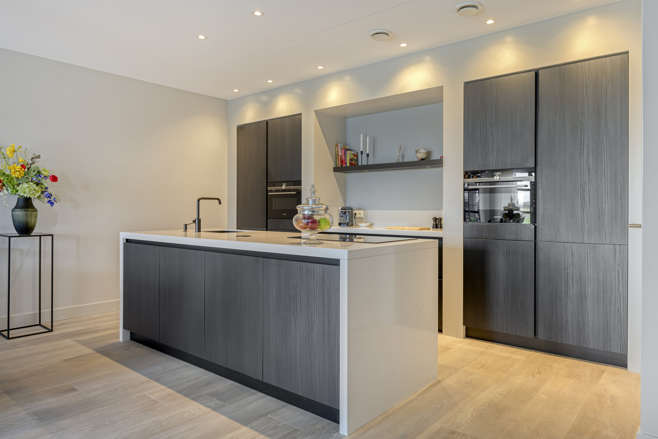Tenslotte de zeer ruime, lichte woonkamer met open leefkeuken. De luxe Tieleman keuken met kookeiland is volledig uitgerust met moderne Siemens apparatuur en een geïntegreerde Bora inductiekookplaat met afzuiging. Naast de keuken bevindt zich de bijkeuken met wasmachine en droger opstelling en veel extra kastruimte. De woonkamer heeft 2 x openslaande deuren van het type ‘Frans balkon’ en een panoramaraam van vloer tot plafond, wat een fantastisch uitzicht geeft op de voorbijvarende bootjes. Vanuit de woonkamer heeft u tevens toegang tot het ruime balkon.