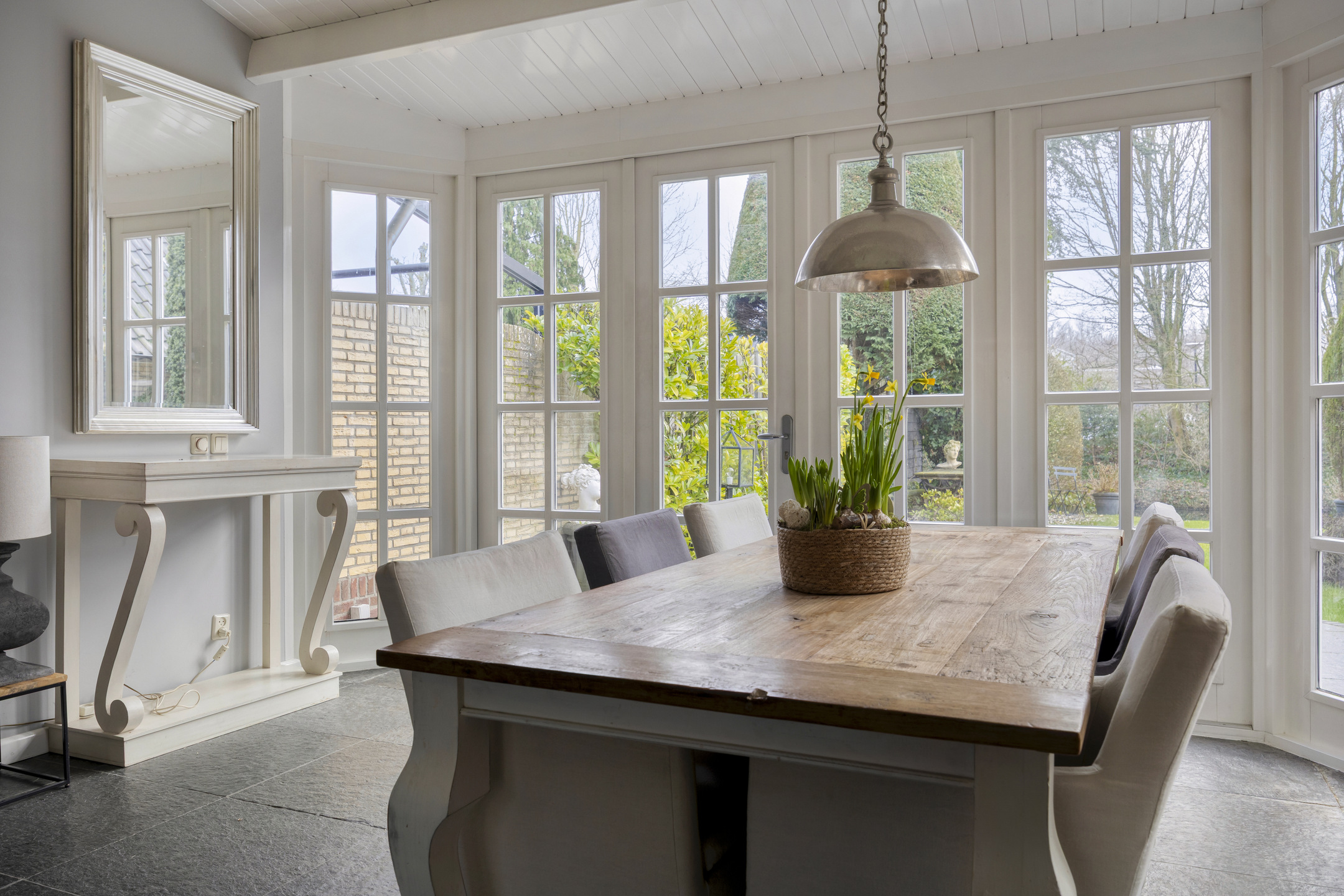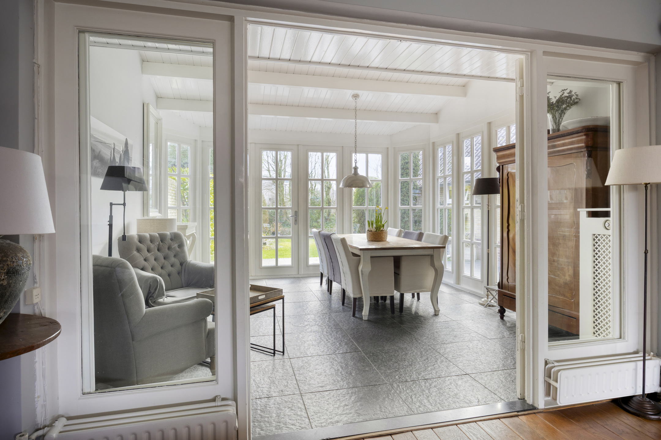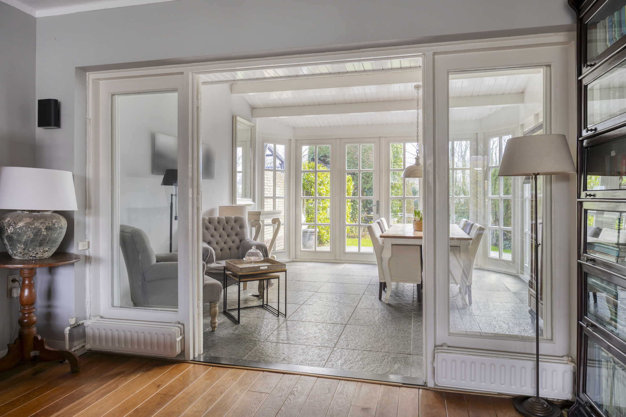 Entree met centrale hal, wc en trap naar 1e etage. Vanuit de hal kom je middels dubbele deuren naar de L-vormige zitkamer met open haard. Vanuit de zitkamer is een doorgang naar de eetkamer met serre, welke is uitgerust met vloerverwarming, en openslaande deuren naar de tuin. De moderne keuken is separaat van de woonkamer en heeft een deur naar de achtertuin.