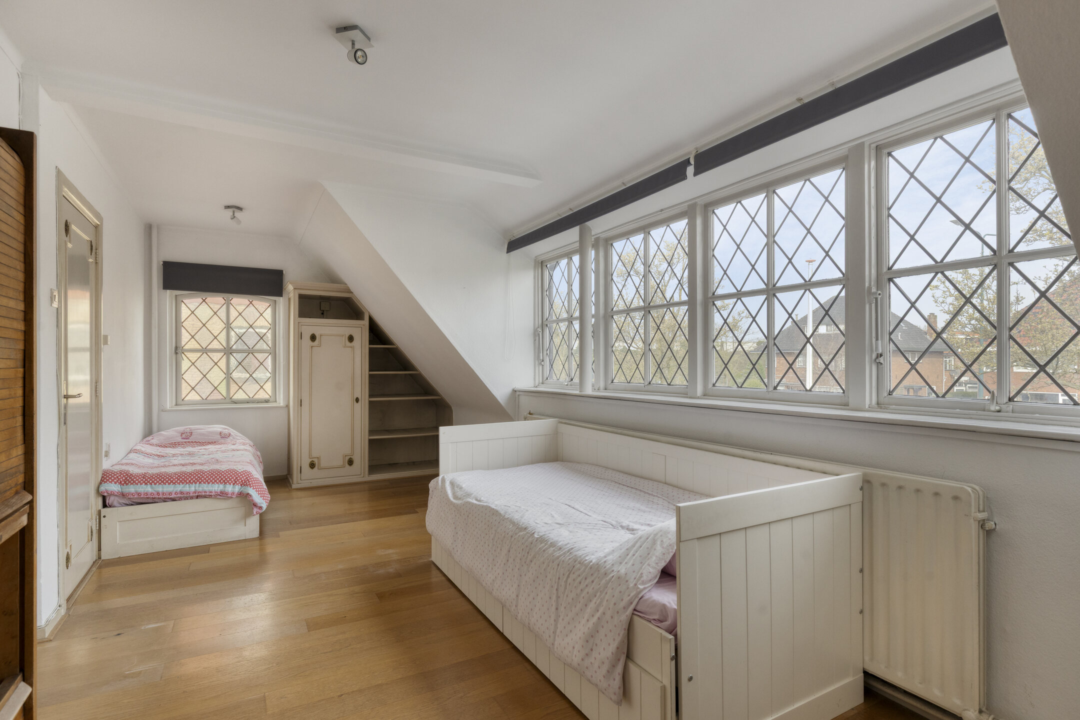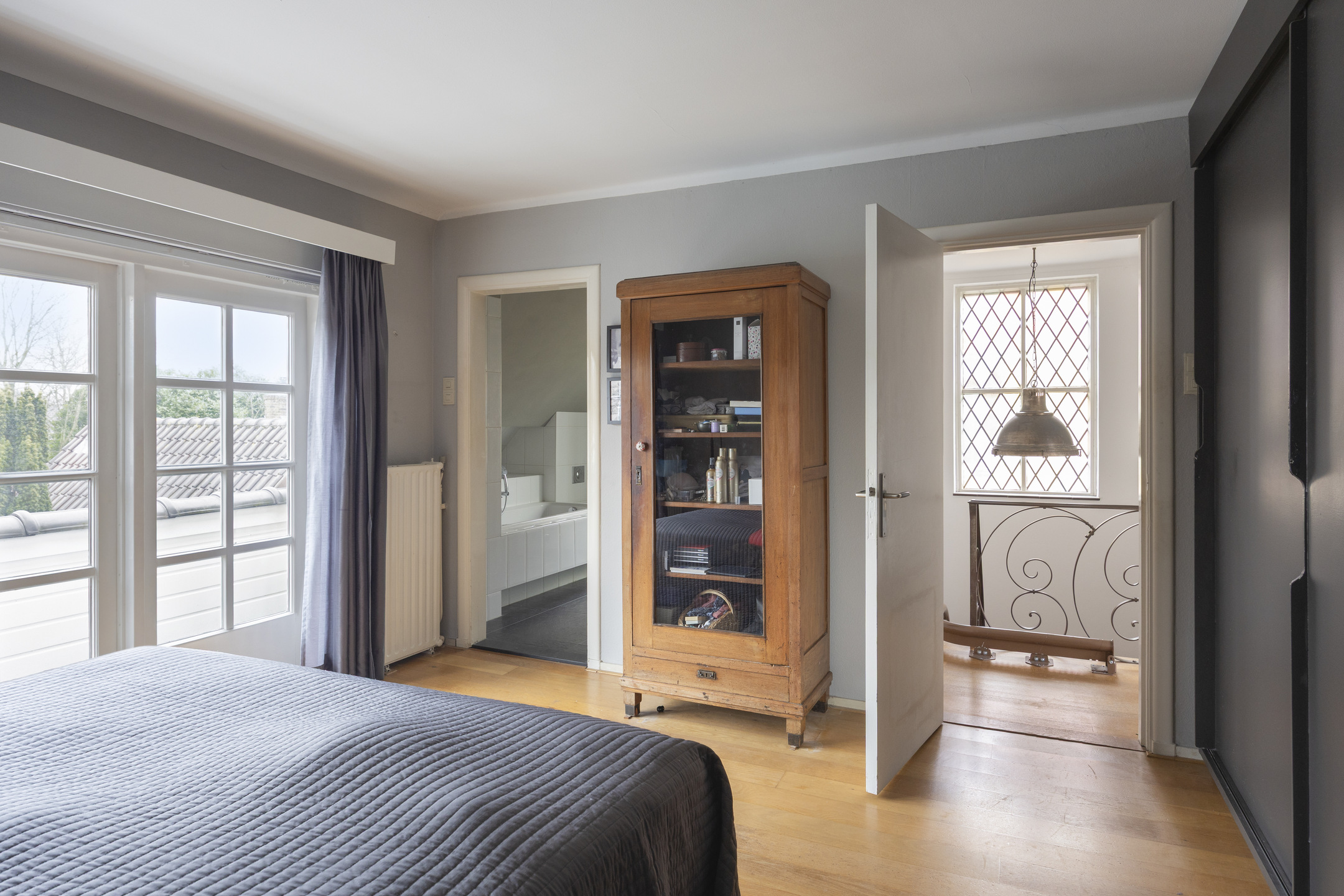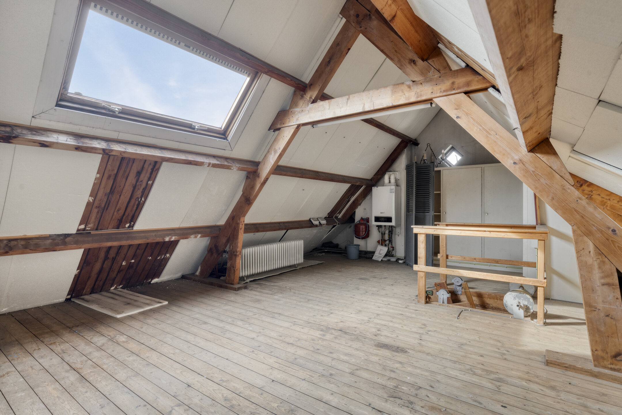 Ruime en lichte overloop met toegang tot een slaapkamer aan de voorzijde en een slaapkamer met dakterras en badkamer ensuite aan de achterzijde. Er is een vlizotrap die je zou kunnen vervangen door een vaste trap, waardoor je op de zolder nog twee extra slaapkamers zou kunnen creëren.