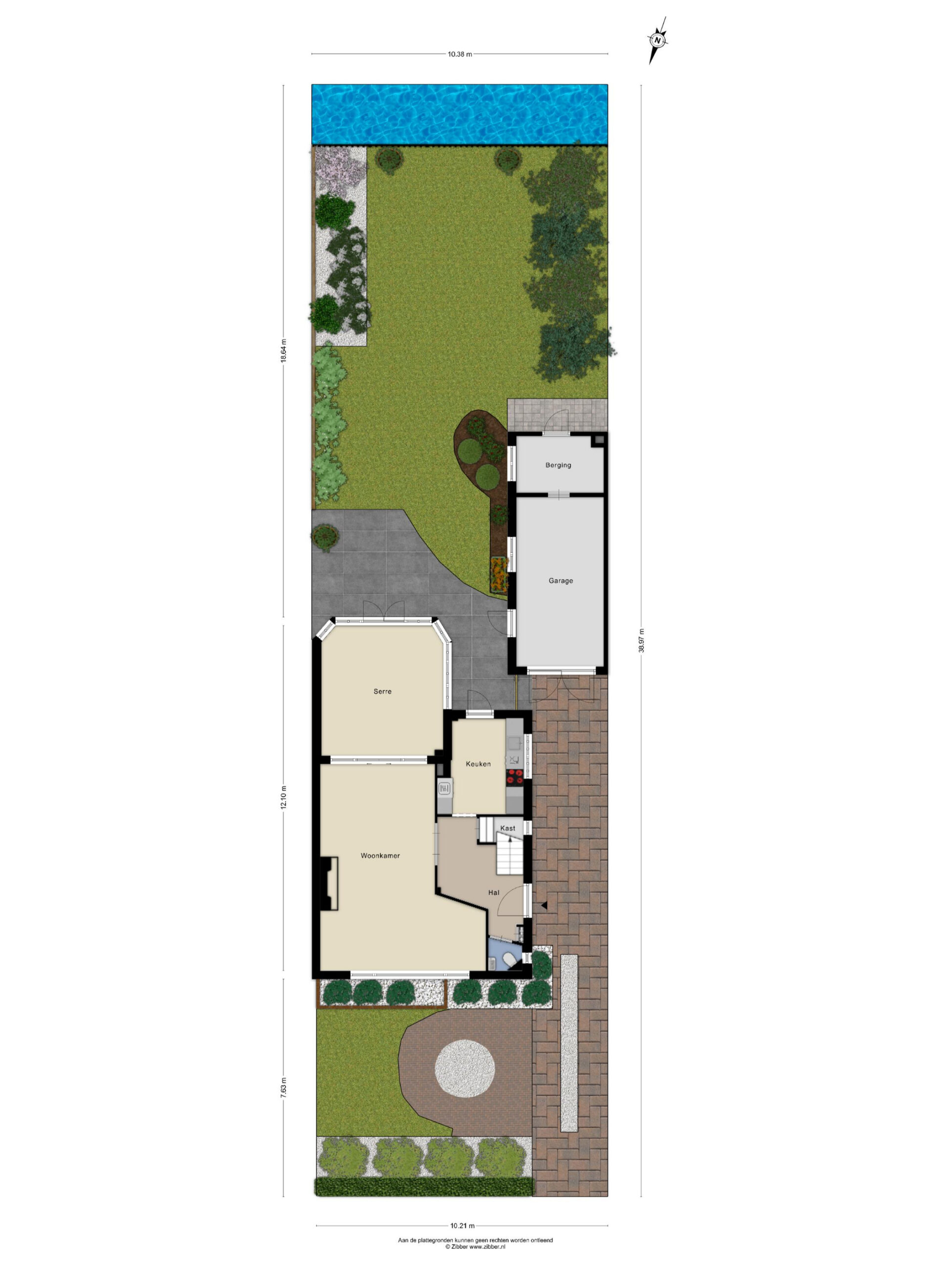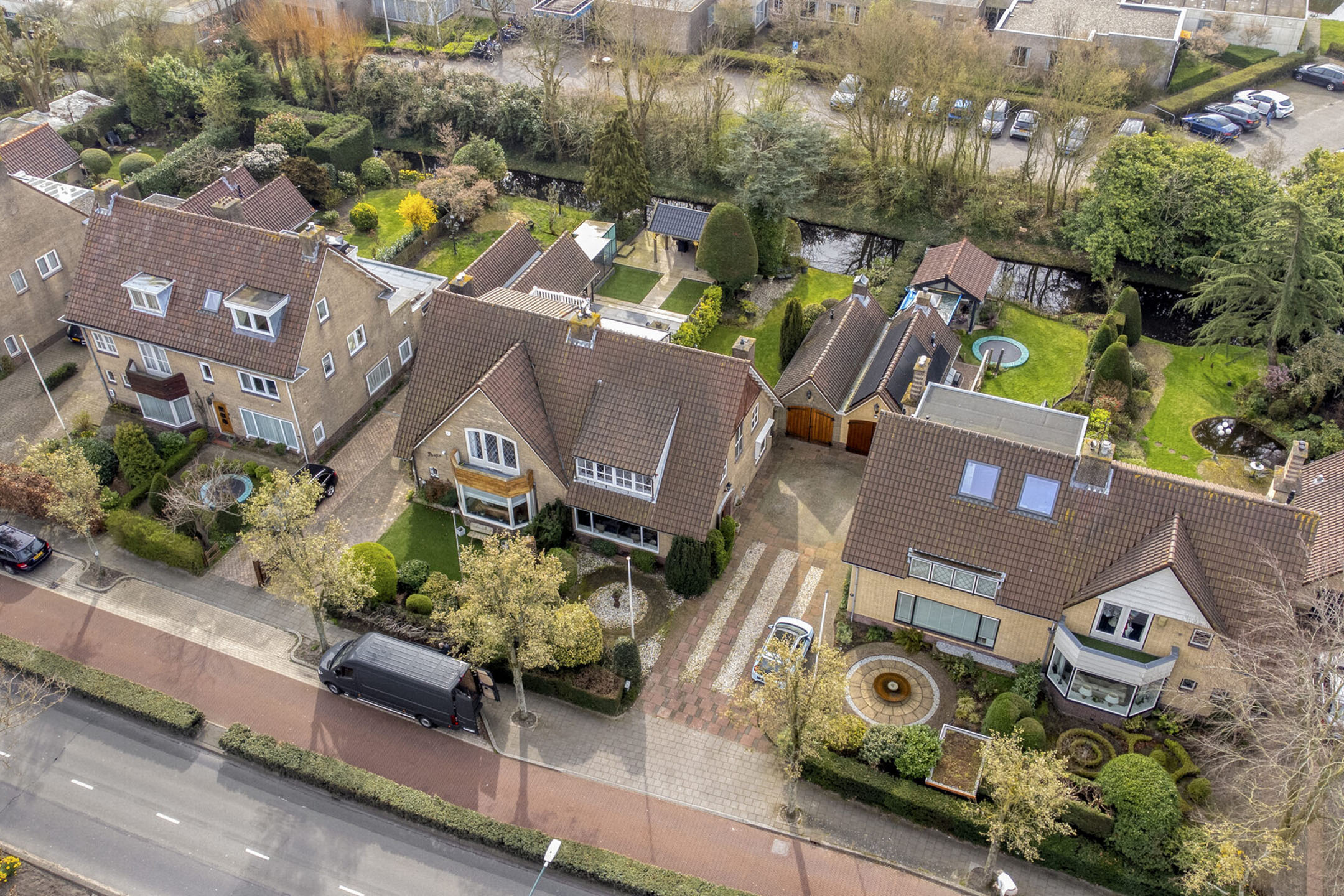 Zeer royale achtertuin aan water, een oprit voor meerdere auto’s en een garage met mogelijkheden.
