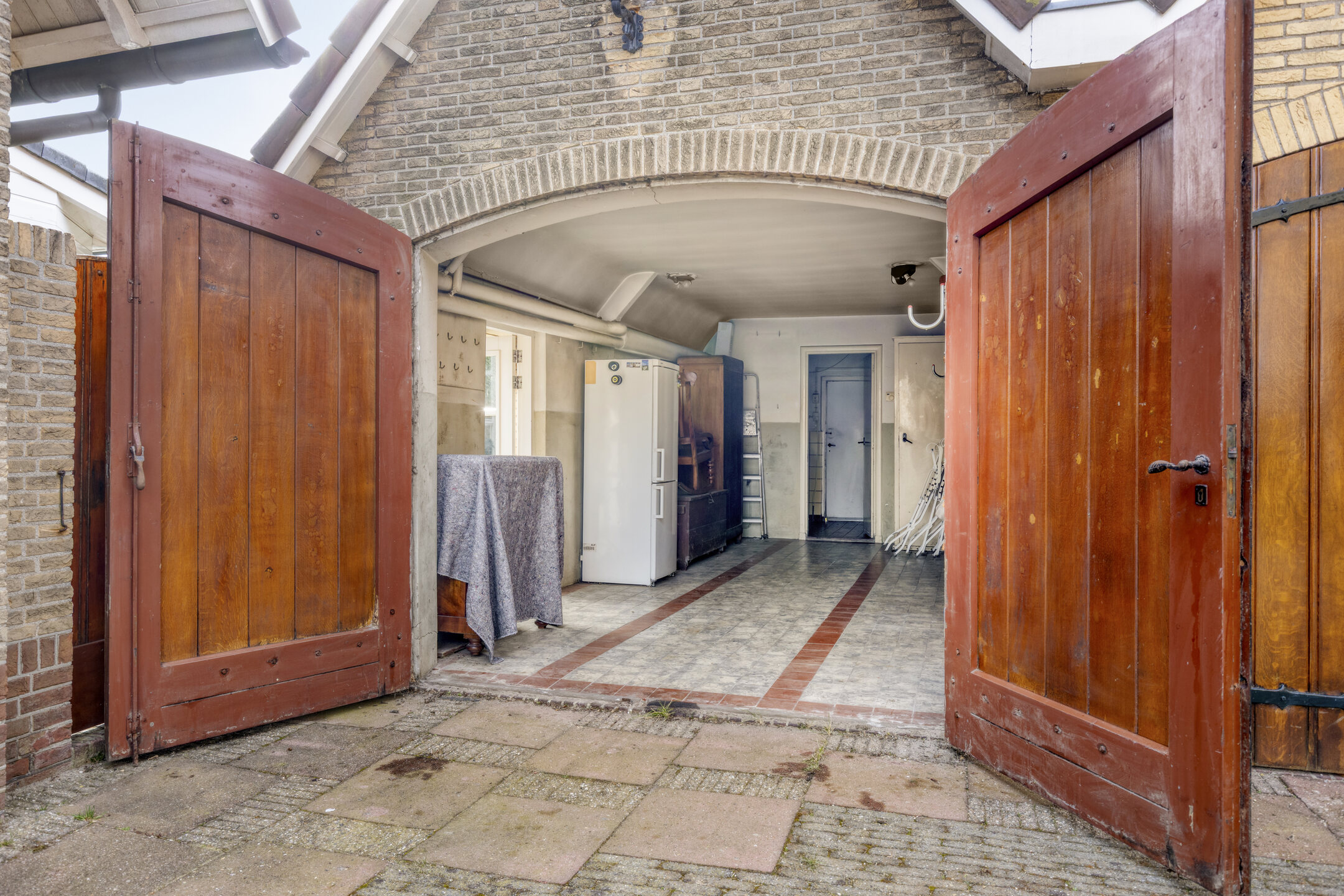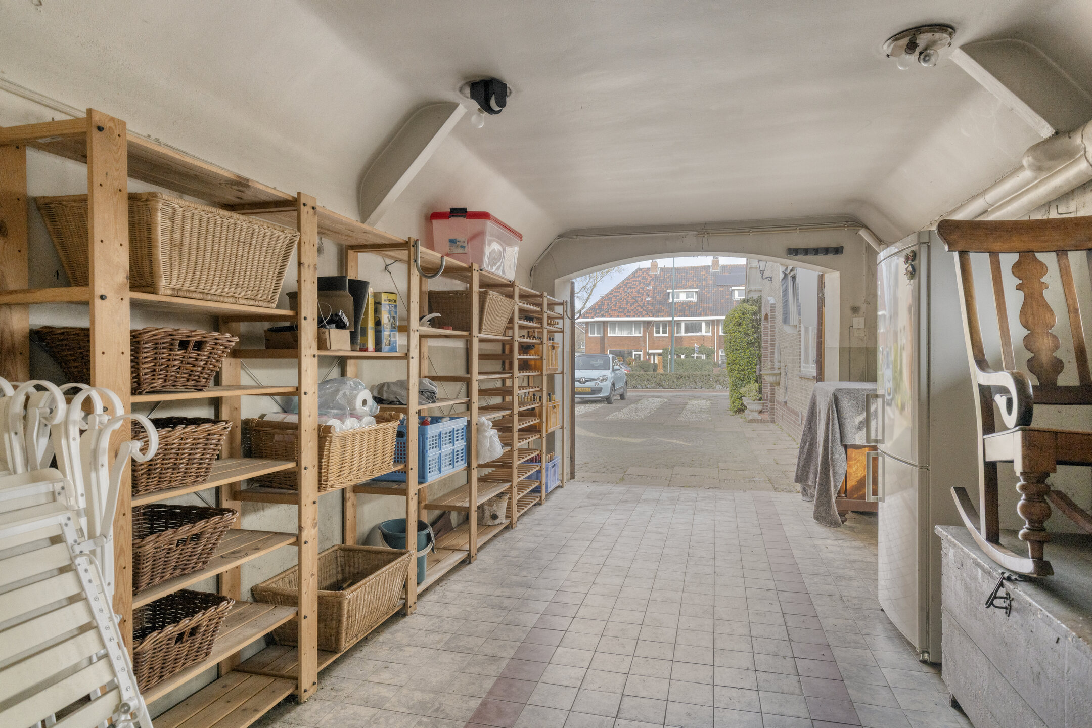 Diepe voortuin met oprit, waar voor meerdere auto’s plaats is. Er is een achterom tussen de woning en de garage.