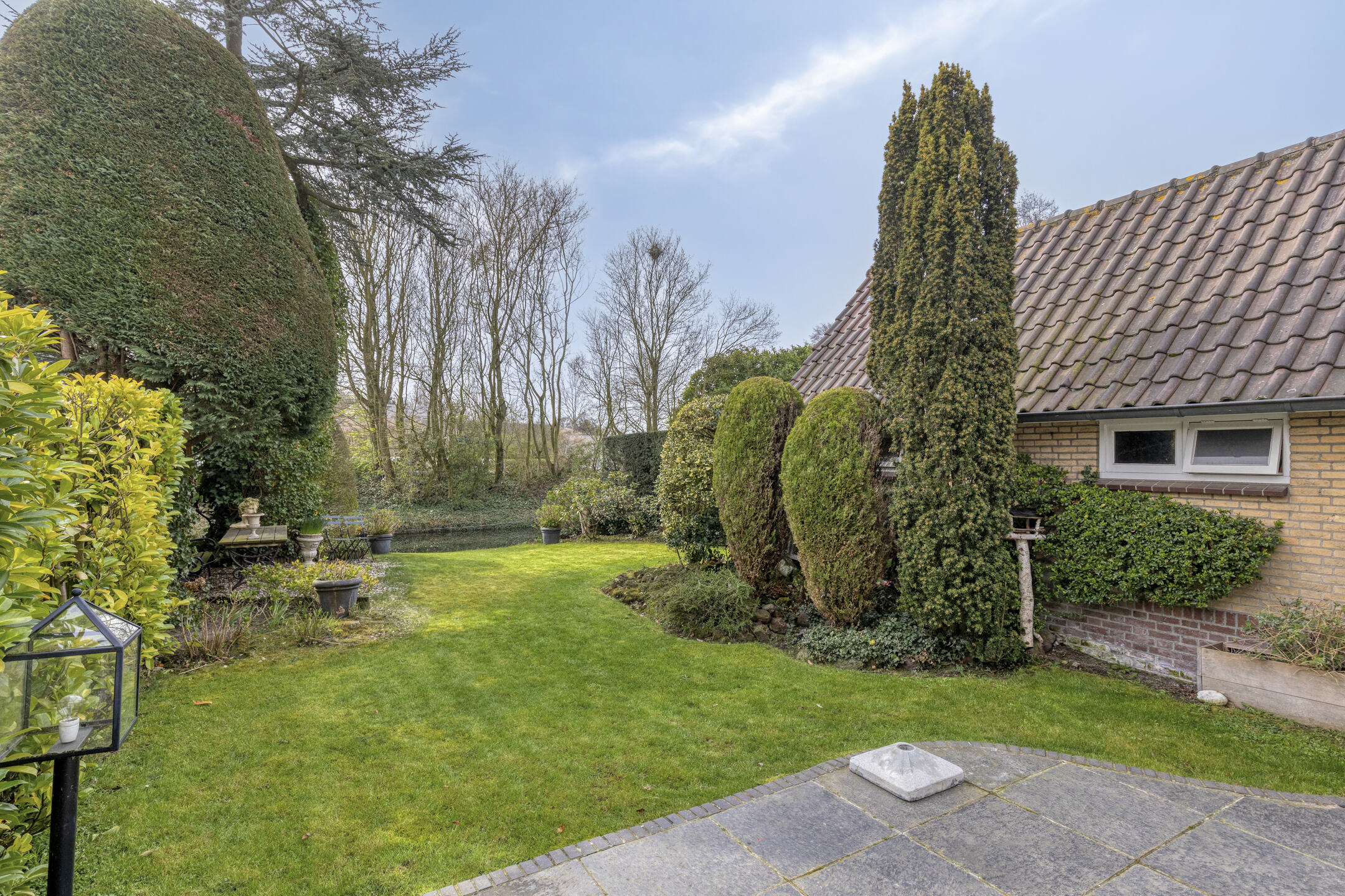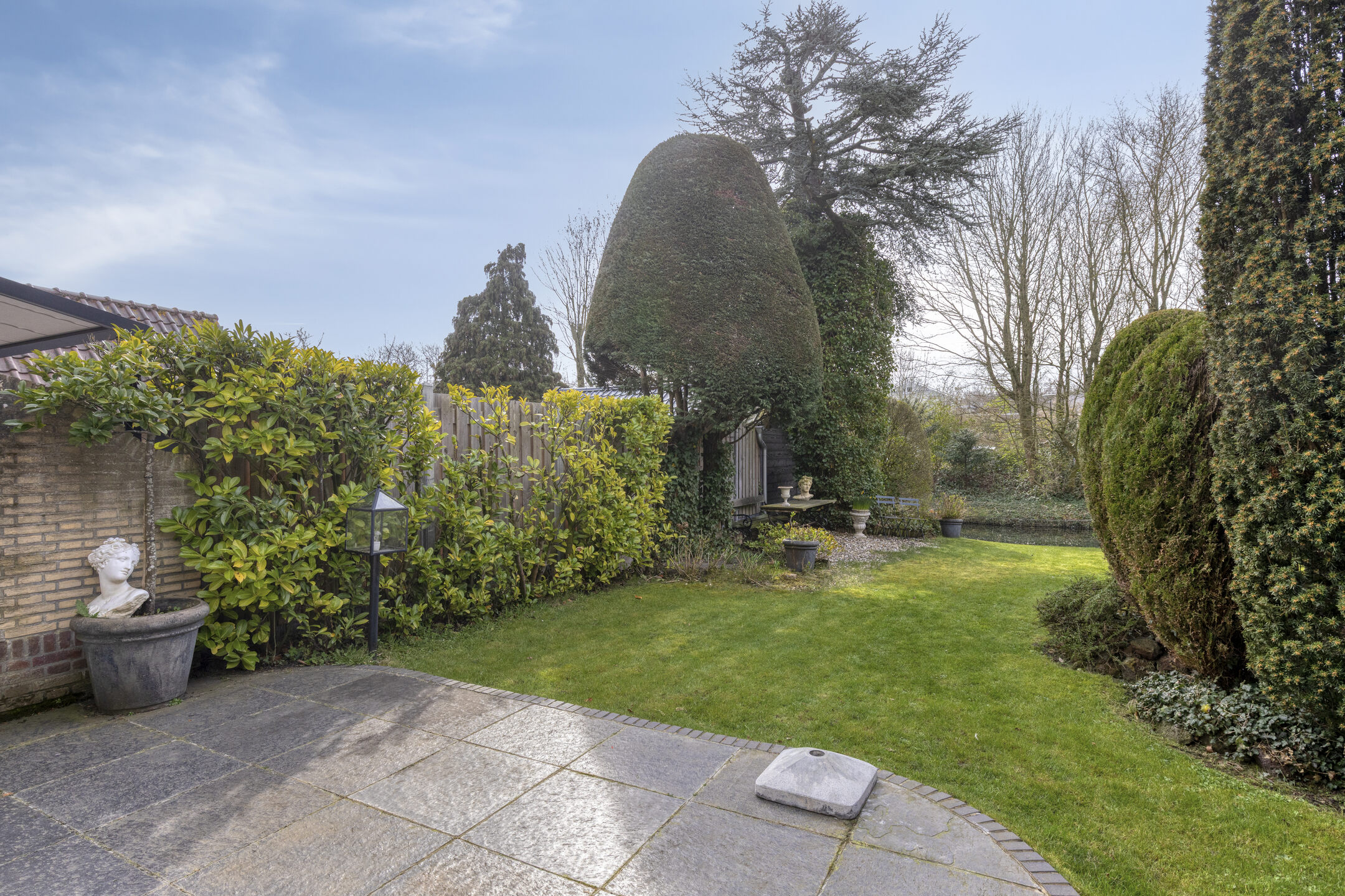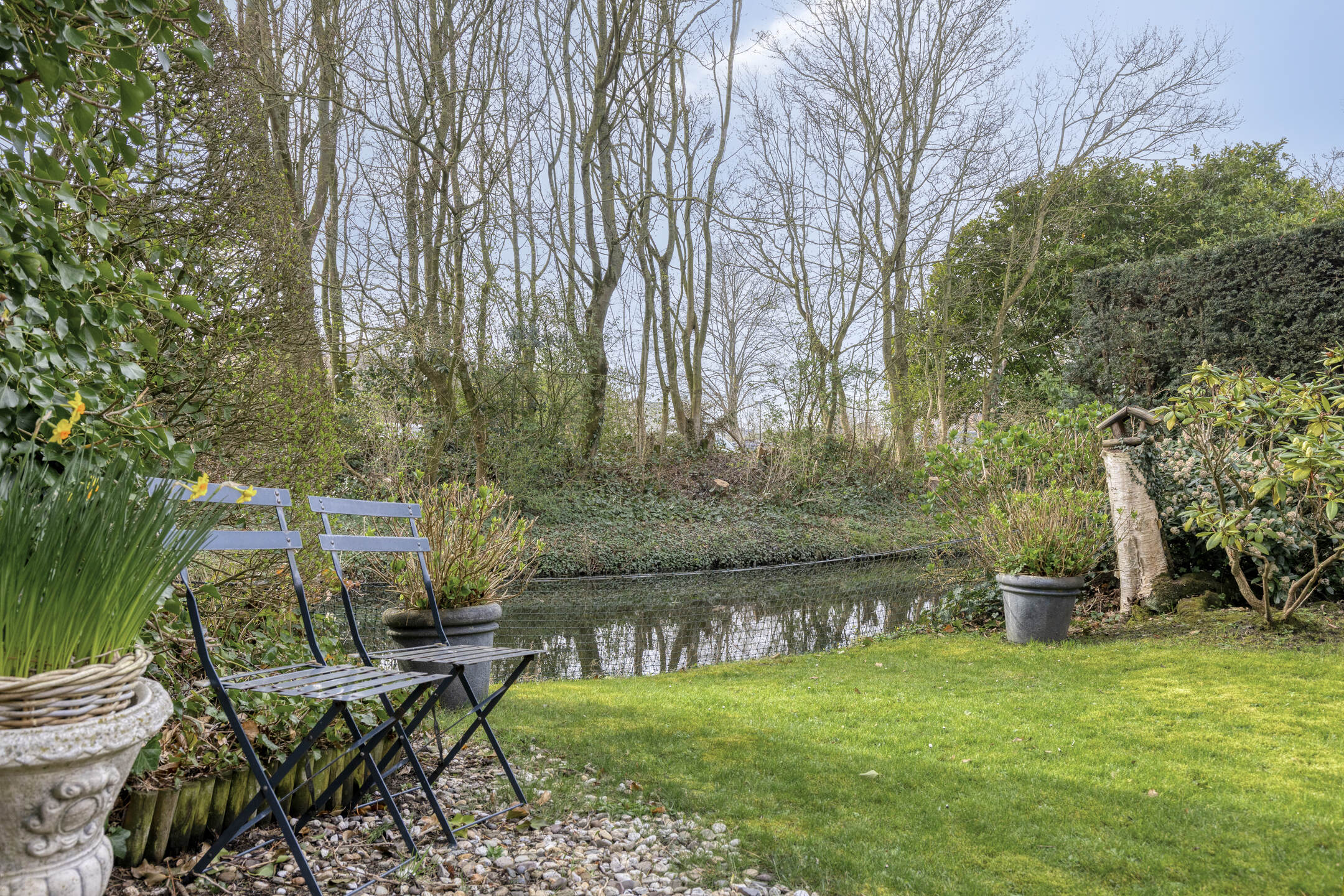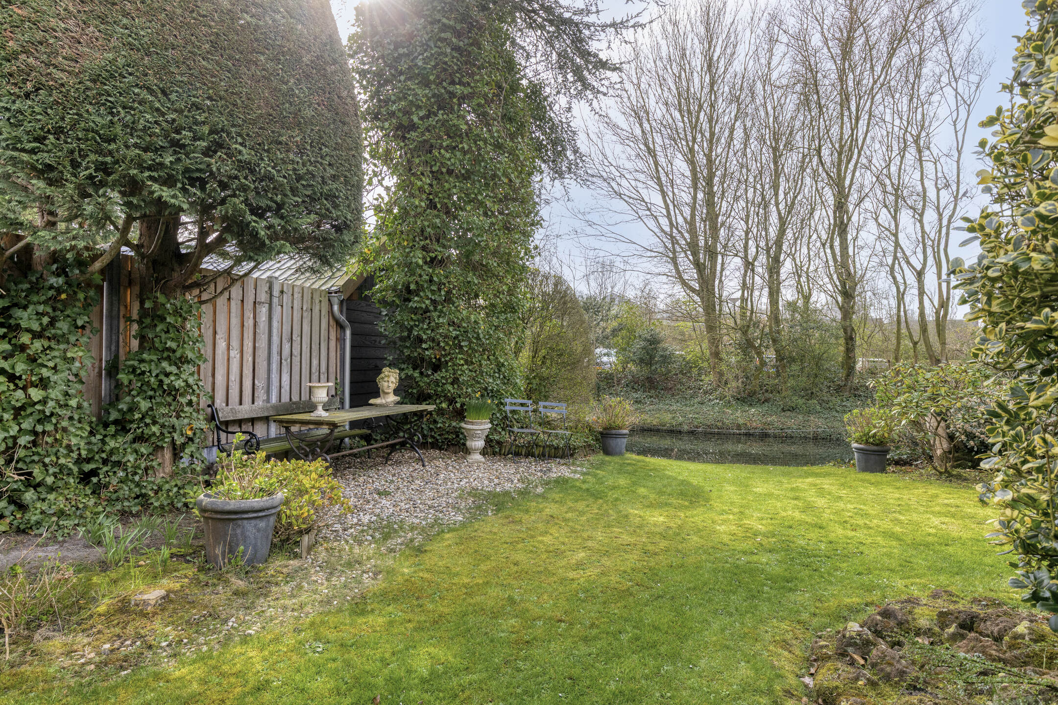 Diepe, brede en zeer beschutte achtertuin met ligging aan het water.