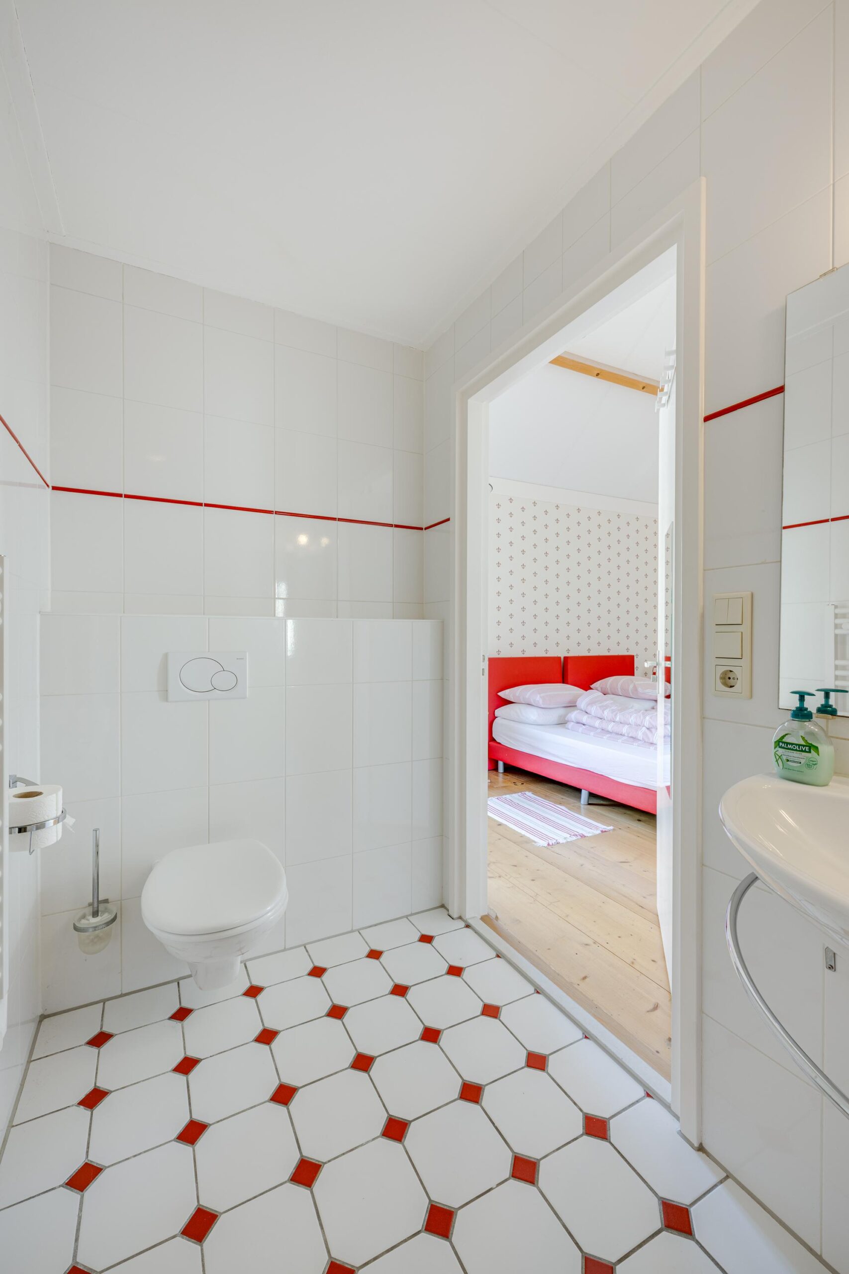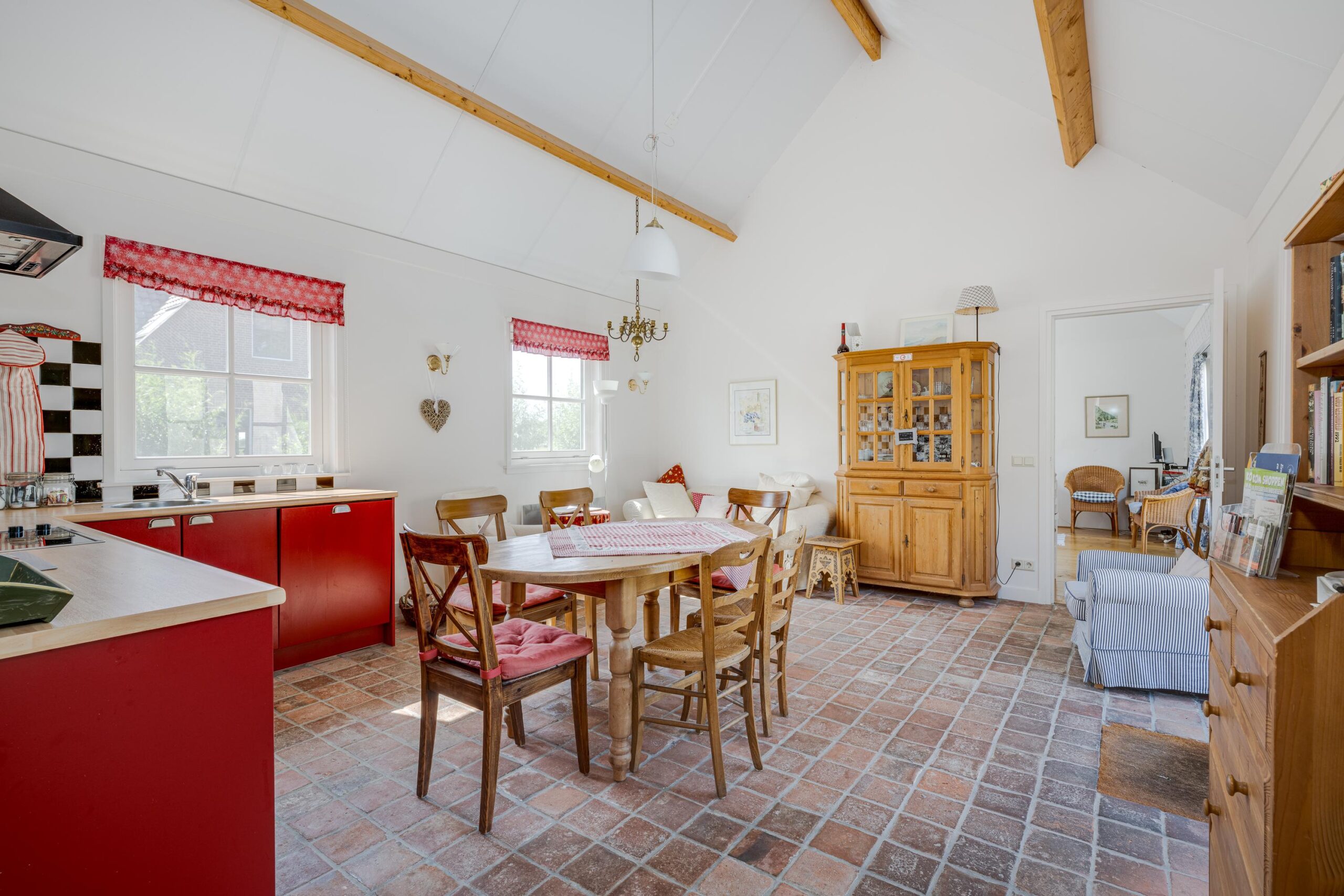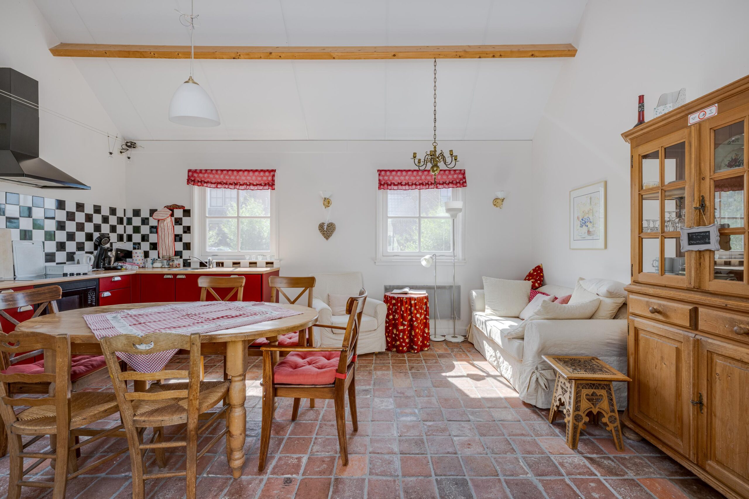 Indeling: je stapt binnen in de woonkamer annex keuken. Het hoge plafond en de fraaie plavuizen vloer dragen bij tot de landelijke sfeer van deze ruimte. Aan weerszijden van deze centrale ruimte bevinden zich de 2 ruime slaapkamers, ieder met een eigen volwaardige badkamer.